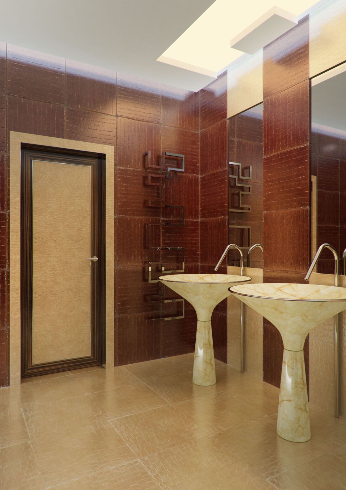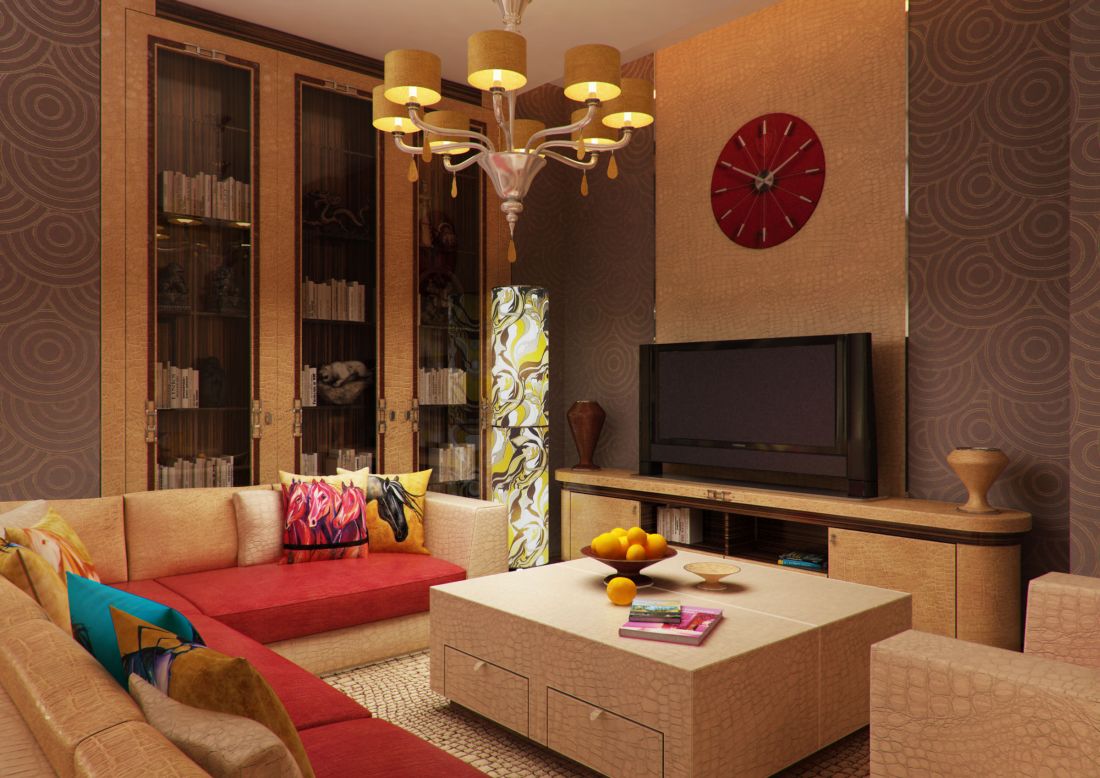 Неординарность и четко обозначенный характер интерьеру трехкомнатной квартиры придает обращение в декоре к экзотическим элементам, свойственным афро-стилю. Имитация кожи рептилии становится лейтмотивом всех трех комнат.