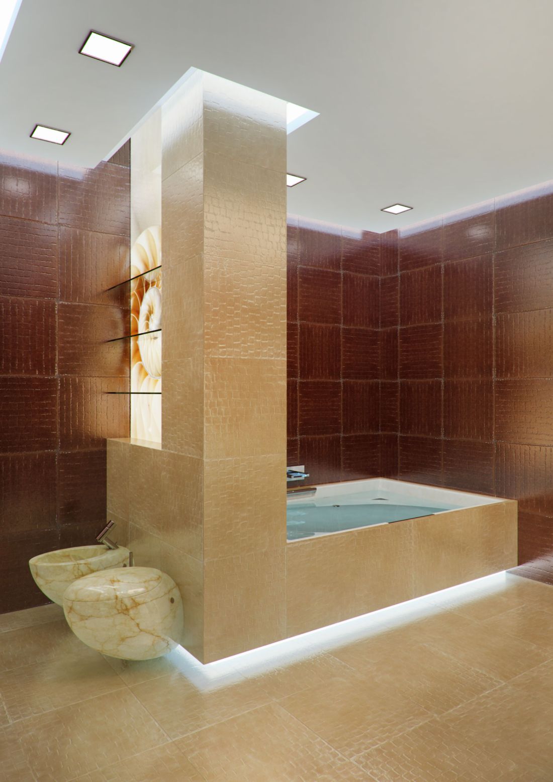 В зоне отдыха пол выложен плиткой, повторяющей рисунок из чешуек. Такой же фактурой отделана мебель: диванная группа и журнальный стол-тумба – и обои светло-кофейного оттенка, которыми выделена зона плазменной панели на стене.