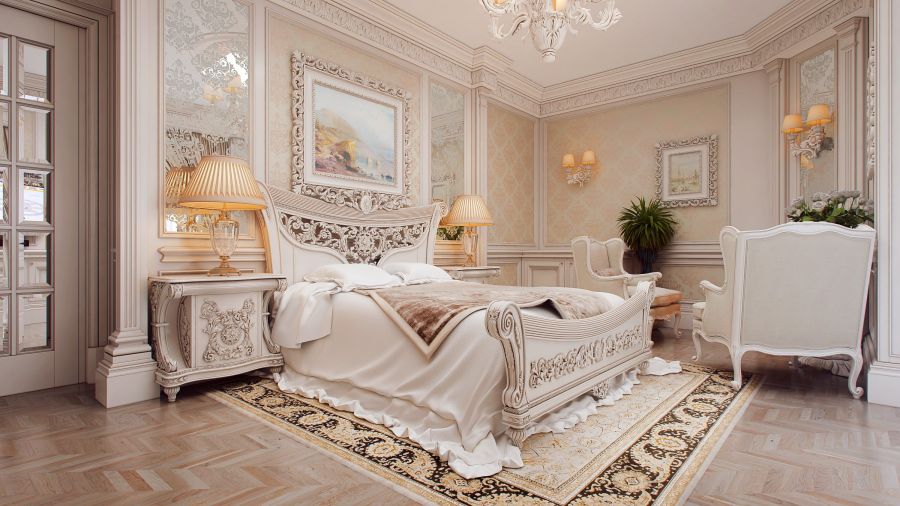 В мебели роскошный стиль интерьера не признает никаких имитаций вроде МДФ или ДСП, древесина – только естественного происхождения. Ручки из латуни, бронзы или другого металла с позолотой станут дополнительным украшением. Использованные в обрамлении зеркал, багетах, фоторамках, светильниках золотые или серебряные цветовые акценты придадут шик любому оформлению.