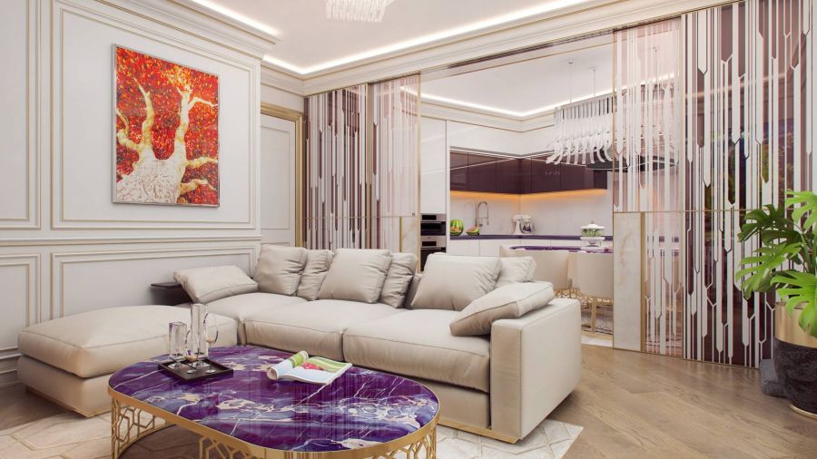 В роскошном современном интерьере 5-комнатной квартиры большая гостиная совмещается с кухней, образуя единое пространство в светлых тонах. Золотистый декор и белый рисунок раздвижных перегородок аккумулируют оформительские приемы обеих зон: золотые металлические акценты, геометрические орнаменты.