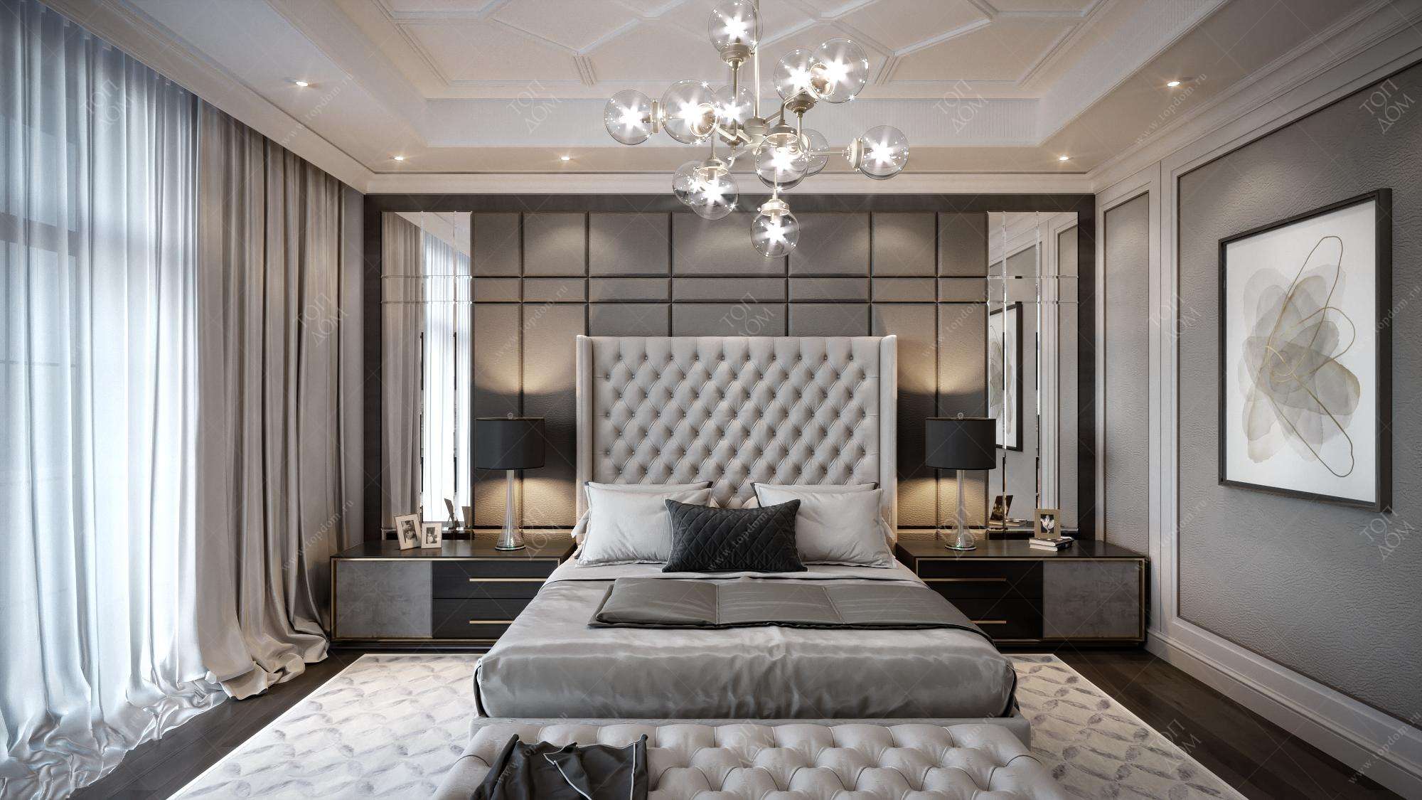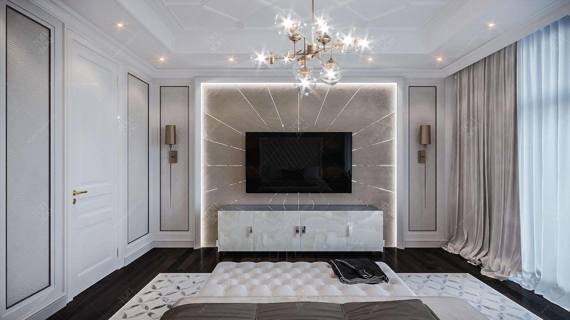 В концепции оформления интерьеров частного дома спальная комната выдержана в серо-белой гамме. Нарядной и очень уютной ее делают декоративные фактуры в отделке стен и ТВ-зоне, композиция из текстильных и зеркальных панелей за изголовьем кровати, темно-коричневый деревянный пол.