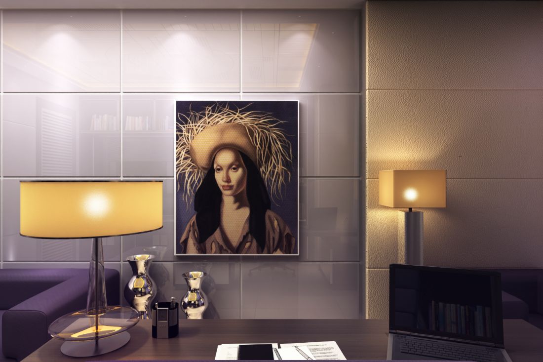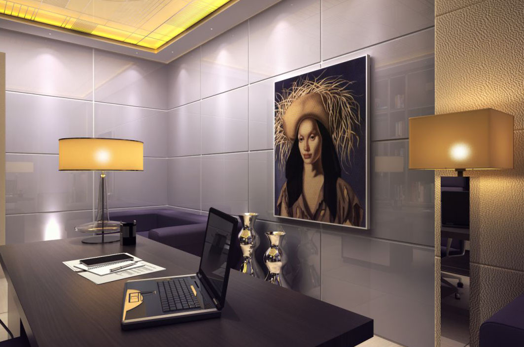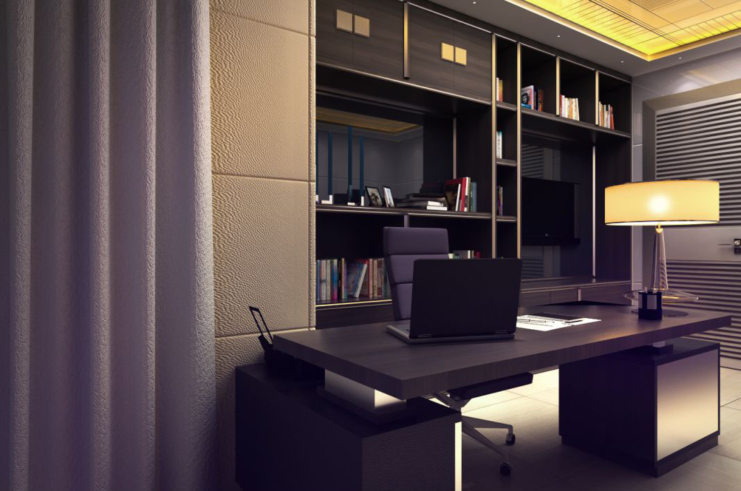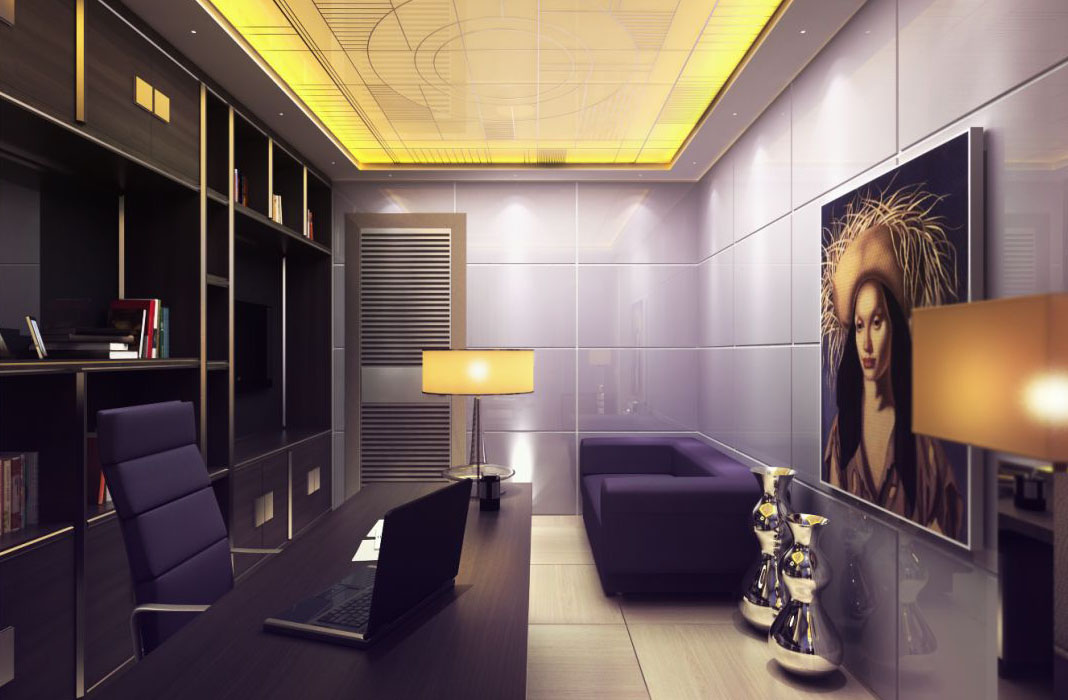Дизайн кабинета выполнен в серо-фиолетовых оттенках и больше тяготеет к минималистичному убранству. Более насыщенные краски сосредоточены в отделке мягкой мебели, стены выдержаны в светлых тонах. Темно-коричневые шкафы и стол привлекательно контрастируют с настенными панелями – фактурными золотистыми и глянцевыми серыми. Желтый витражный потолок с геометрическим рисунком и встроенными светодиодами наполняет рабочую комнату теплым и комфортно рассеянным светом.