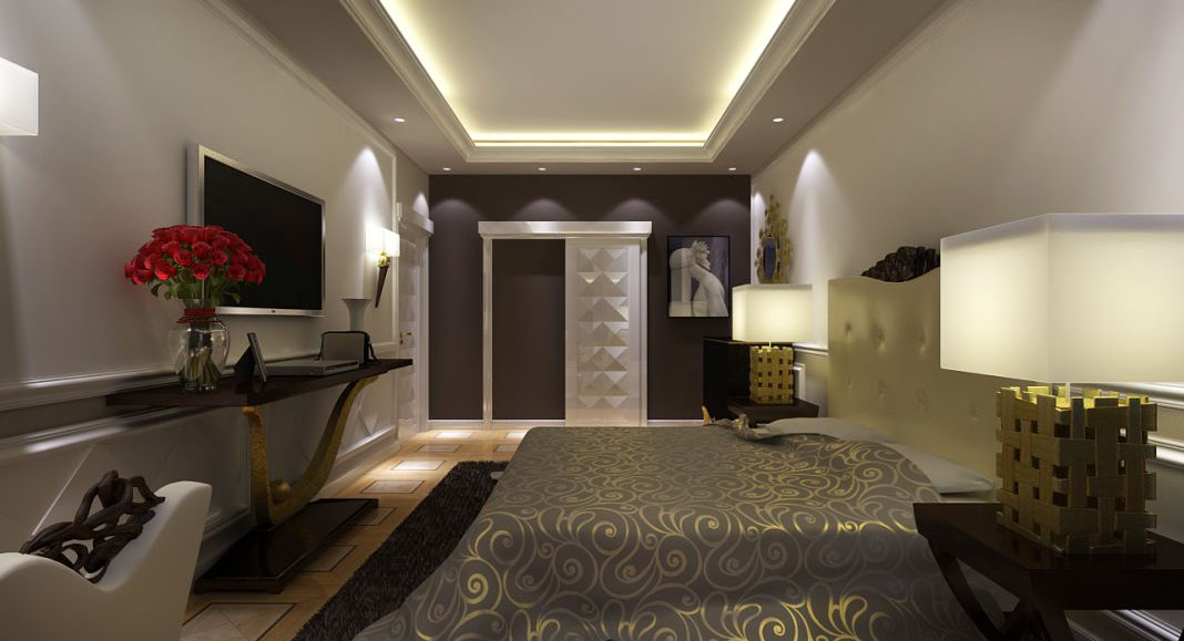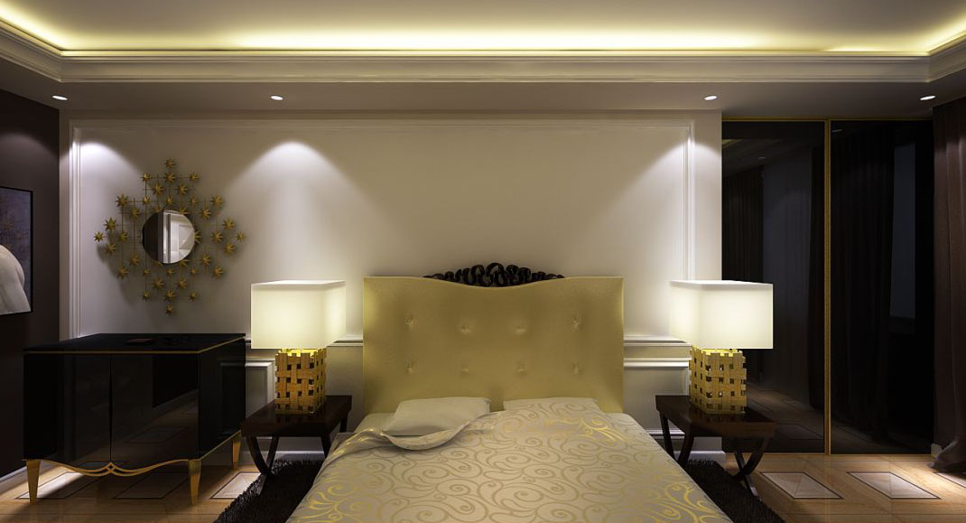 В роскошном интерьере квартиры спальная комната тоже получила дорогое оформление. Золотистый декор присутствует в отделке светильников, пристенной консоли, комода, круглого настенного зеркала. Изящные кованые элементы украшают кроватное изголовье и спинку стула в зоне туалетного столика.