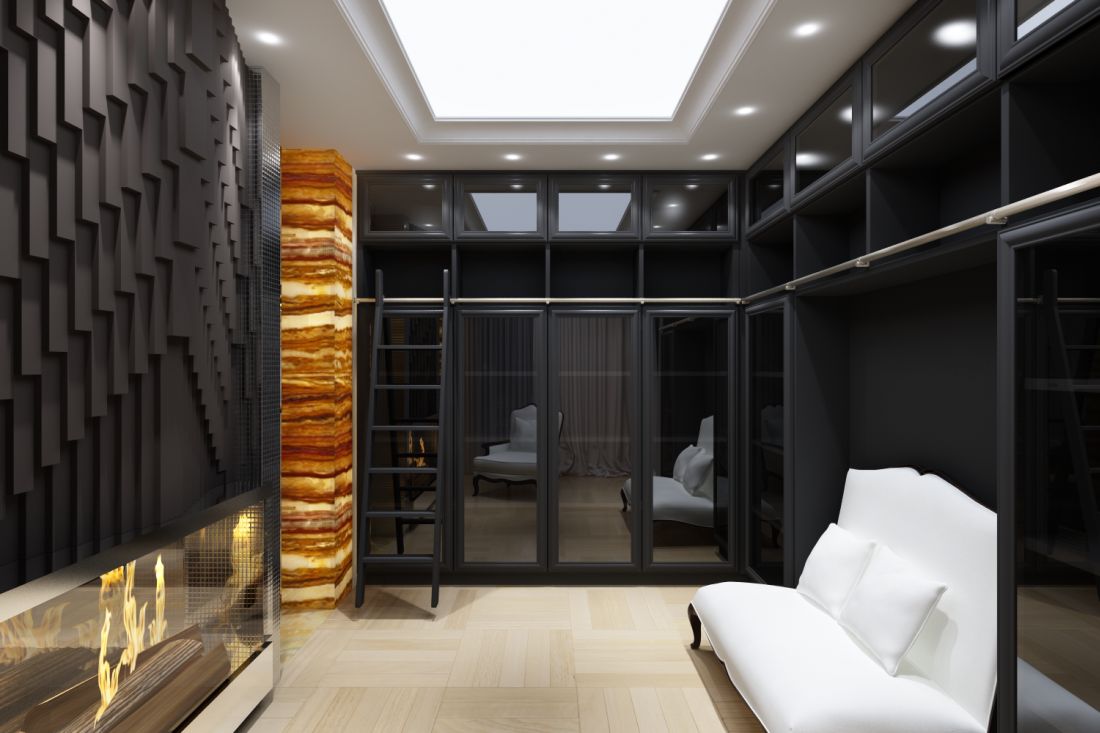 Просторное помещение можно использовать не только для хранения вещей во вместительных шкафах, но и как место уединенного отдыха перед камином. Цветовой контраст с белым диваном создают черные мебельные системы и рельефный декор над каминным порталом – он такой же, как в гостиной, только в темном исполнении.