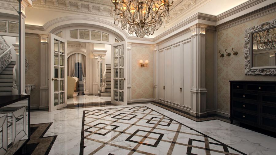 в просторной прихожей пол облицован серо-белым мрамором с акцентным геометрическим рисунком;