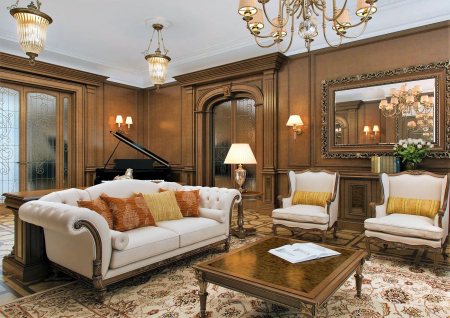 Интерьеры в стиле классики отличаются дорогой отделкой поверхностей.