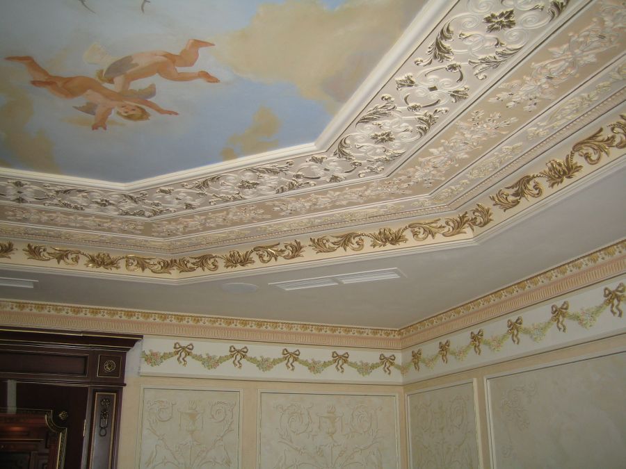 потолочную роспись обрамляют полосы декоративной лепнины в связке с широким настенным фризом.