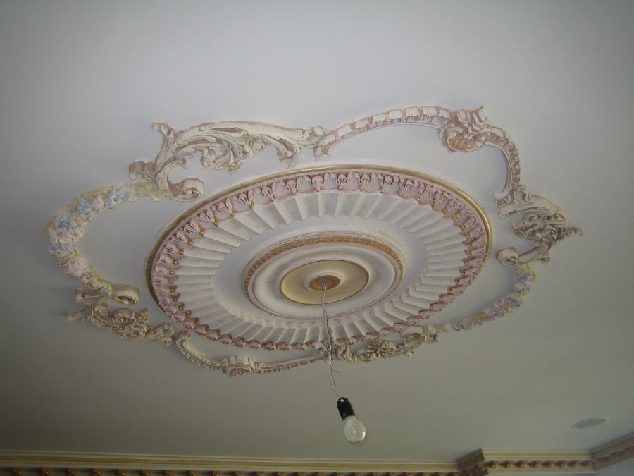 для люстр выполнены патинированные розетки с цветочными гирляндами;