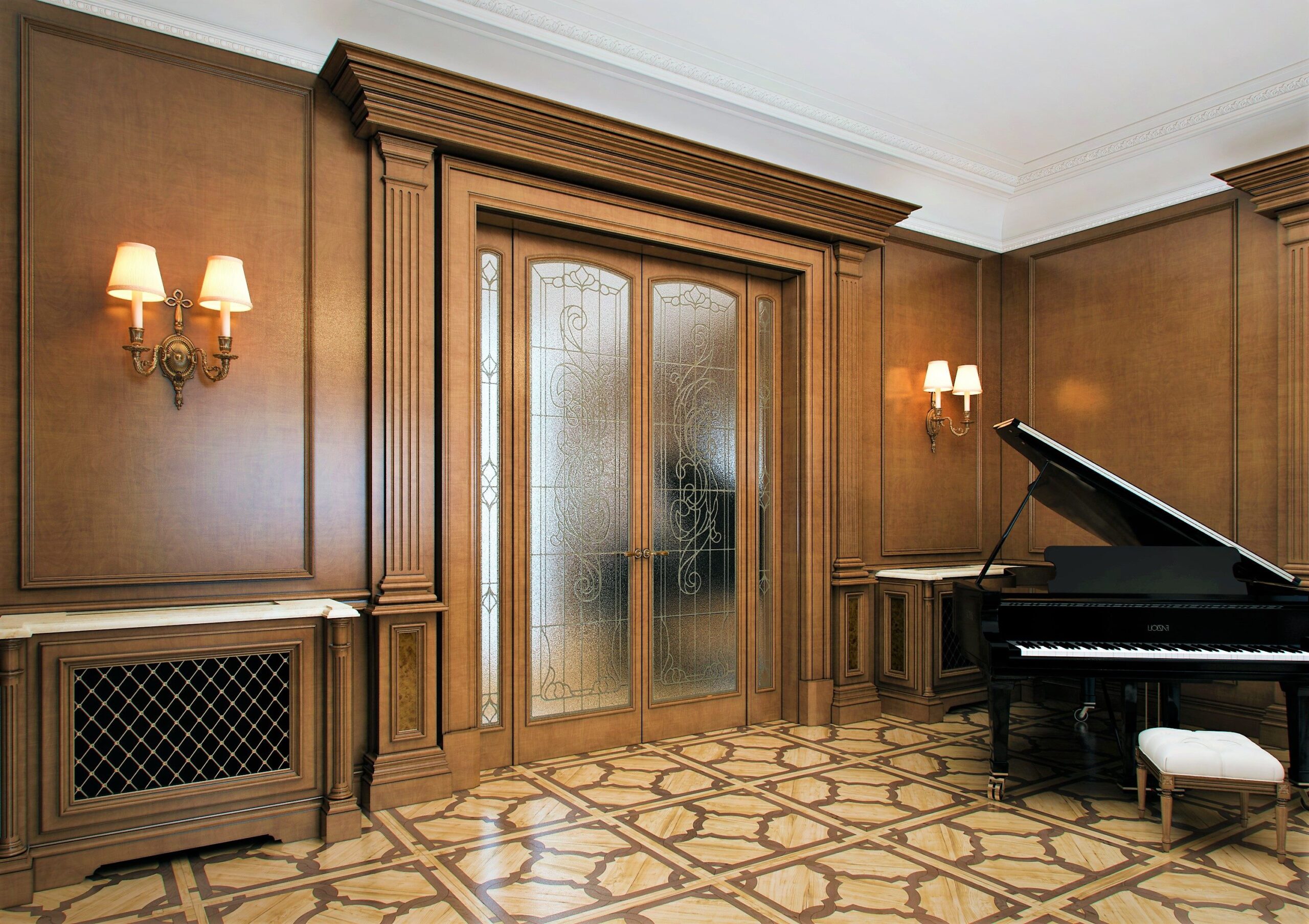 Межкомнатные проходы выполнены в форме многослойных арок из древесного массива и щедро украшены симметричными резными деталями (пилястрами, карнизами, перемычками). Золотистый узор на застекленных распашных дверях органично дополняет декор стен в гостиной в классическом стиле. Элегантную отделку панелями буазери поддерживают ореховые оттенки тумб, журнальных столиков, пристенных полукруглых консолей, фасады книжных шкафов.