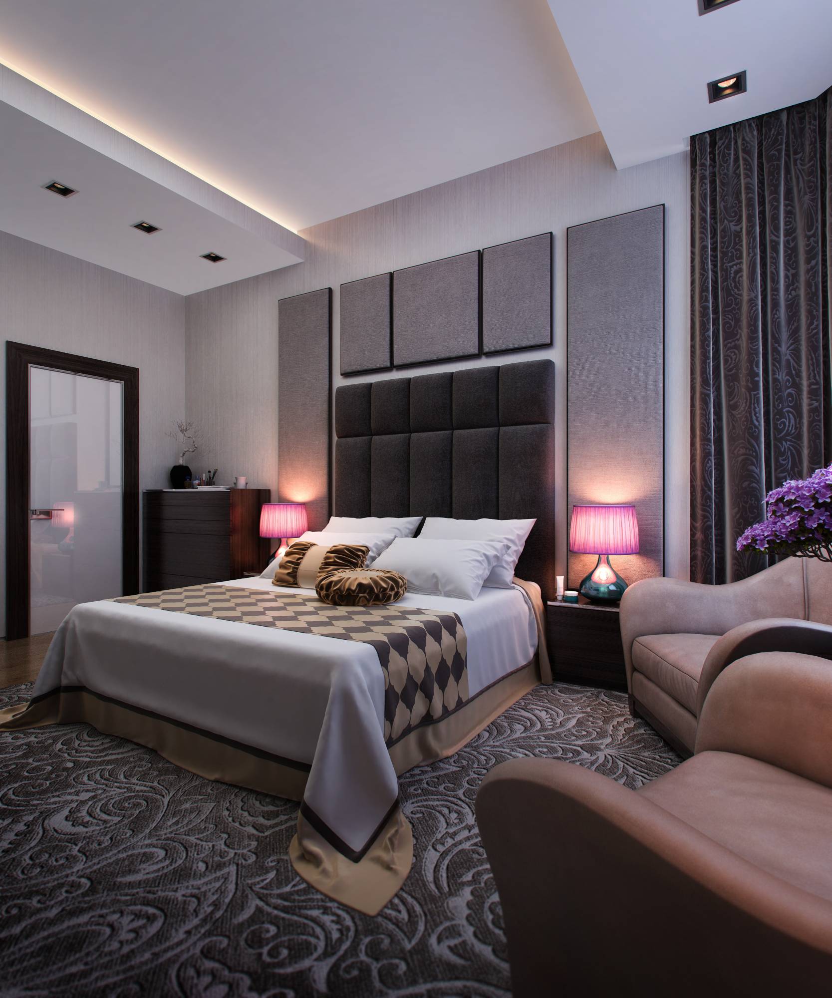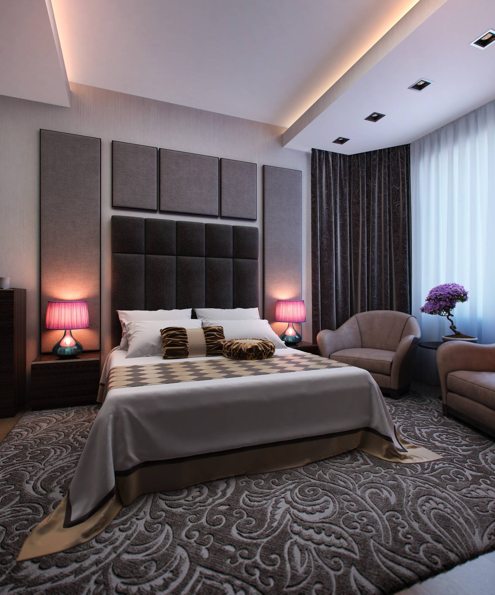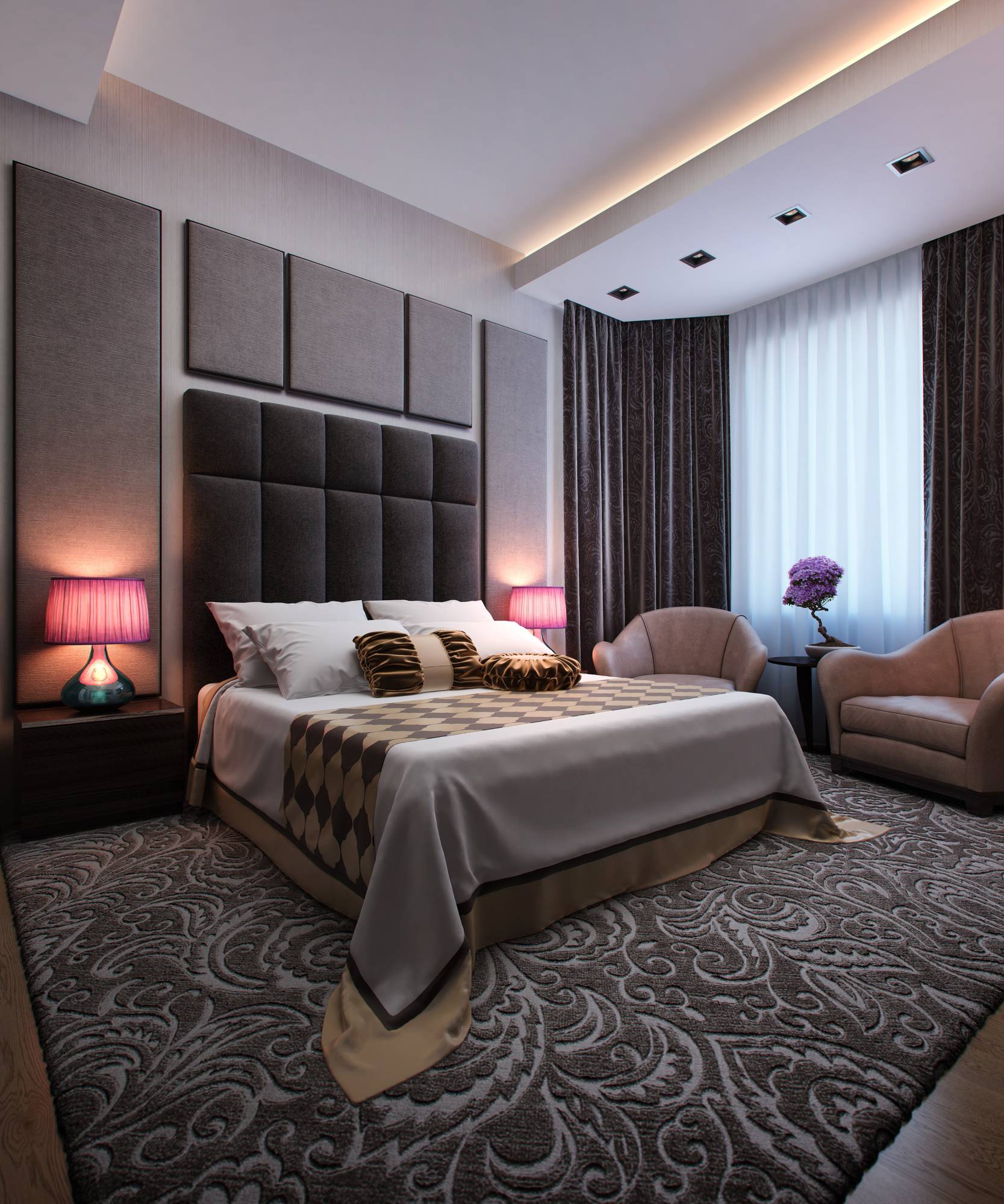 В оформлении дизайна спальной комнаты в трехкомнатной квартире теплые коричневые оттенки дополнены нейтральными серыми – в декоре изголовья кровати.
