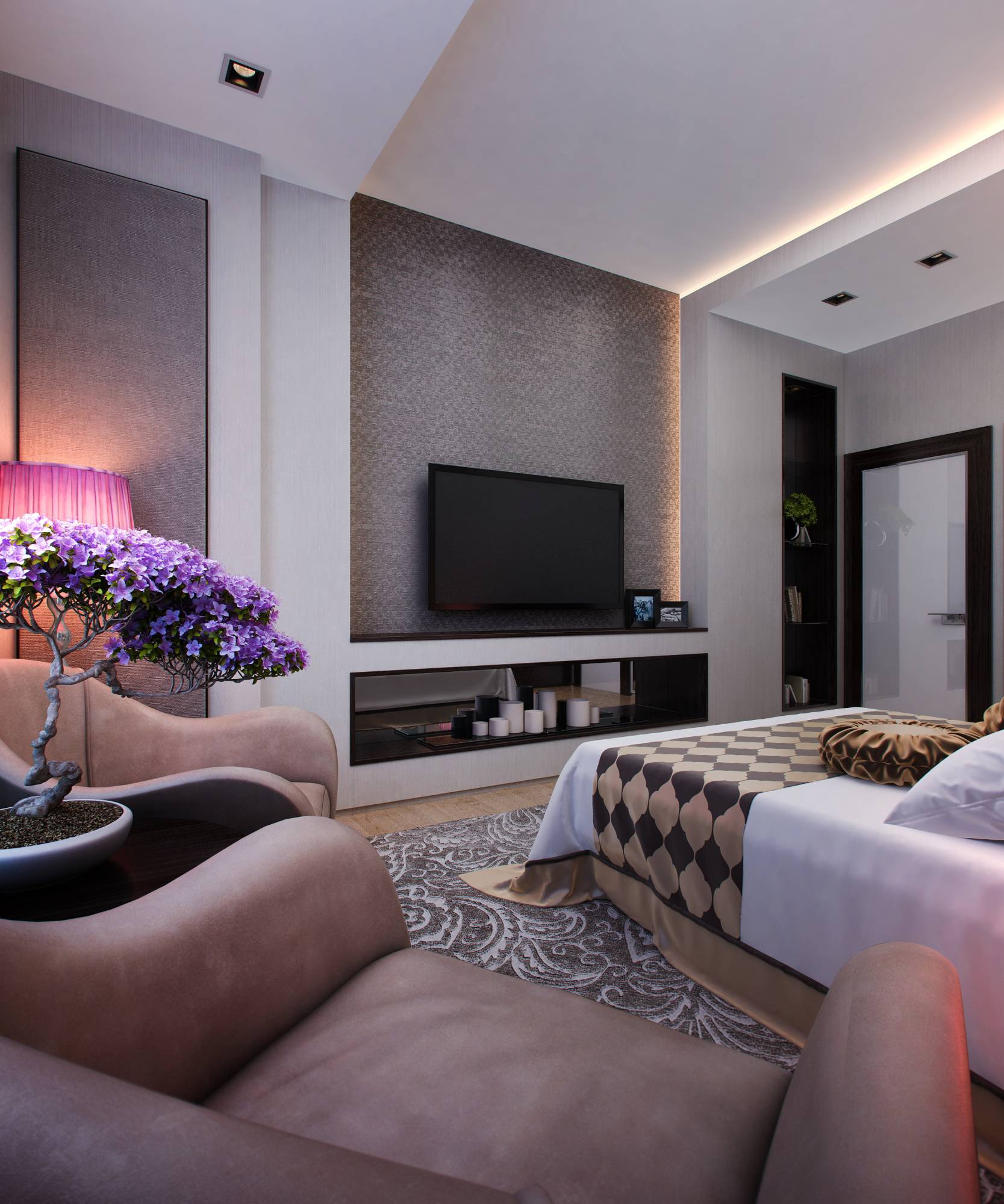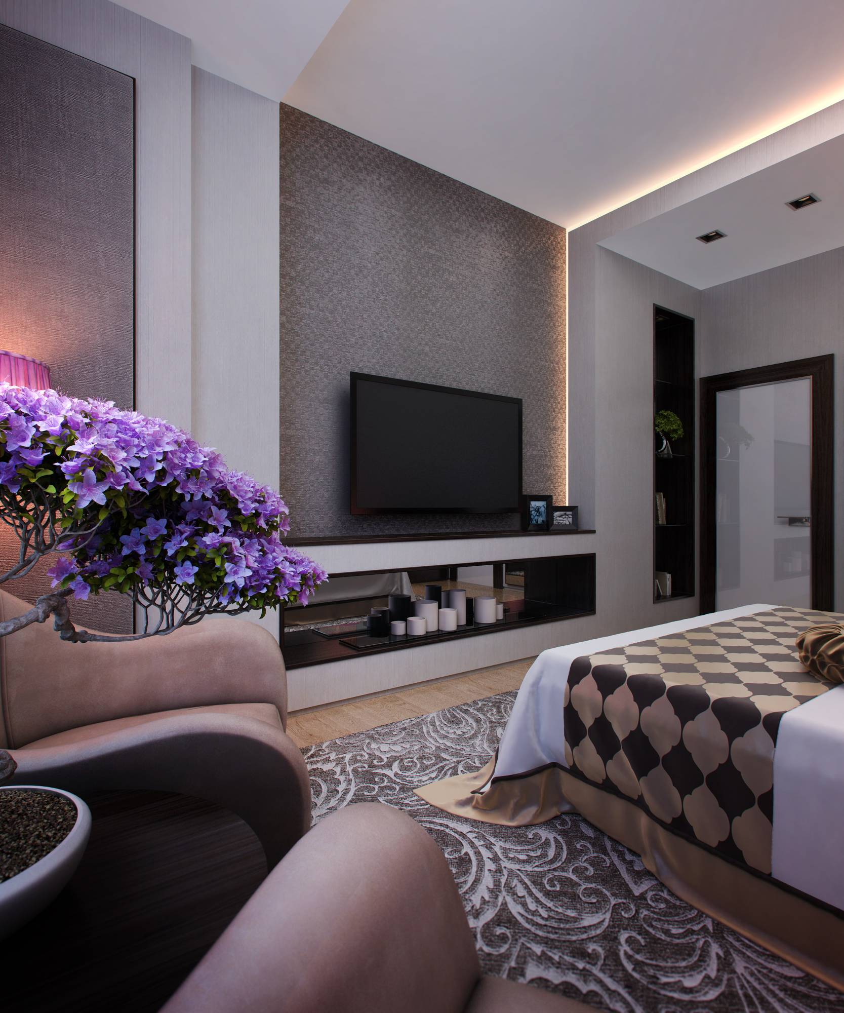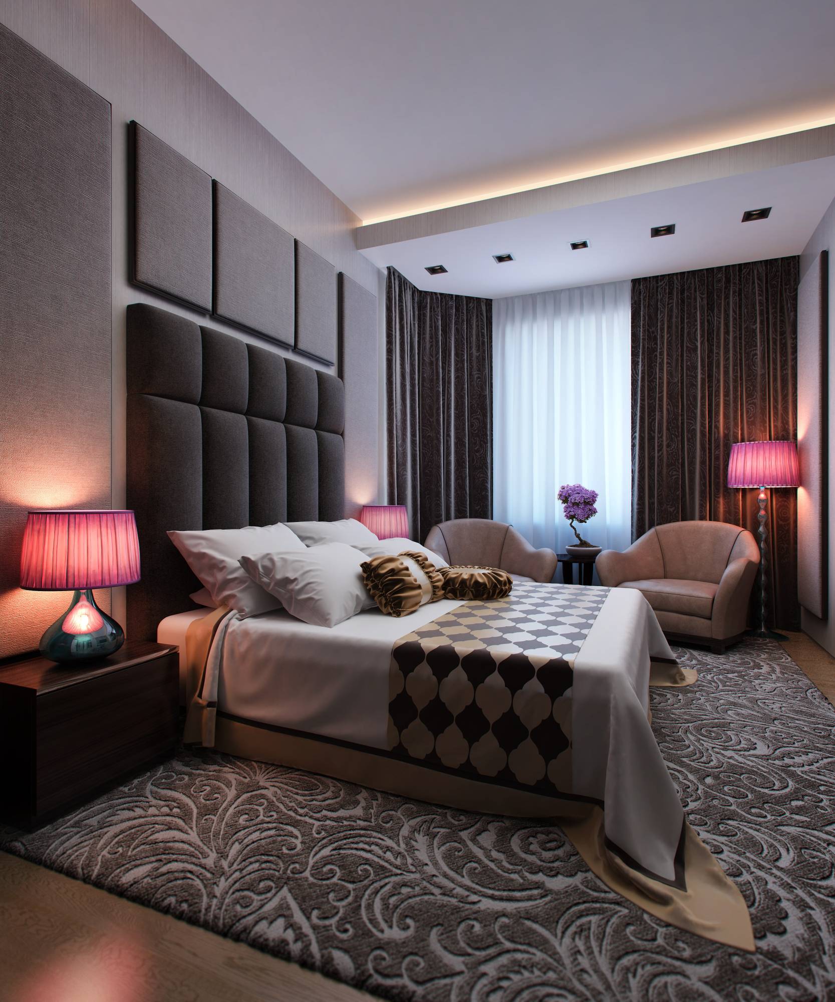 В оформлении дизайна спальной комнаты в трехкомнатной квартире теплые коричневые оттенки дополнены нейтральными серыми – в декоре изголовья кровати.