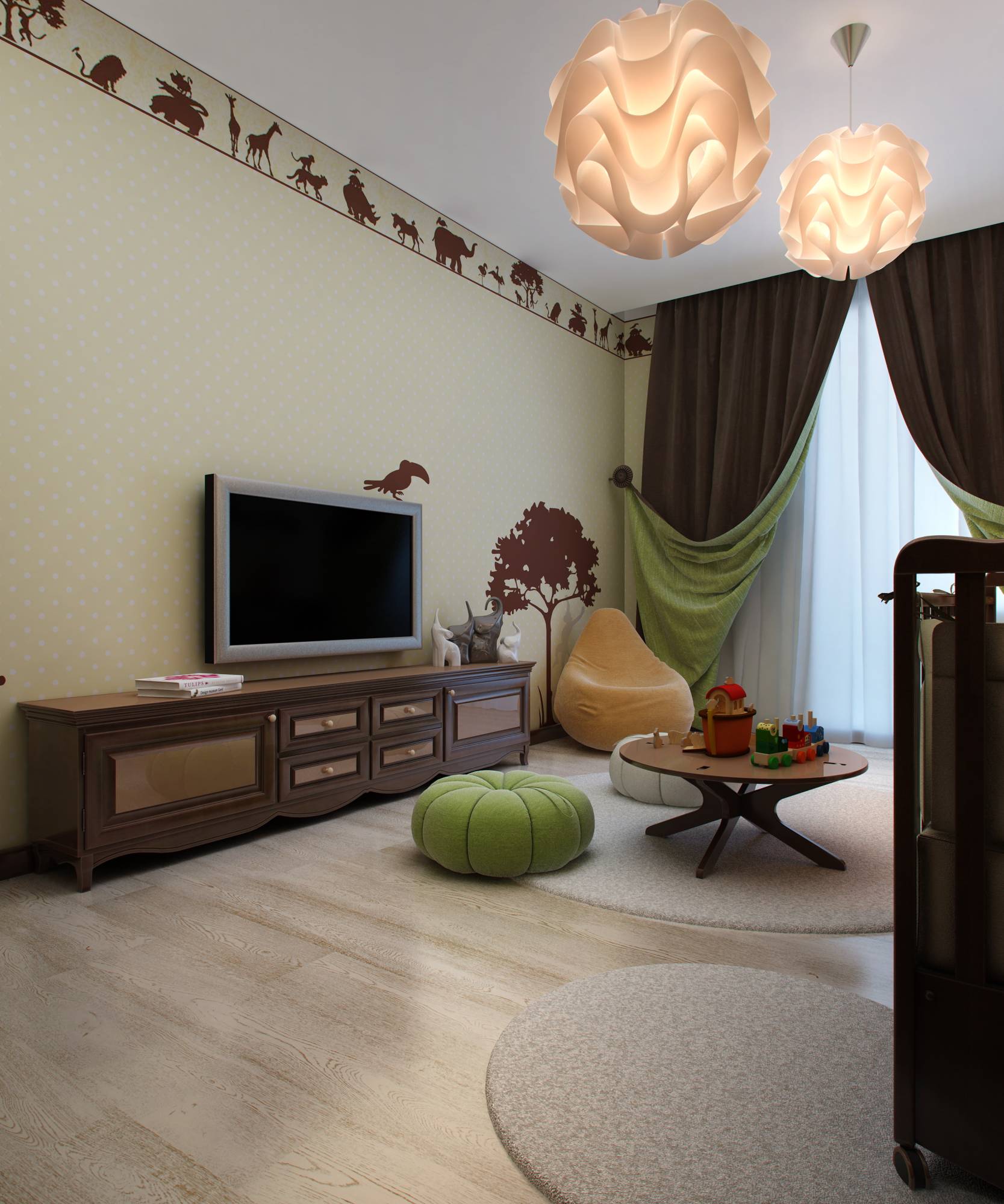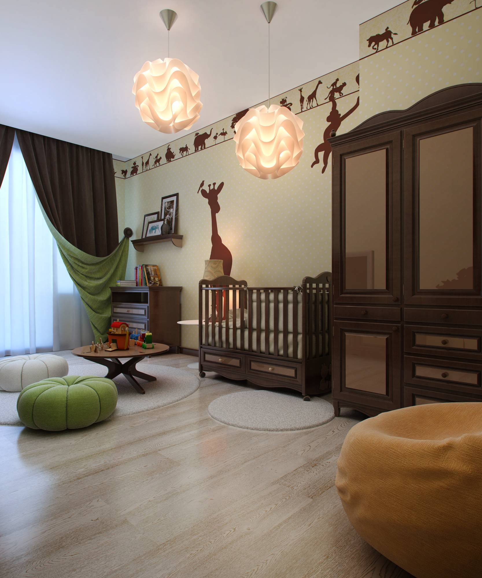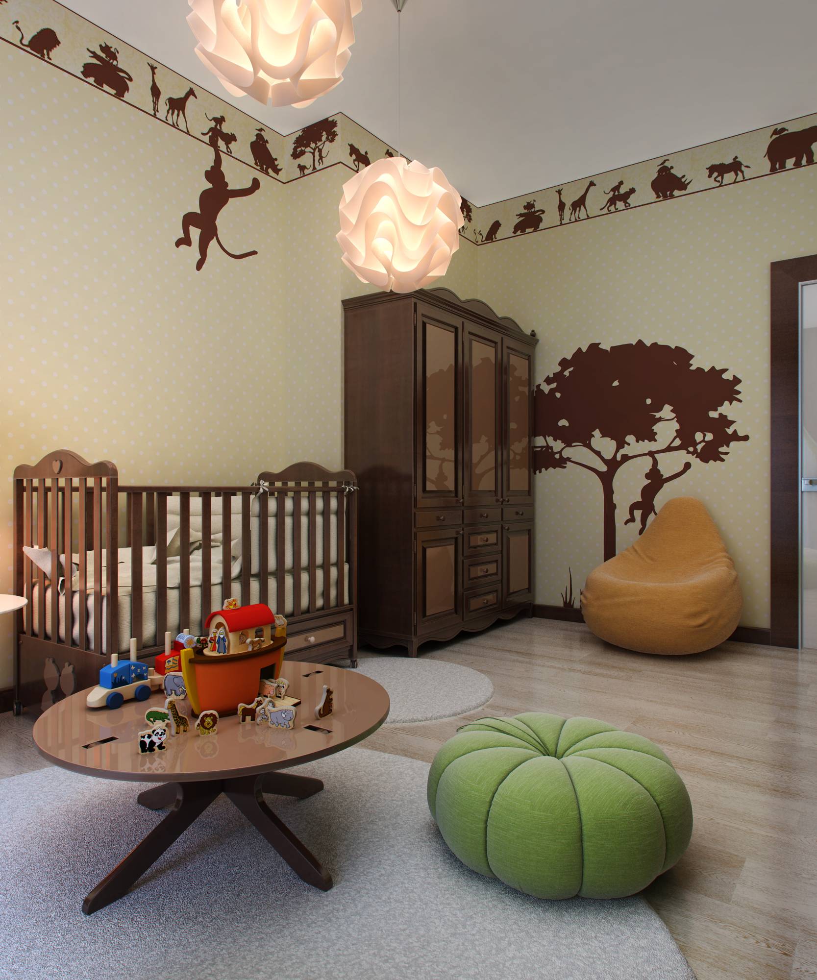 В спокойной песочной гамме выполнен и интерьер детской, с очень взвешенным использованием более ярких красок в деталях. На стенах – обои с аппликацией на тему африканской природы, вместо традиционных стульев – удобные и забавные пуфы в форме тыквы, кресло-мешок.