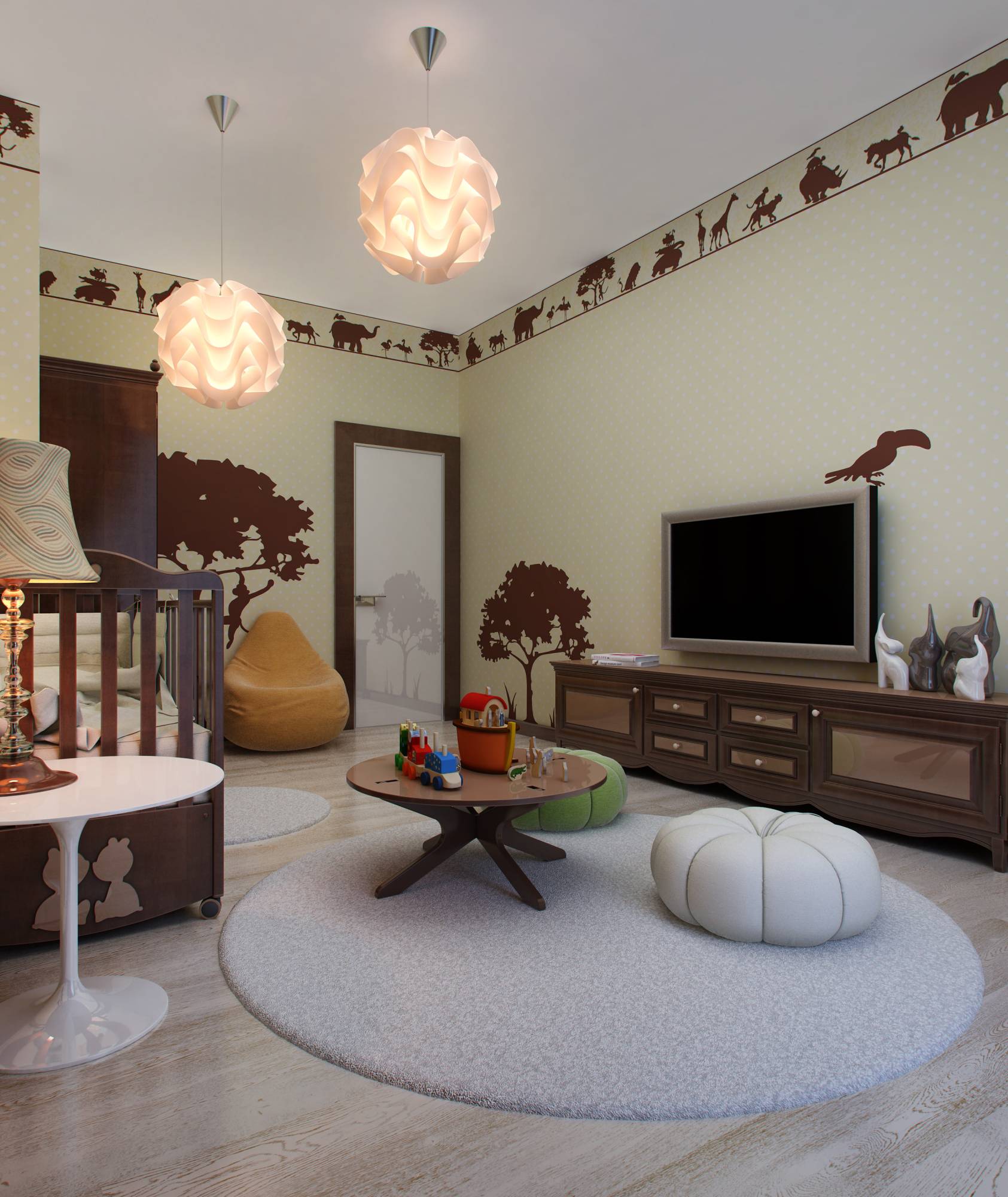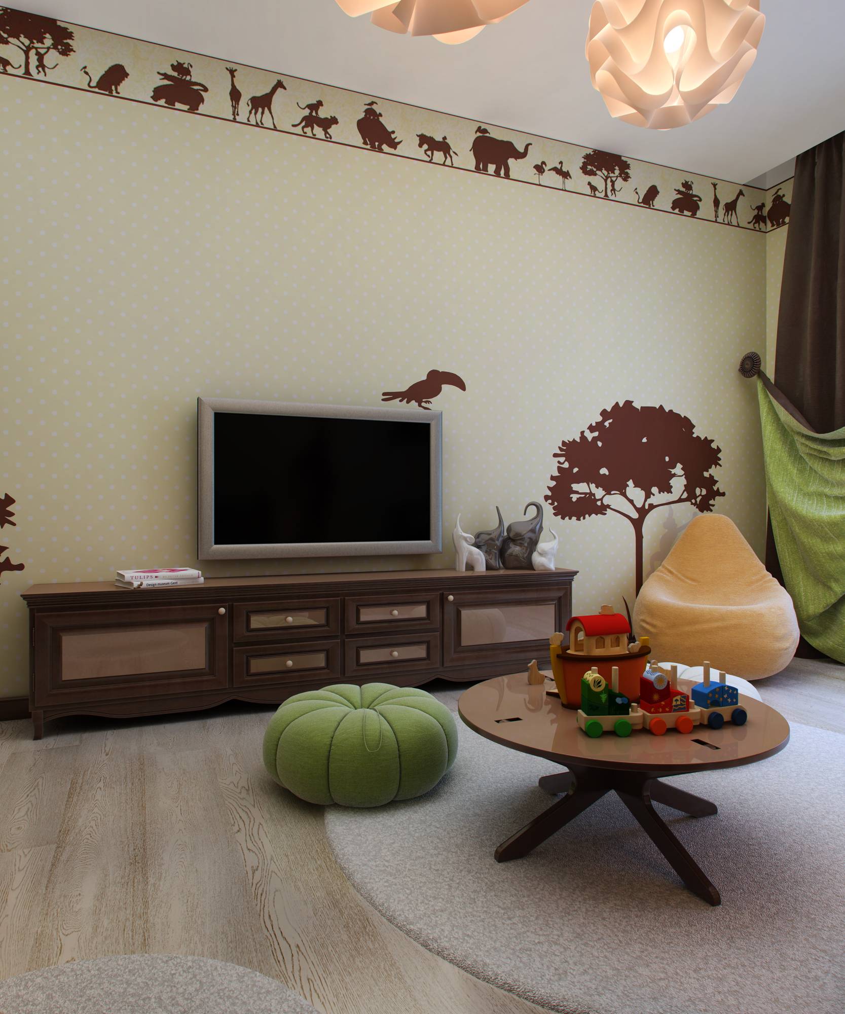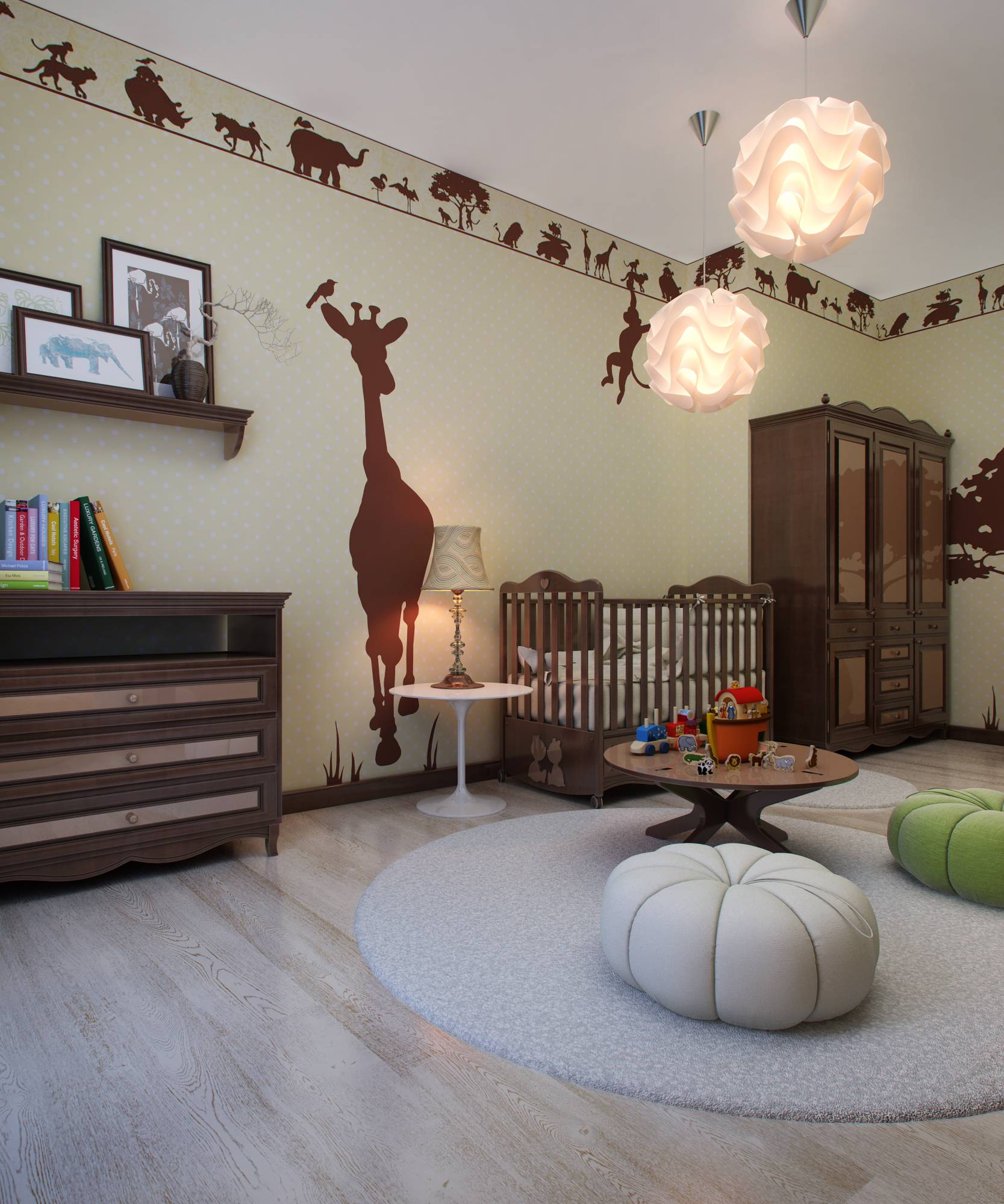 В спокойной песочной гамме выполнен и интерьер детской, с очень взвешенным использованием более ярких красок в деталях. На стенах – обои с аппликацией на тему африканской природы, вместо традиционных стульев – удобные и забавные пуфы в форме тыквы, кресло-мешок.