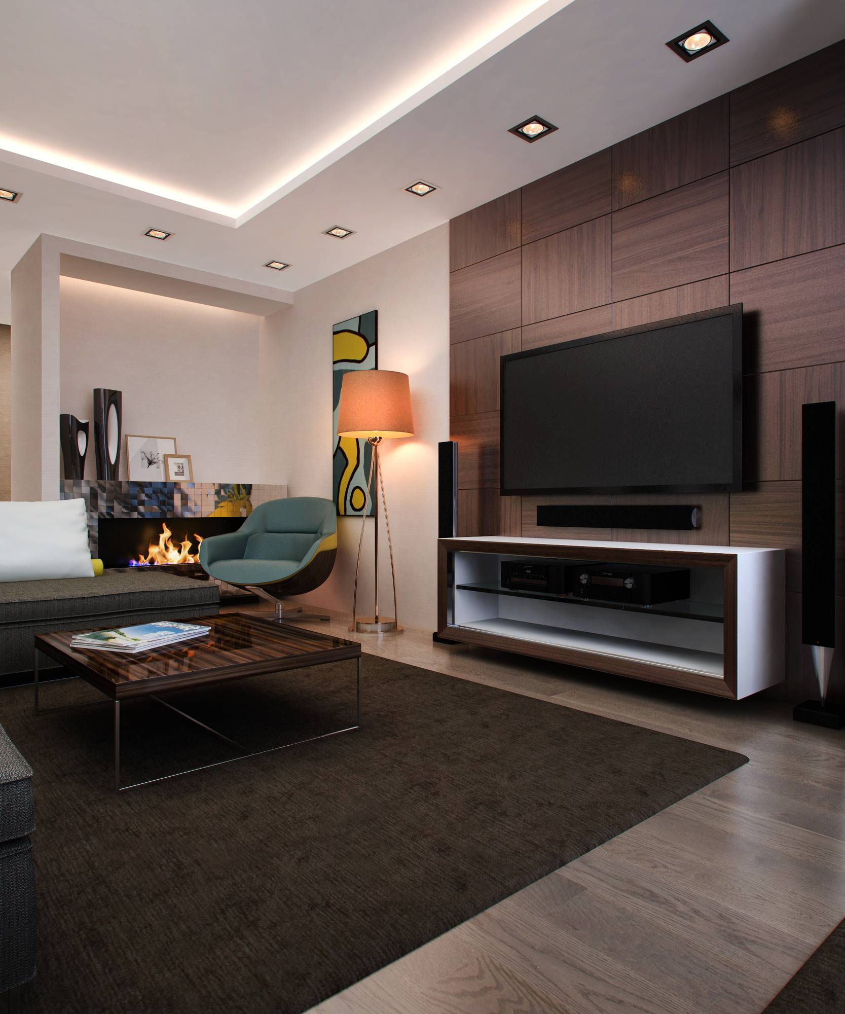 Шпонированными панелями более темного тона облицована стена ТВ-зона в гостиной. Их дизайн повторяет журнальный столик. В углу гостиной разместился камин, вполне уместный в окружении современных лаконичных форм.