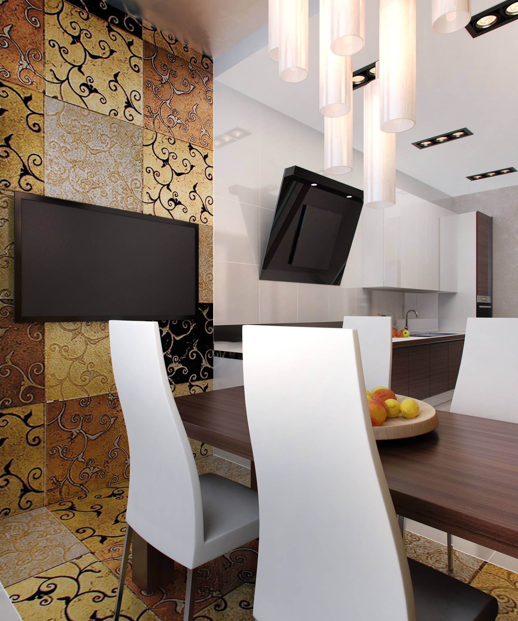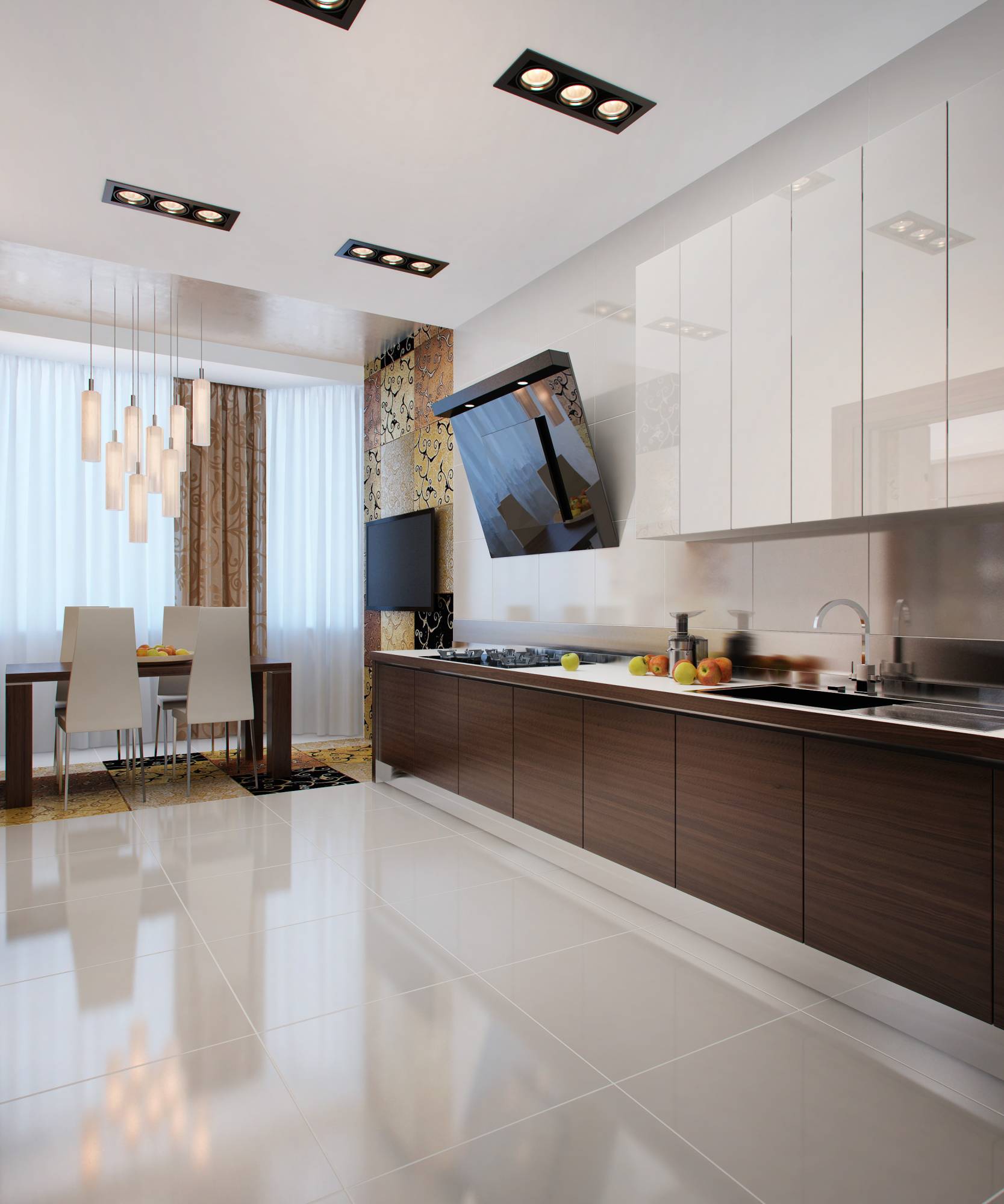 Дизайн кухни выдержан в общей гамме с преобладанием светлых поверхностей. Рабочая зона имеет линейное расположение – с удобным доступом к системам хранения и технике. Обеденная группа организована перед окном и выделена с помощью декоративных плит в бронзовой гамме, которыми облицованы в этом месте пол и стены по обеим сторонам.