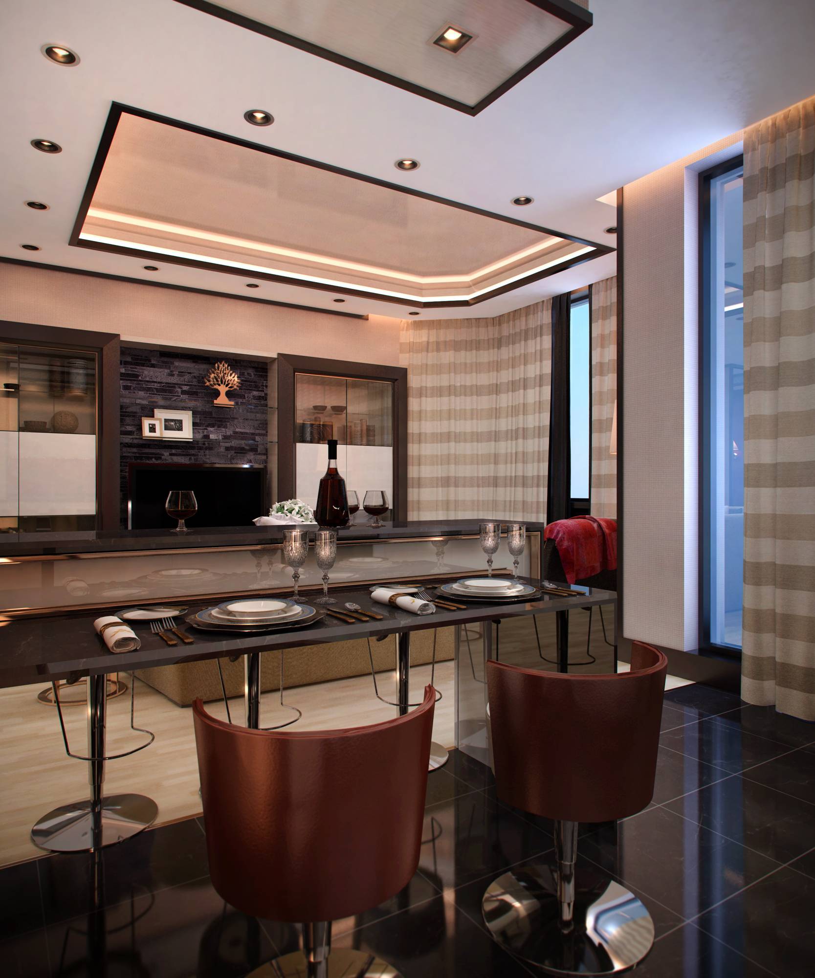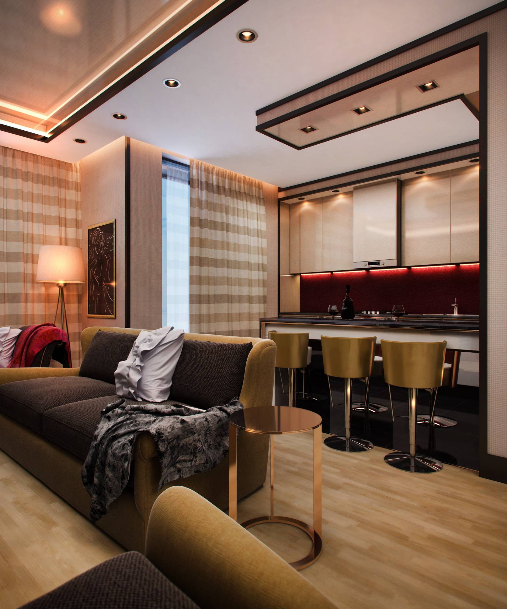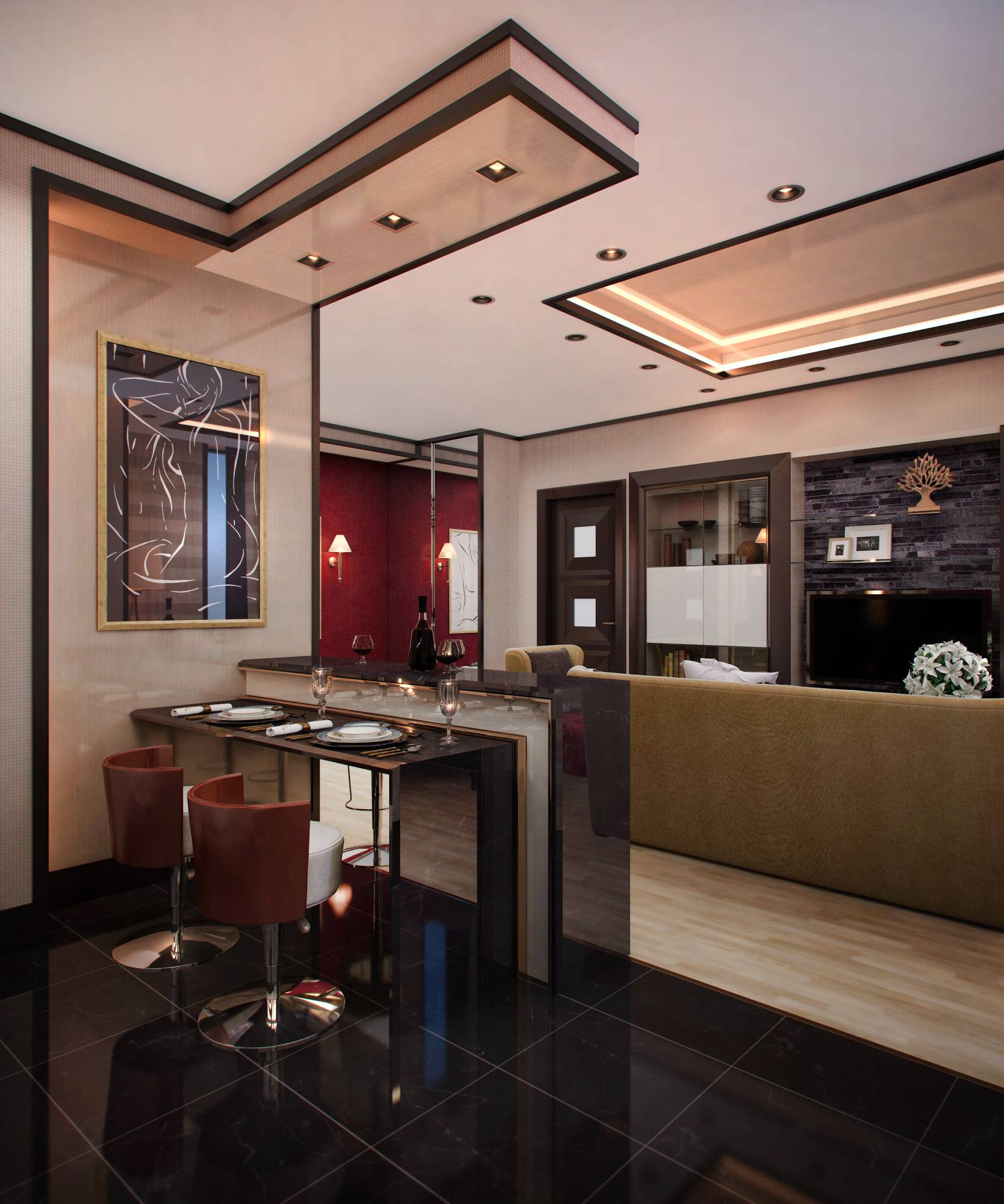 Функцию обеденного стола здесь выполняет двухуровневая барная стойка. Проход на лоджию прикрыт широкими светлыми шторами, такое же текстильное оформление используется в интерьере гостиной и спальни.