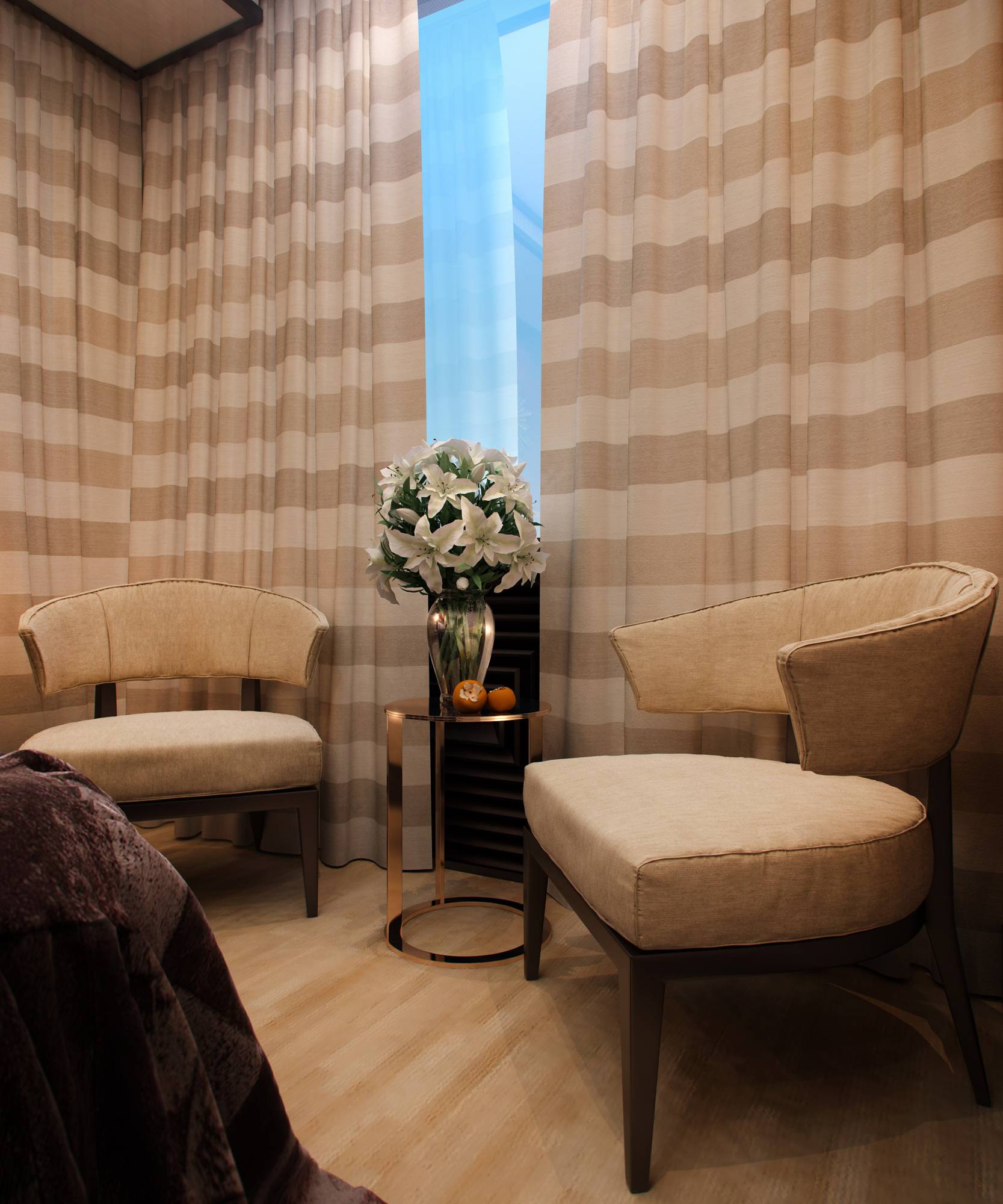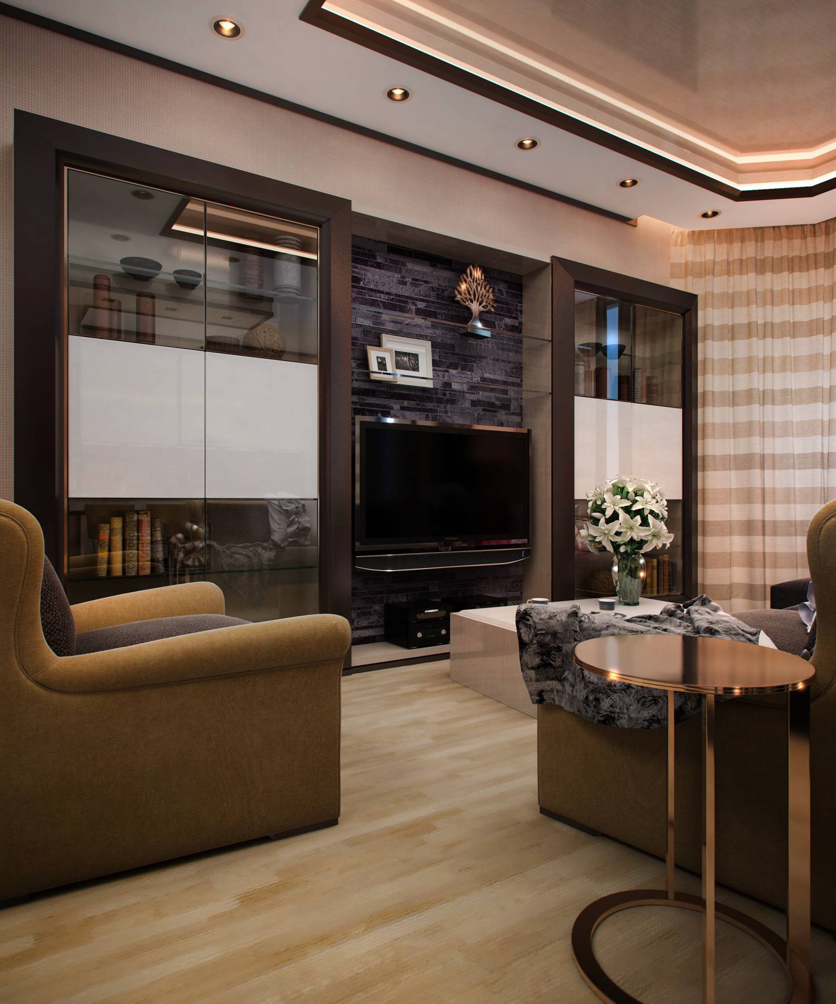 Горизонтальные полосы штор задают в интерьере интересный ритмический рисунок и поддерживают своим цветом бежево-песочный фон стен и пола. В зоне отдыха ТВ-ниша отделана декоративным камнем натурального серого цвета. По обеим сторонам от ниши – шкафы с прозрачными фасадами.