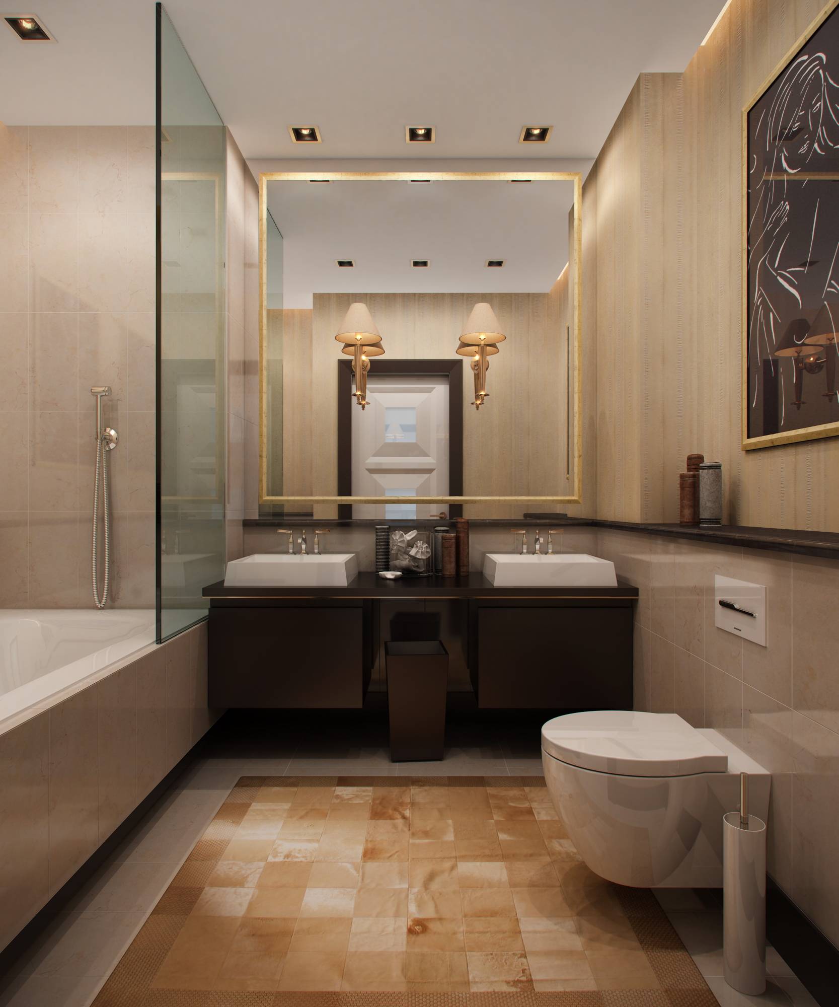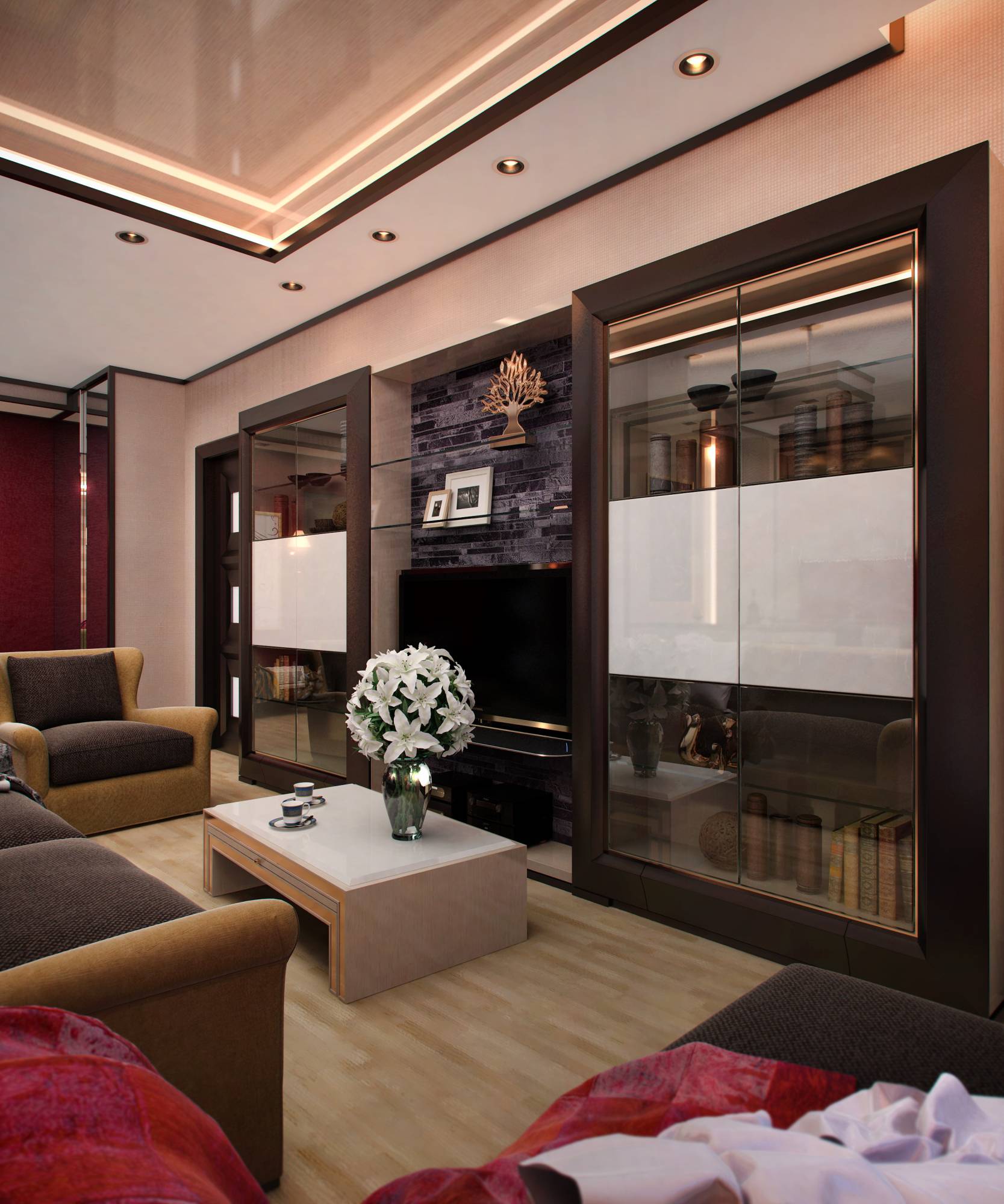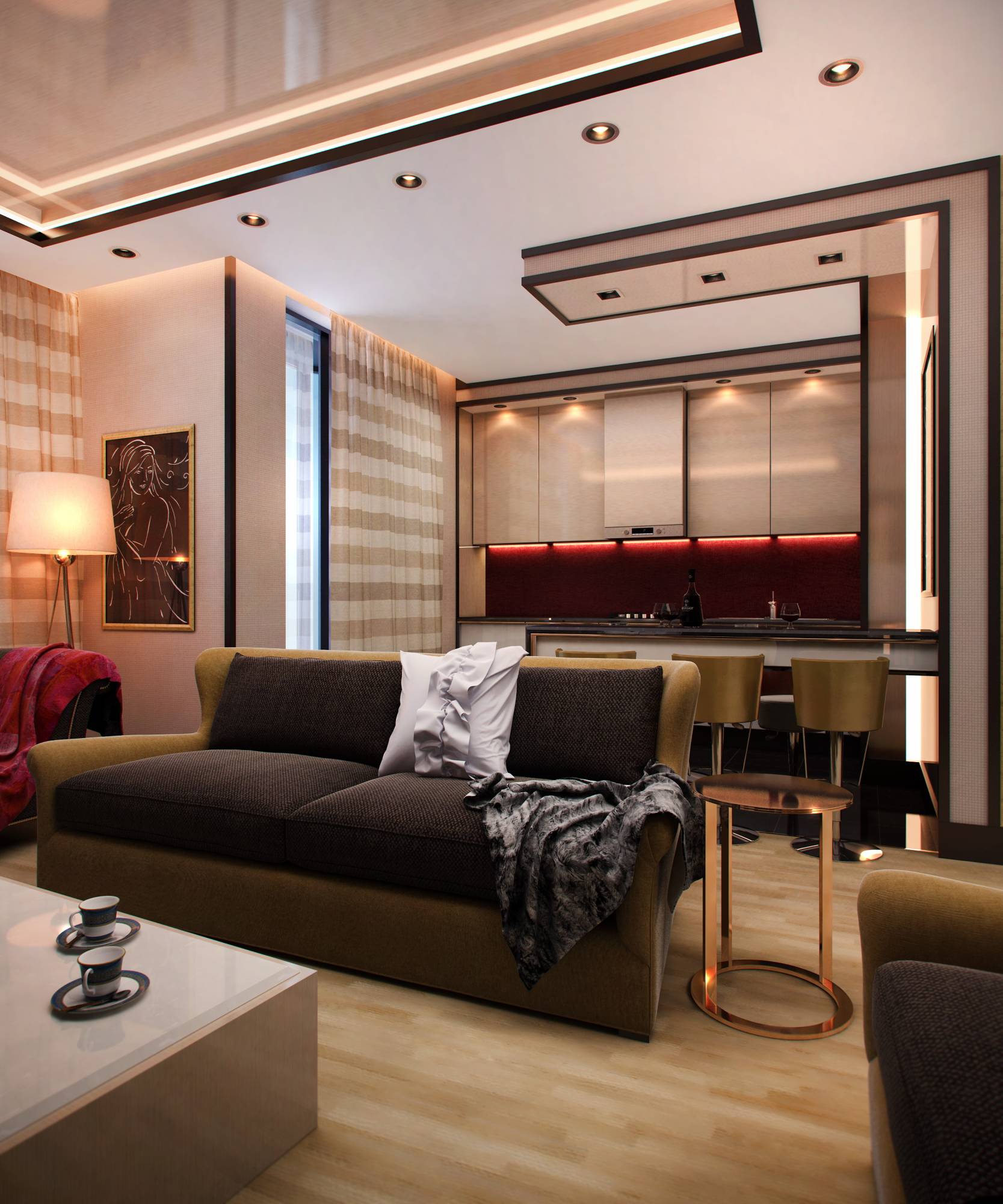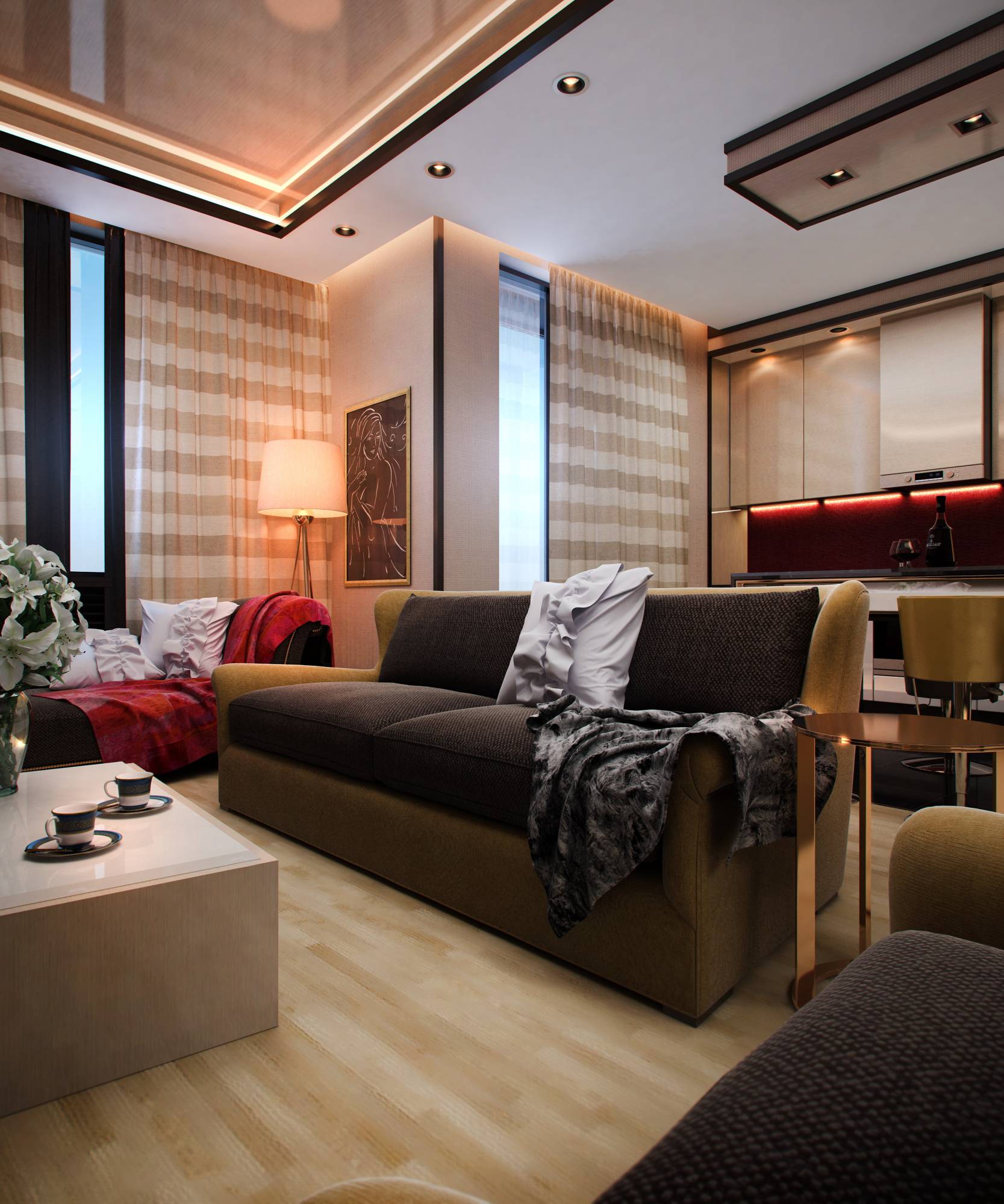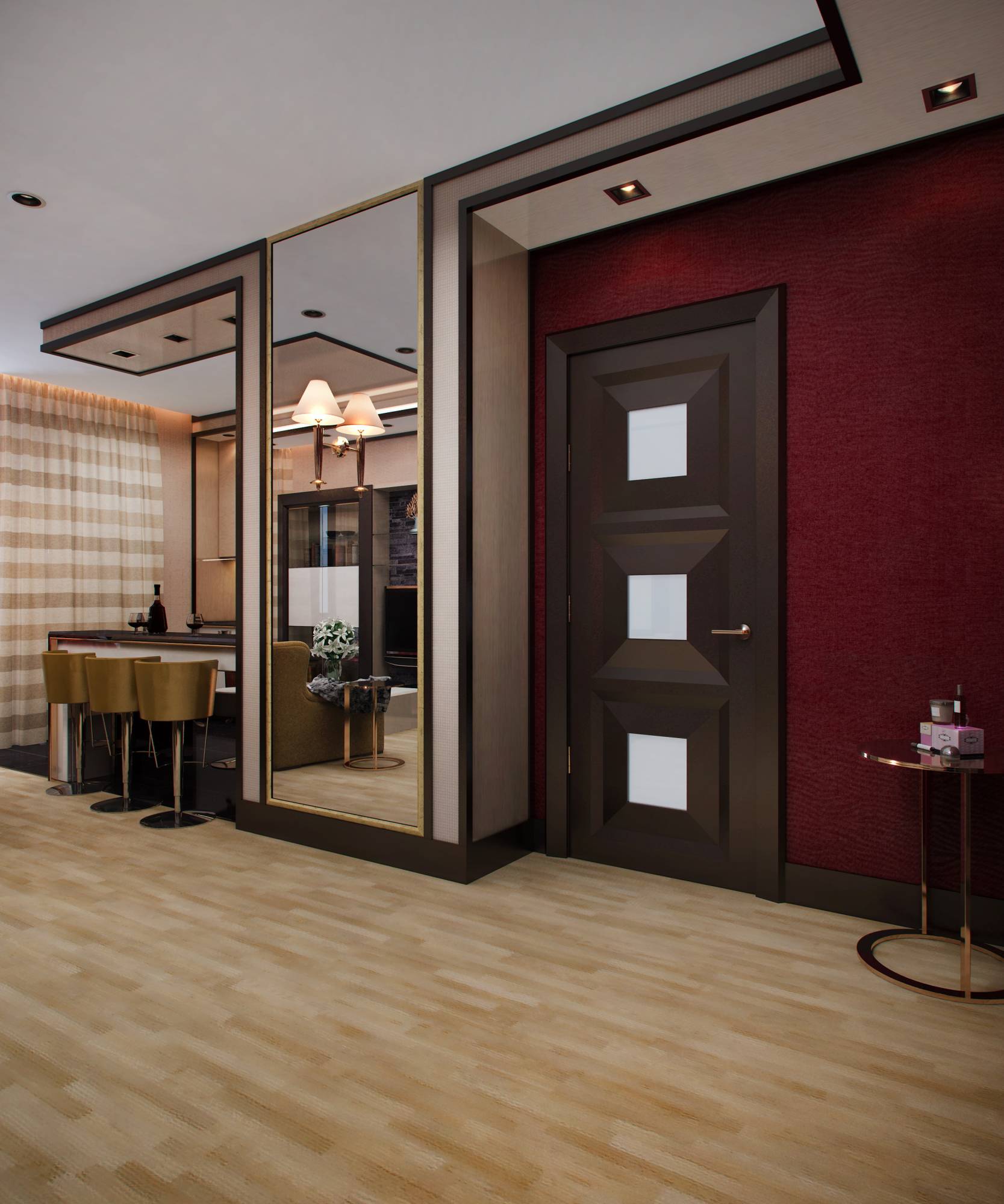 В дизайне квартиры дизайнером удалось создать гармонию из, казалось бы, сложно-сочетаемых цветов – винные оттенки и вся палитра бежевого, коричневого и ванильного. Интерьер нельзя назвать светлым, но и темно в нем не будет, так как освещение продумано и его достаточно.