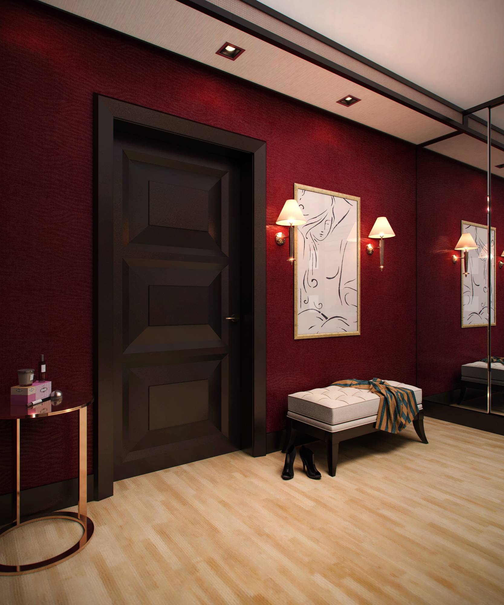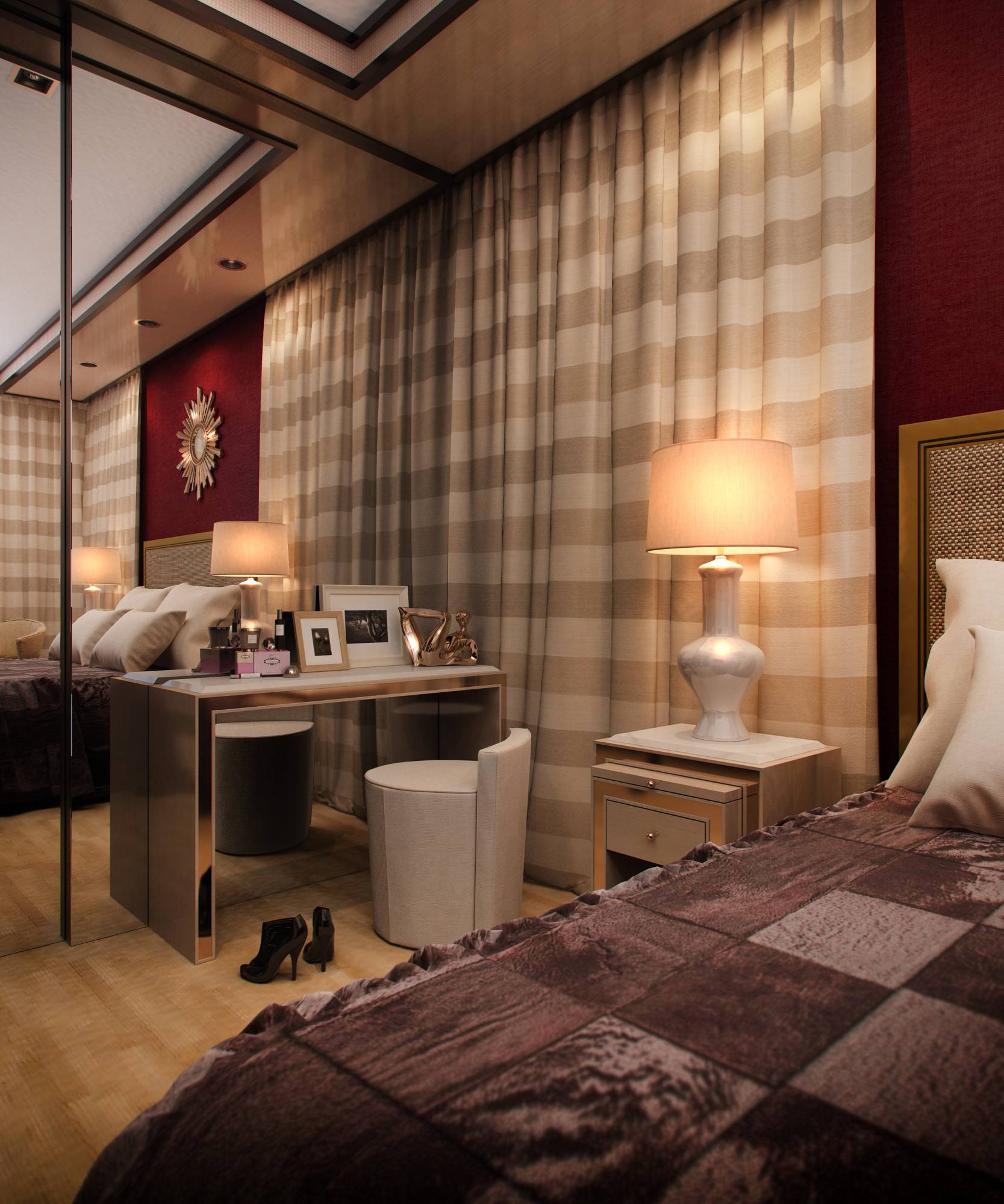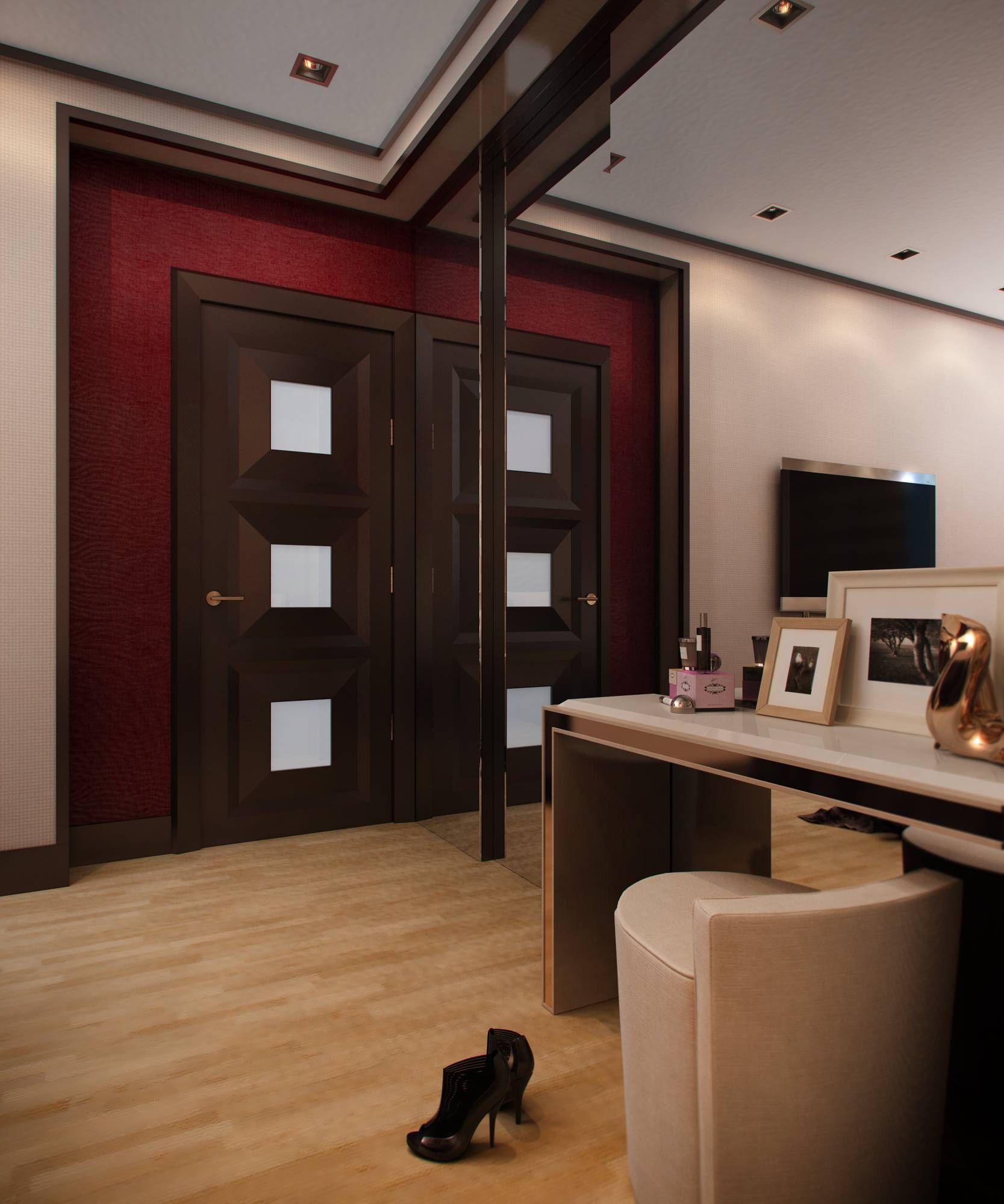 В красные цвета окрашены и стены спальной комнаты. Стена за туалетным столиком обшита зеркальной панелью, ближе к входу ее продолжает встроенный шкаф-купе с зеркальными дверцами.