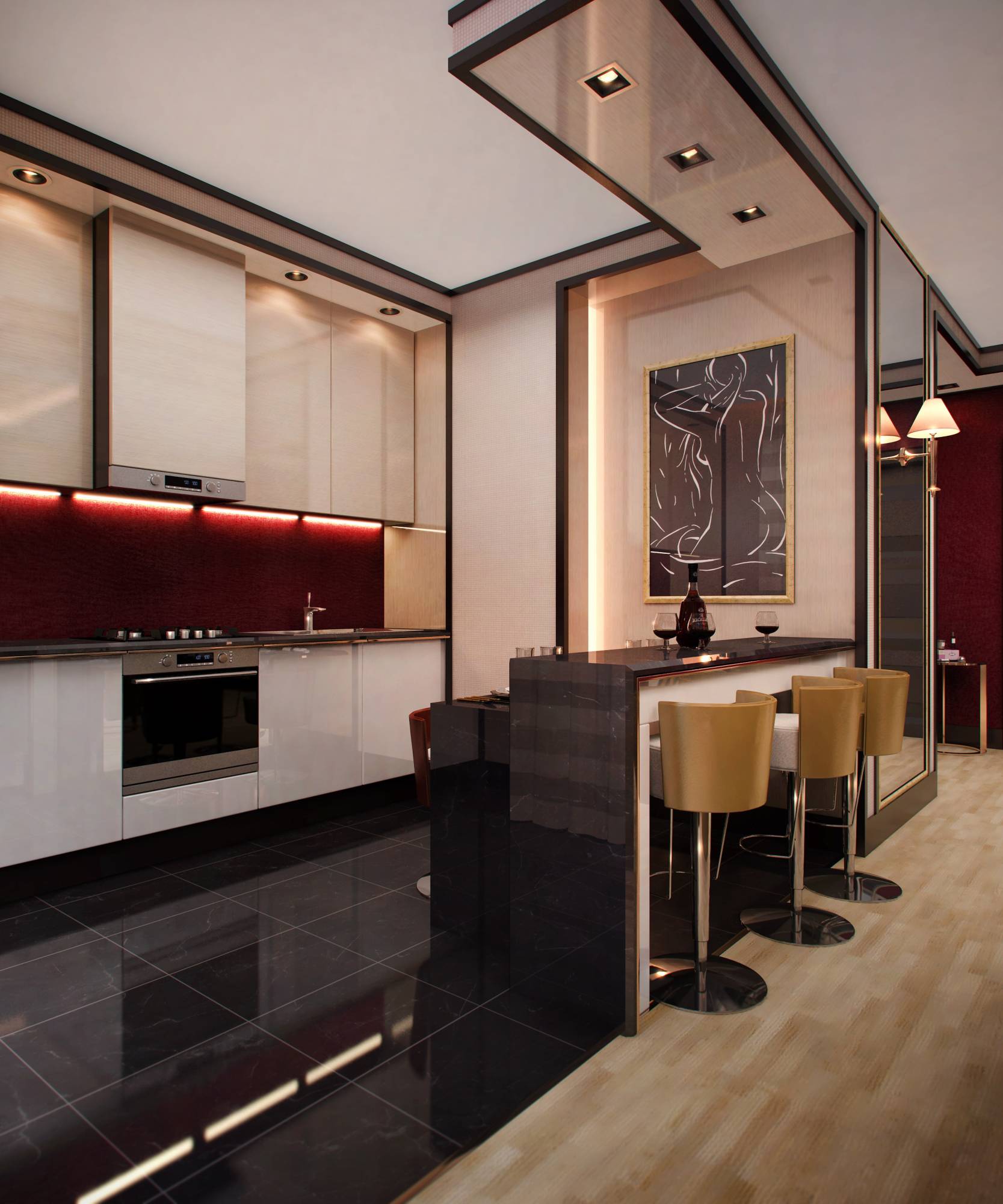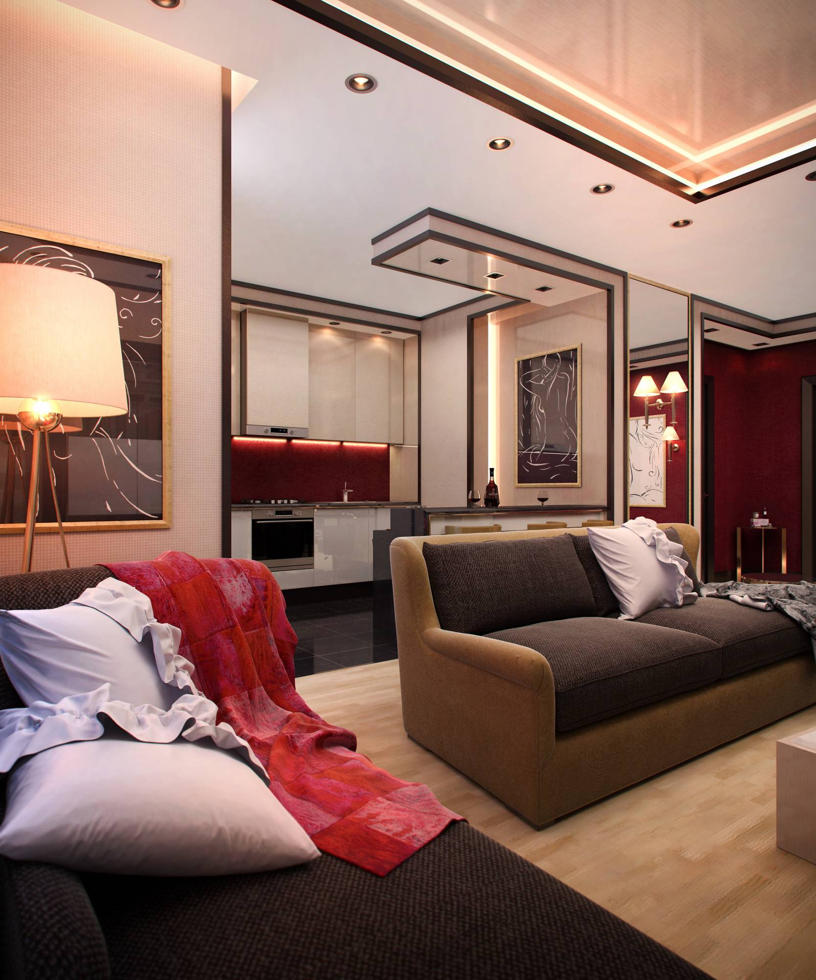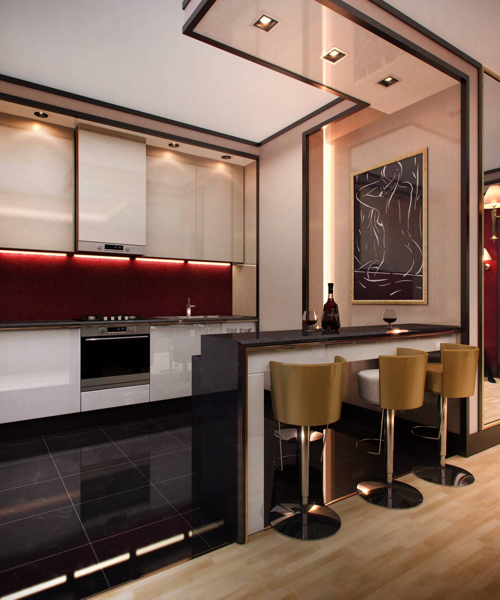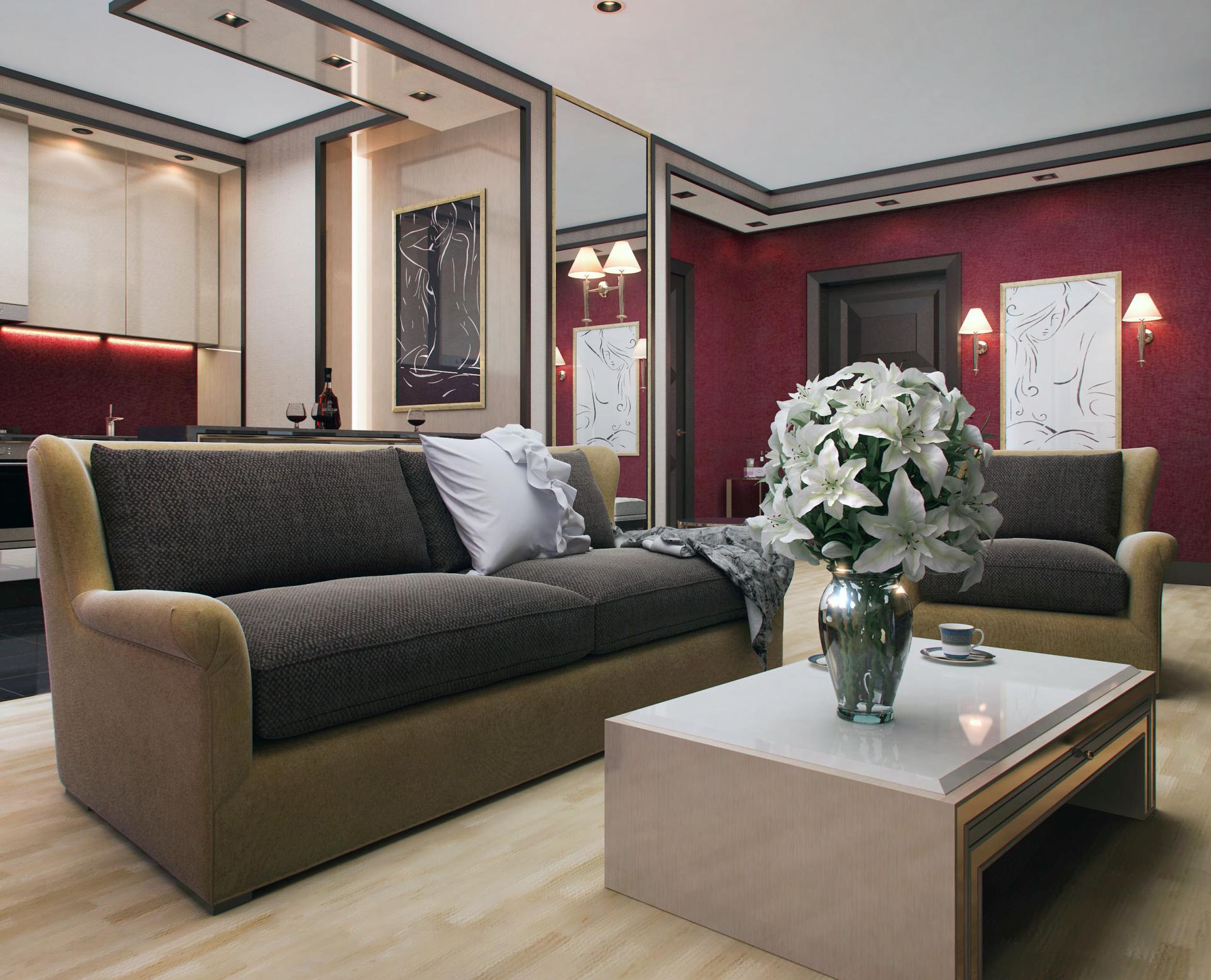 Границу зон подчеркивает и зеркальное полотно, которым обшита стена по направлению к кухне. Красивый красноватый тон выбран также для отделки кухонного фартука, но смотрится гармонично и подходит под выбранный стиль дизайна всей квартиры.