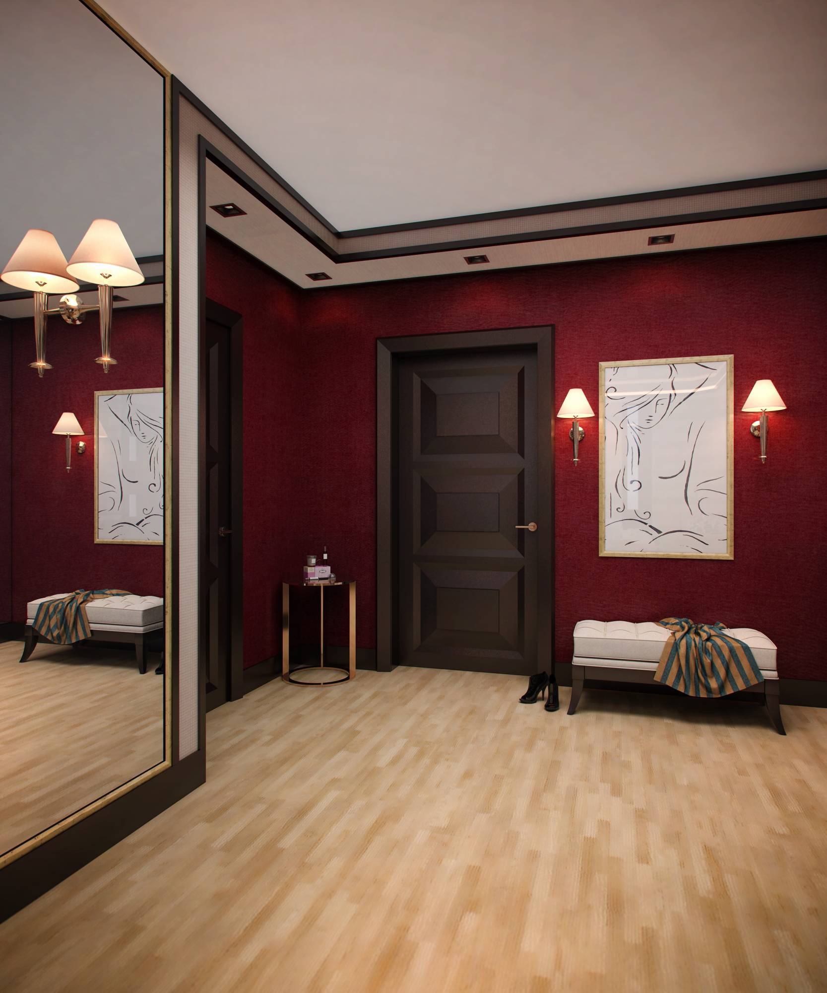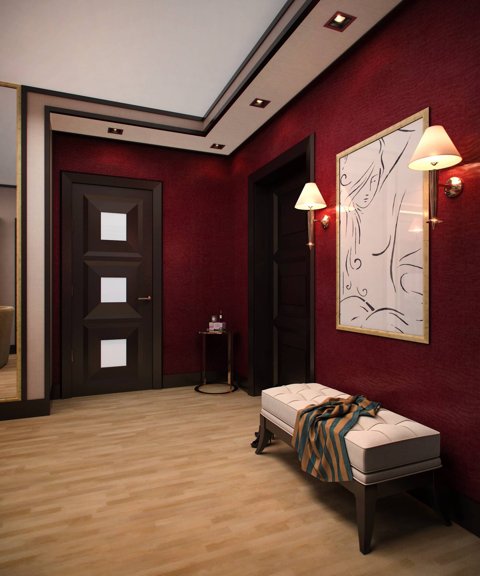 Поскольку планировочным решением прихожая объединена с гостиной, для ее зонирования используется цветовой контраст – стены в прихожей окрашены в насыщенный красный оттенок, он вносит в современный антураж легкий намек на богемность и шик.