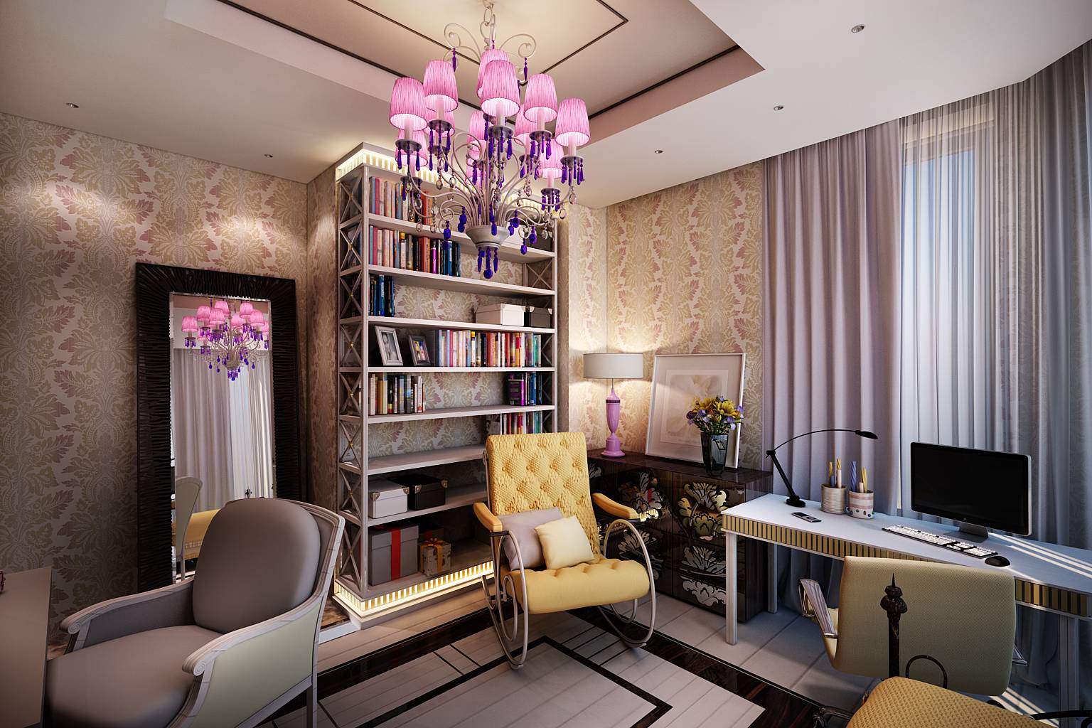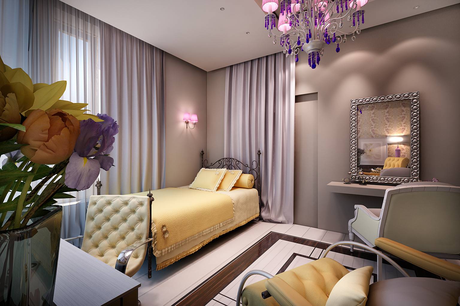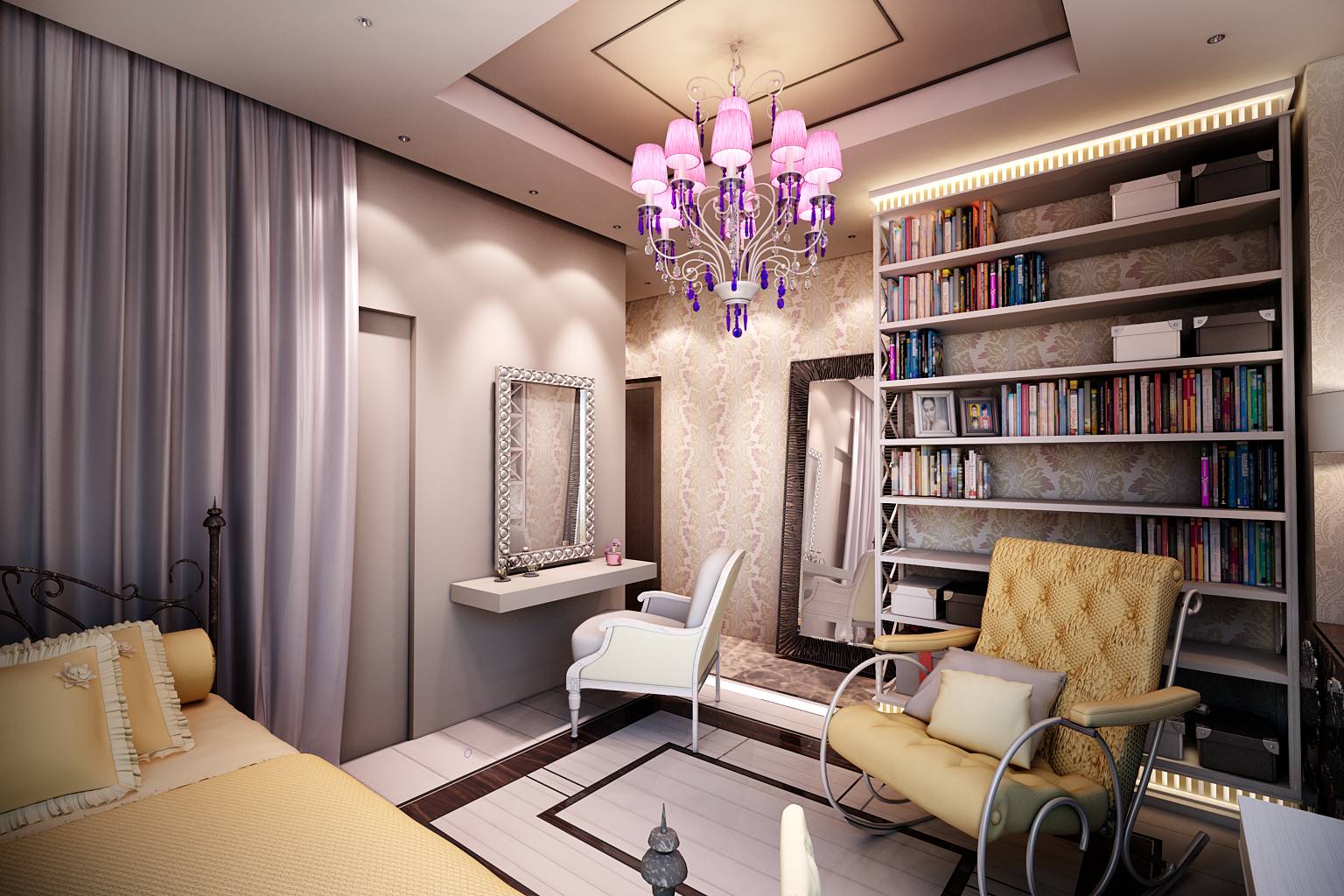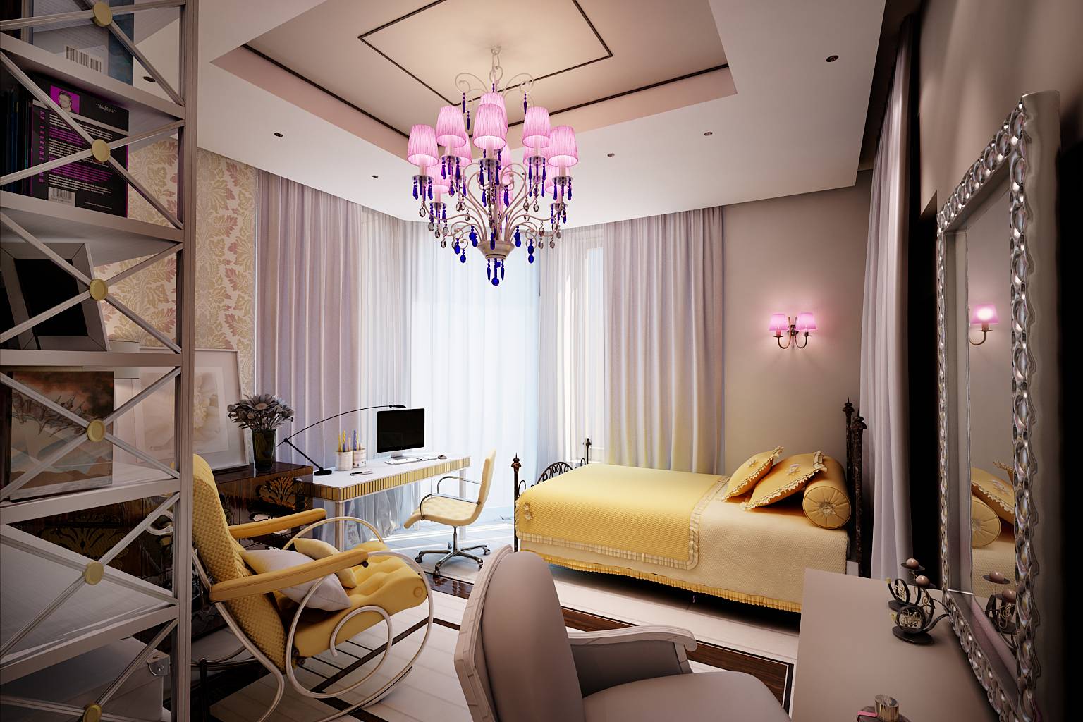 В современный интерьер детской включены элементы ар-деко: кованые спинки кровати, массивные зеркальные рамы цвета серебра, люстра с подвесками.