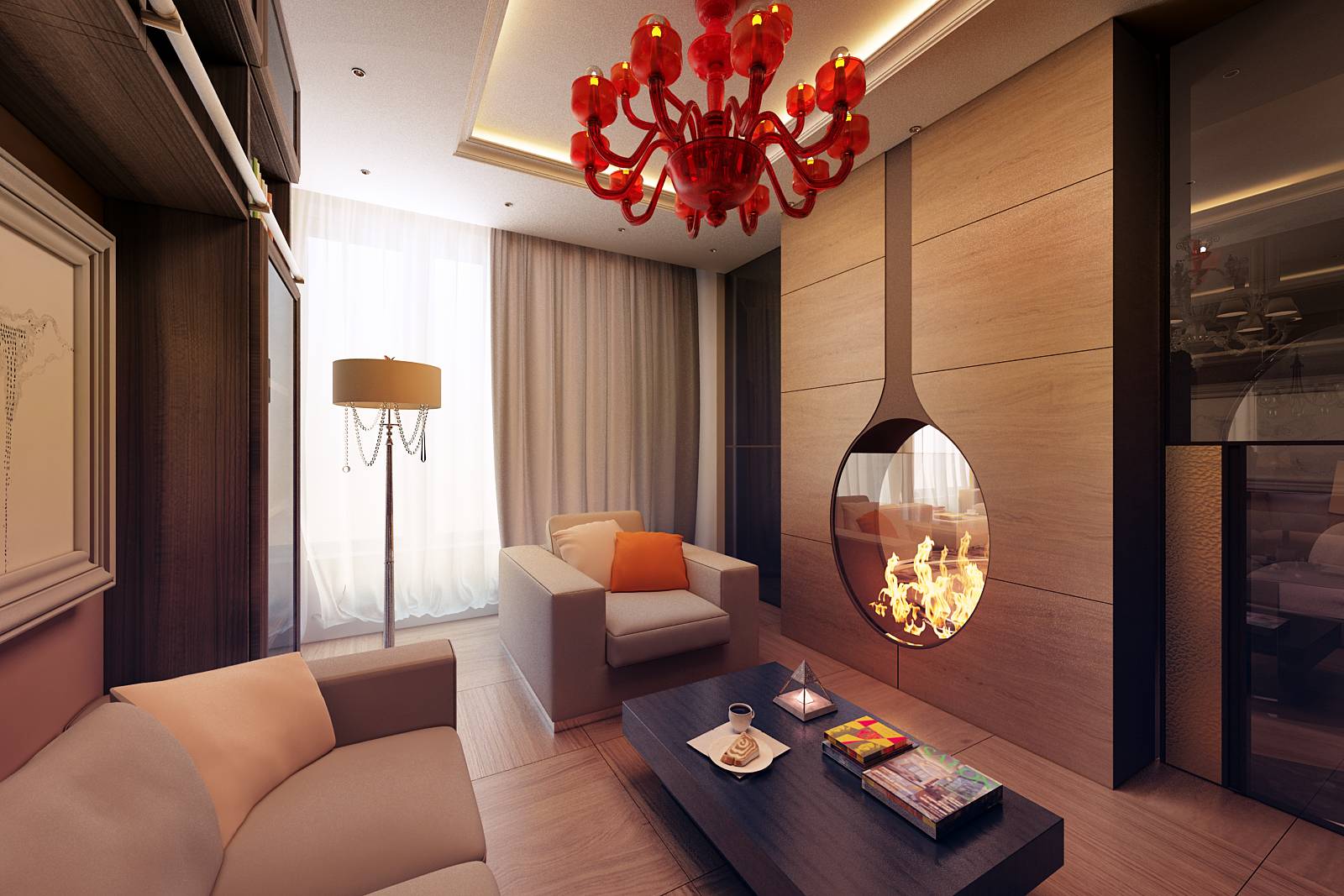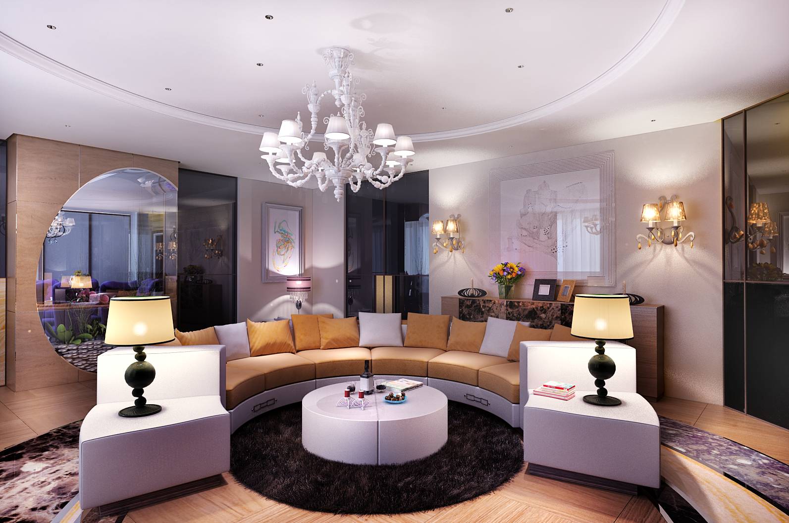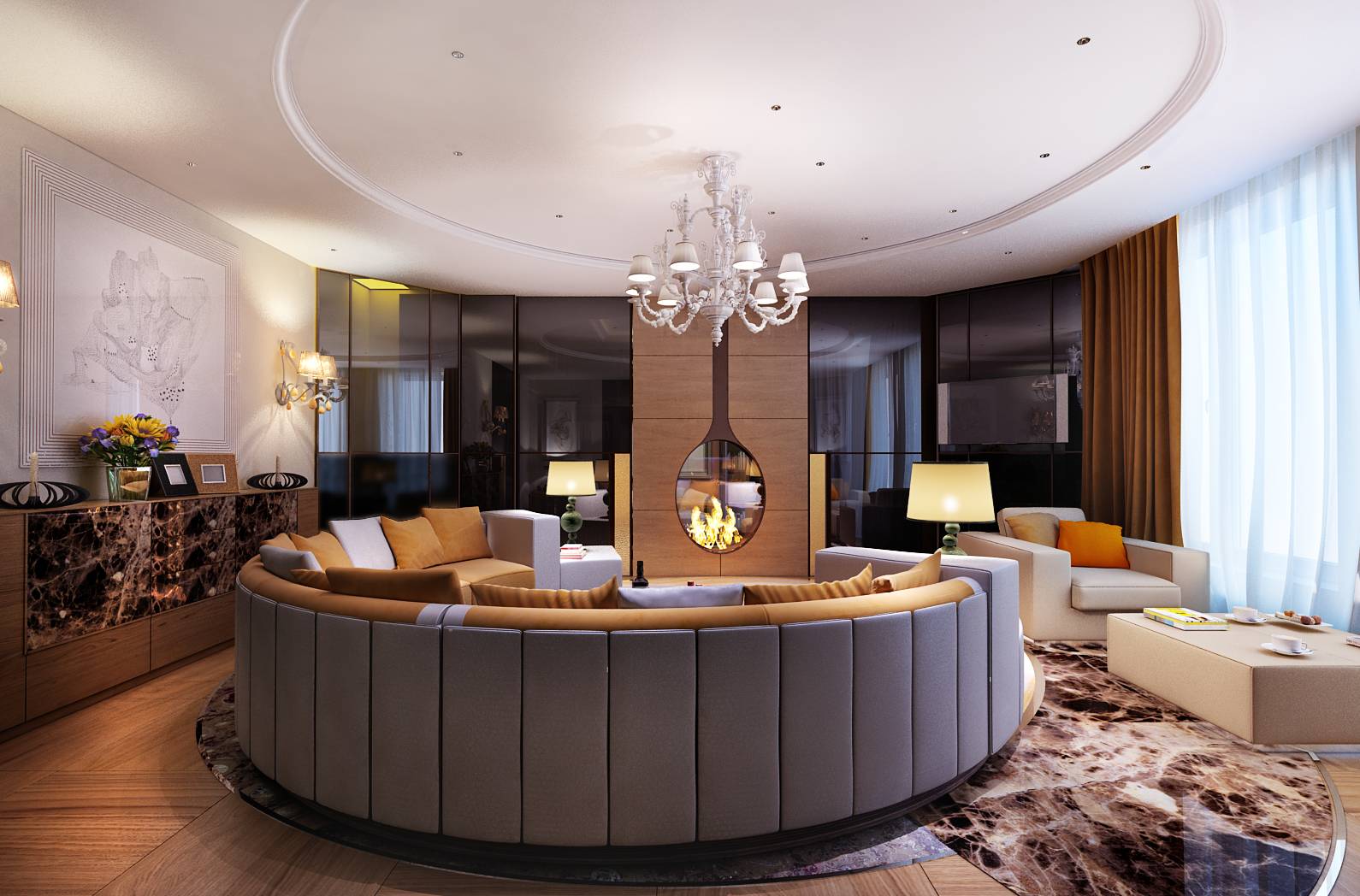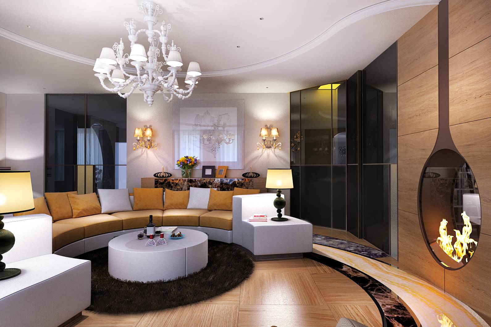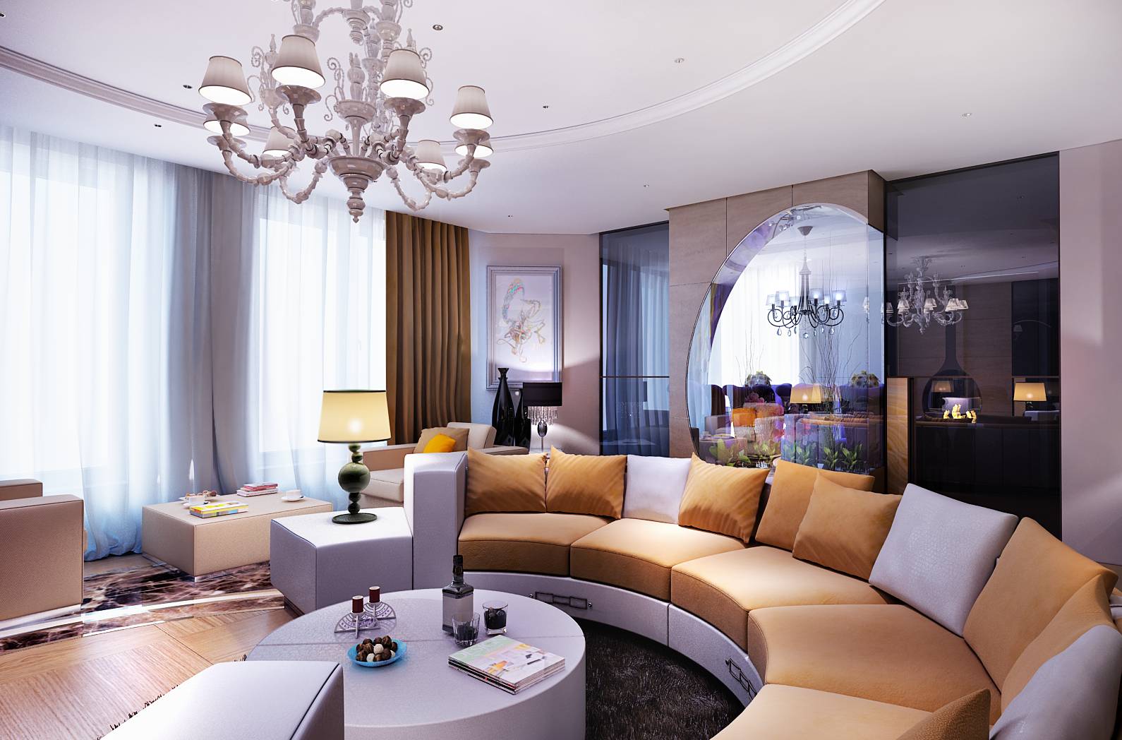 В дизайне интерьере квартиры для семьи с 1 ребенком активно используется идея круга: в оформлении потолка и пола гостиной, в форме дивана, дизайне камина на границе зоны отдыха и спальни, прозрачной декоративной перегородки на границе с кухней.