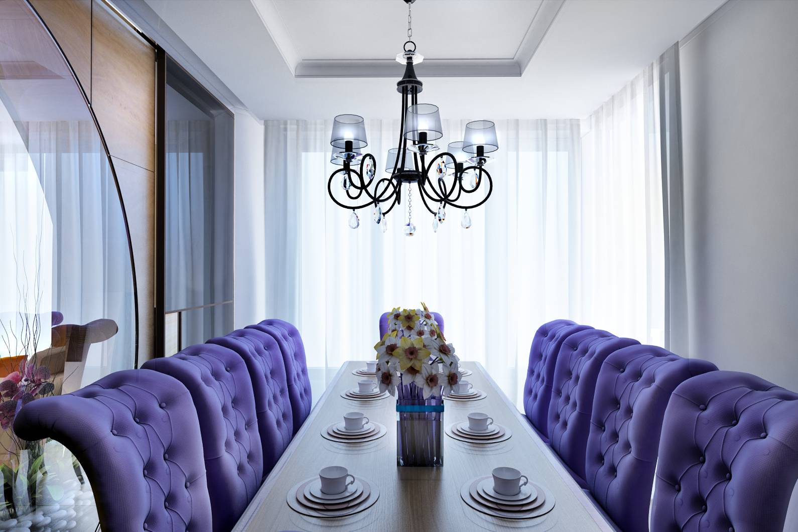 Теплые коричневые оттенки вносит в интерьер отделка деревом. В его окружении яркой акцентной деталью смотрятся мягкие столовые стулья с обивкой фиалкового оттенка.