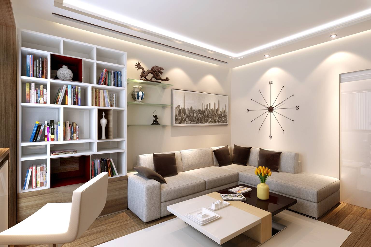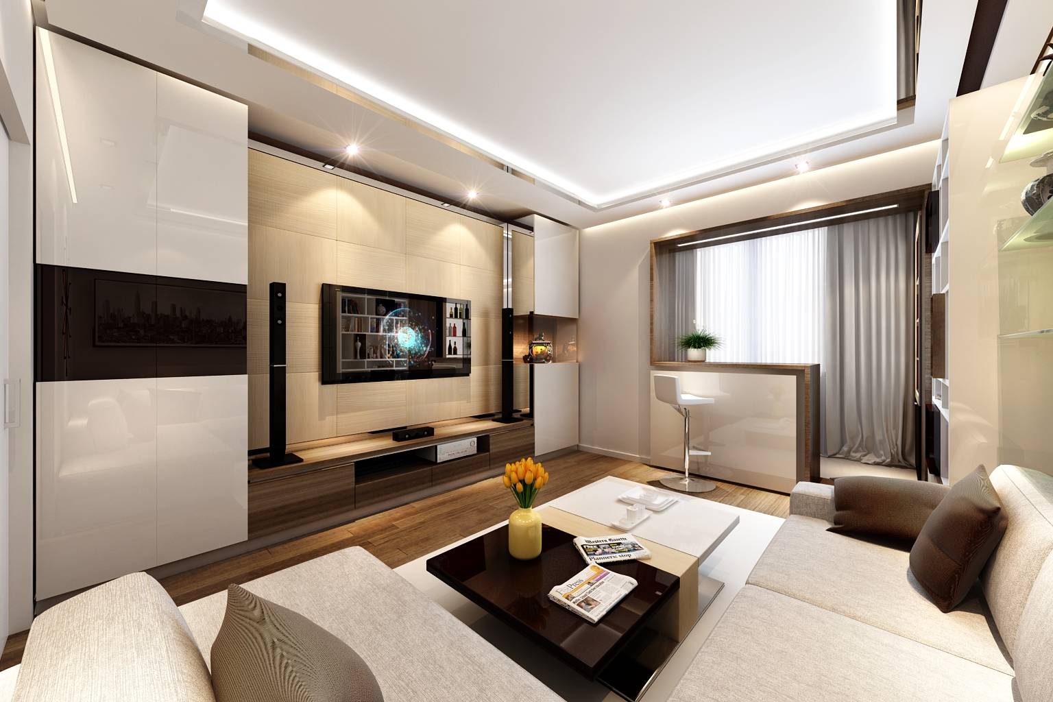 В светлых бежевых красках выполнен интерьер гостиной в проекте 3-х комнатной квартиры. Минимализм обстановки подчеркнут контрастными деталями: журнальным столиком, диванными подушками, отдельными нишами стеллажа.