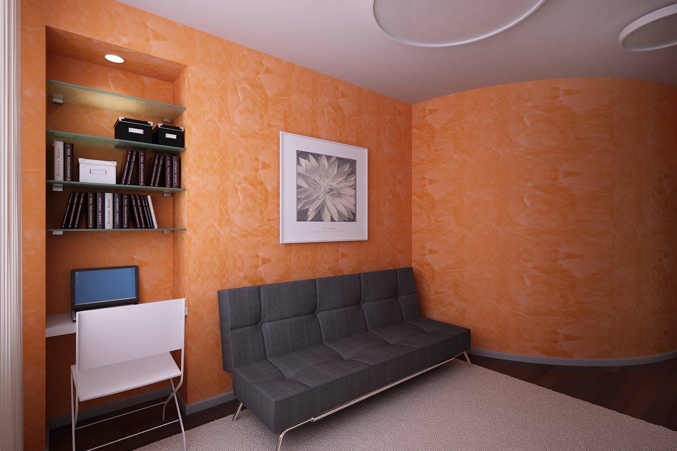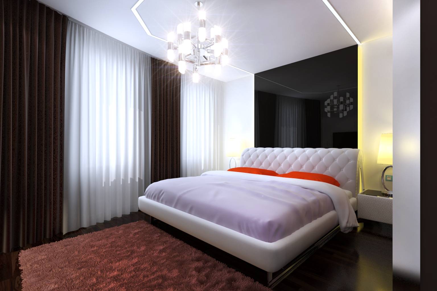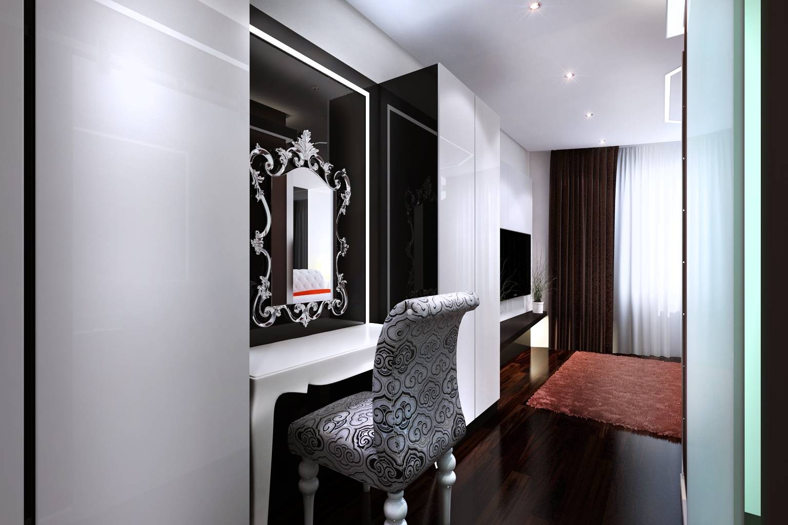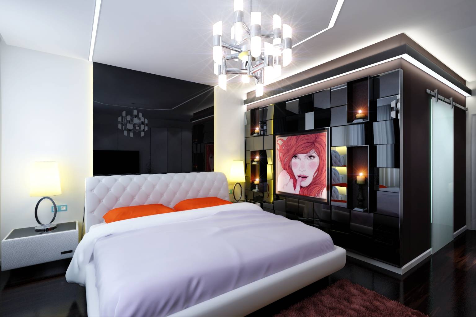 Спальня в дизайн-проекте интерьера 3-х комнатной квартиры насыщена глянцевыми плоскостями (молочные фасады платяного шкафа, графитовая панель за изголовьем кровати). Стена, за которой скрыт санузел, отделана множеством зеркальных фрагментов, в их центре – яркая картина. Ее оранжево-красную гамму достаточно поддержать дизайном подушек, чтобы насытить интерьер теплотой.