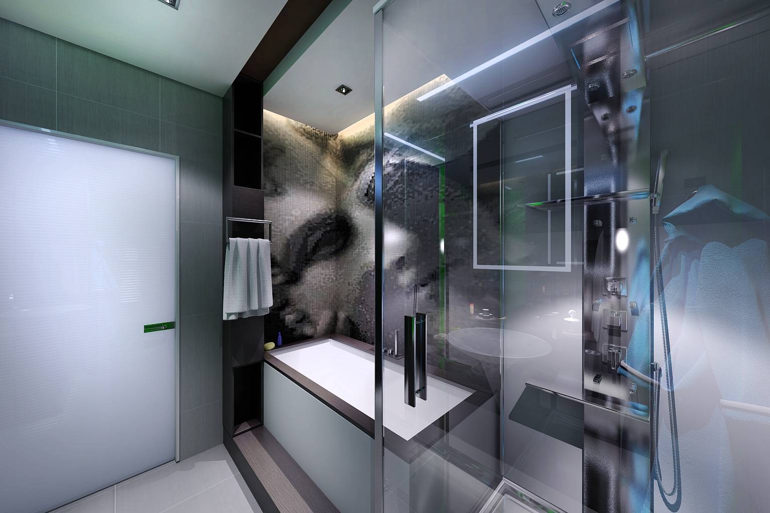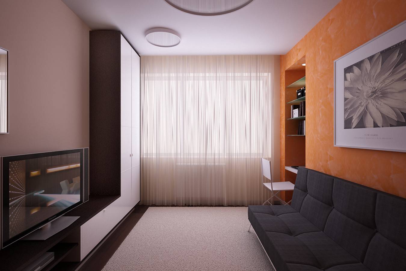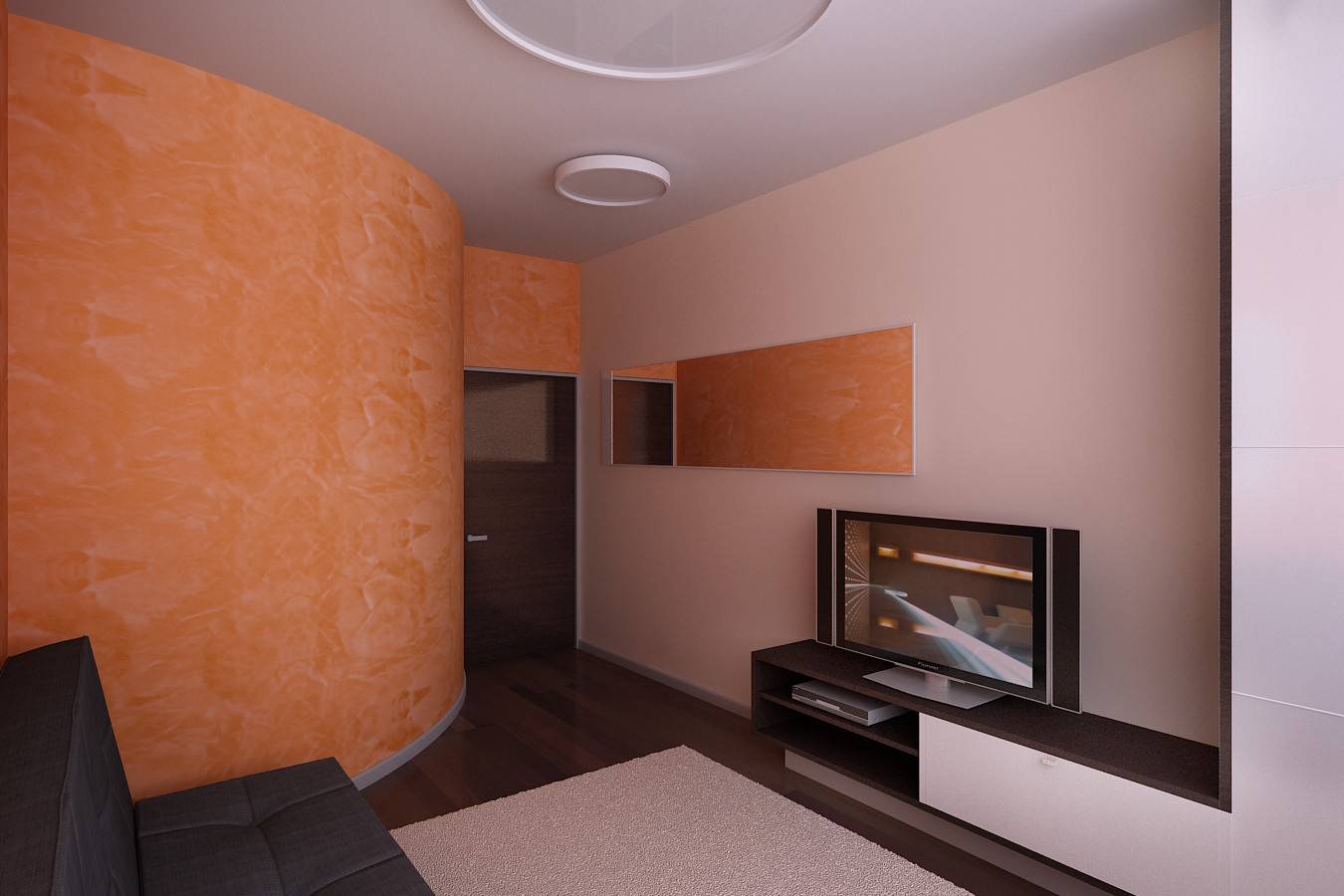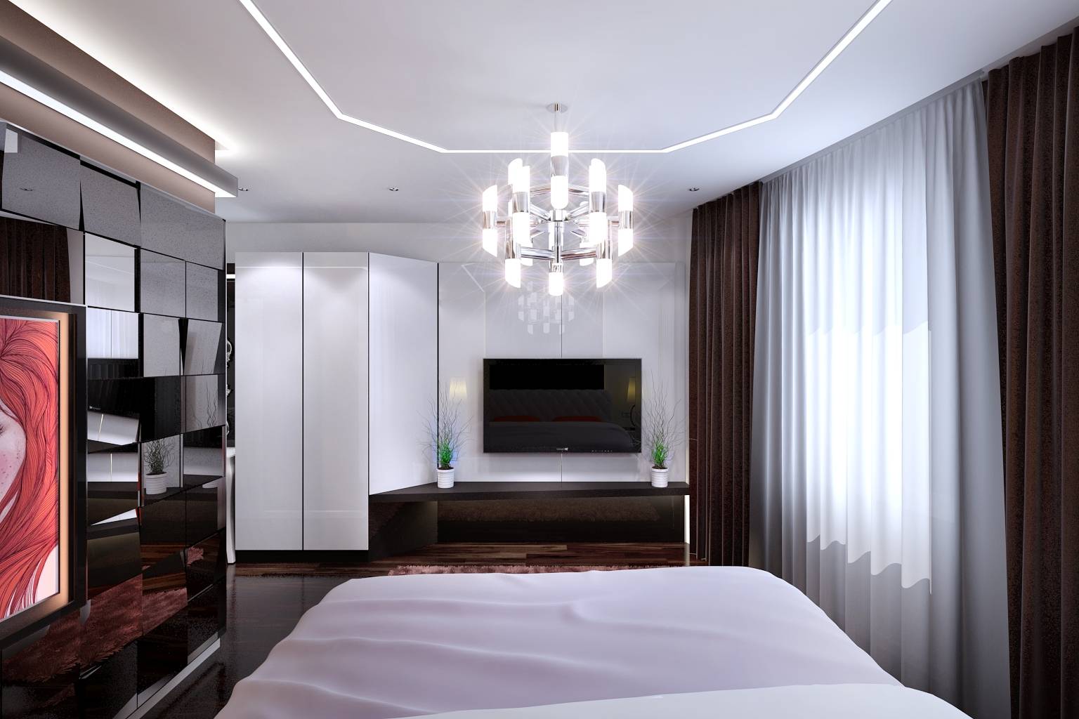 Спальня в дизайн-проекте интерьера 3-х комнатной квартиры насыщена глянцевыми плоскостями (молочные фасады платяного шкафа, графитовая панель за изголовьем кровати). Стена, за которой скрыт санузел, отделана множеством зеркальных фрагментов, в их центре – яркая картина. Ее оранжево-красную гамму достаточно поддержать дизайном подушек, чтобы насытить интерьер теплотой.
