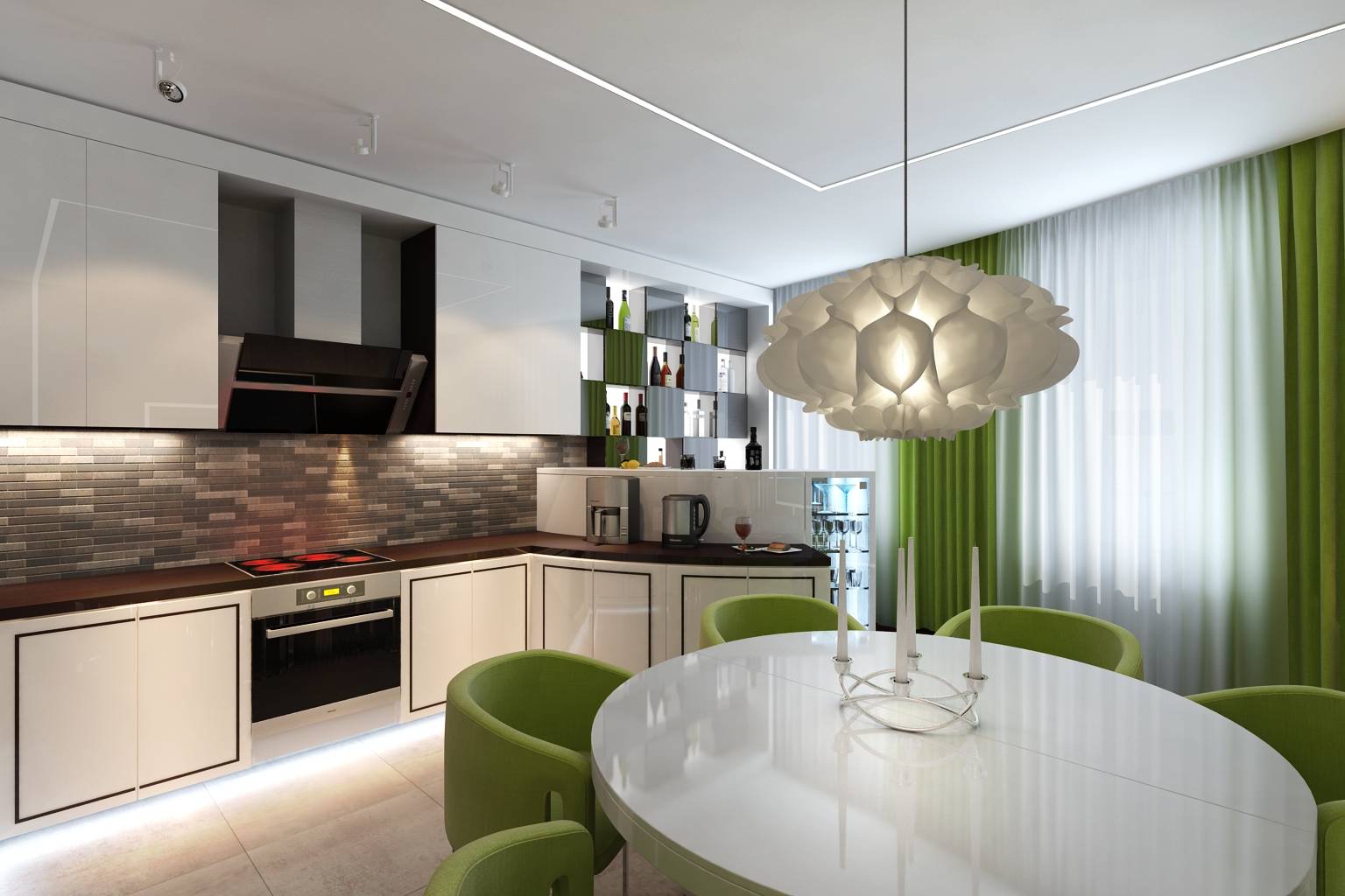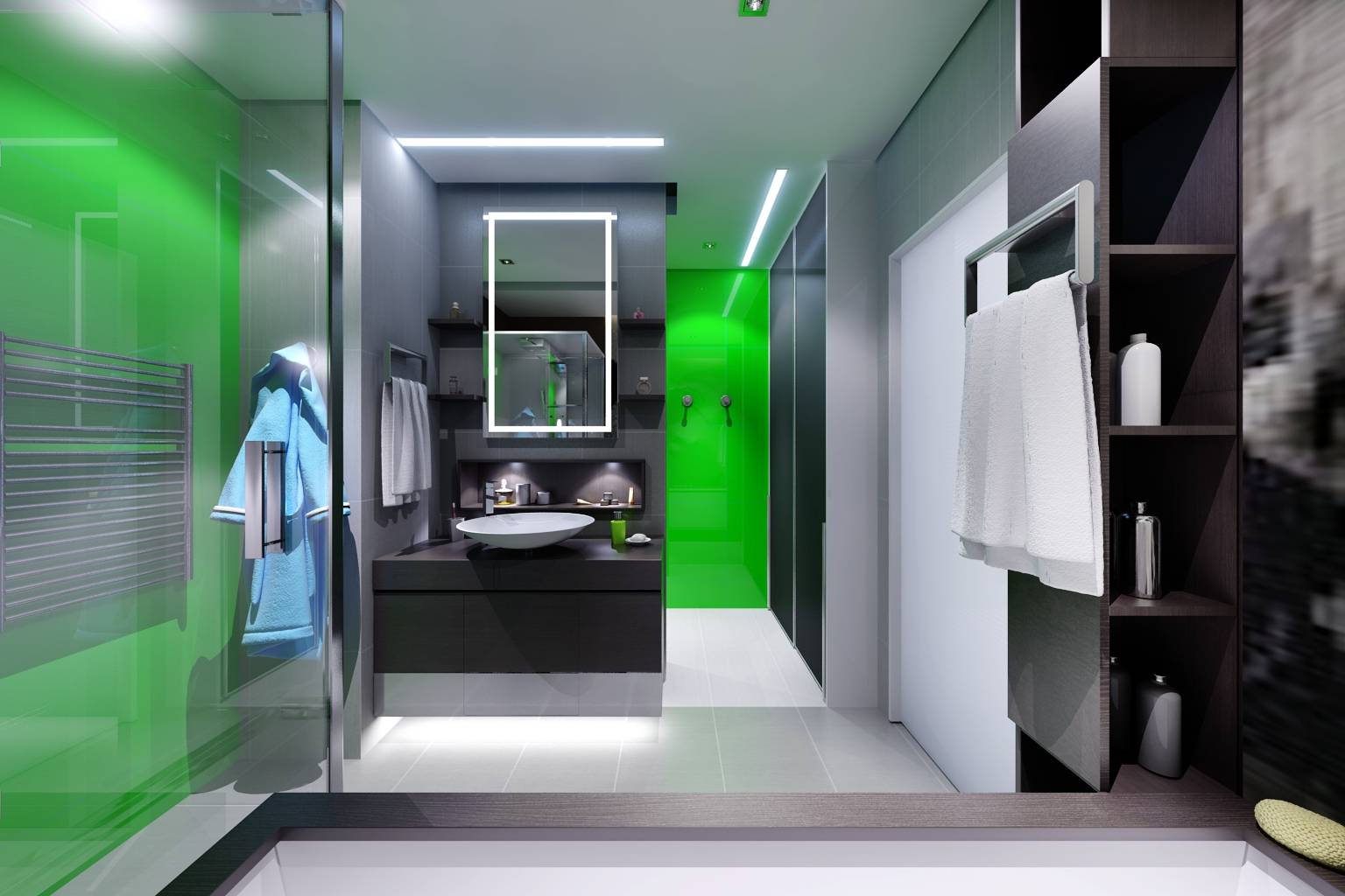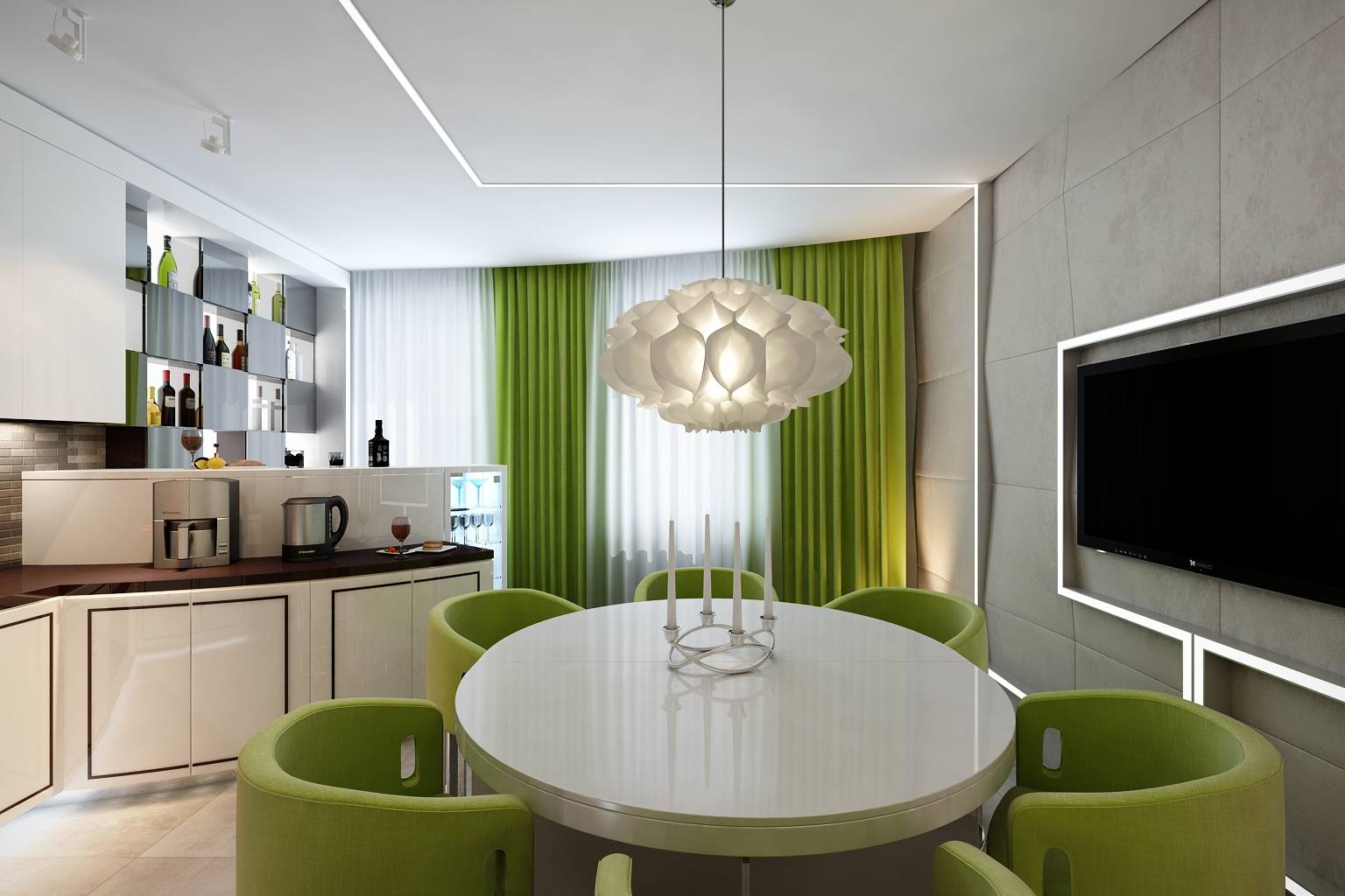 В качестве цветового акцента дизайн-проекта столовой использован спокойный оливковый, в более же насыщенном варианте он присутствует в оформлении ванной комнаты.