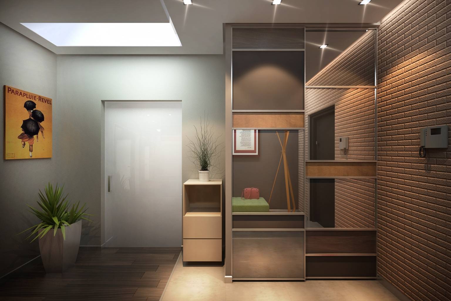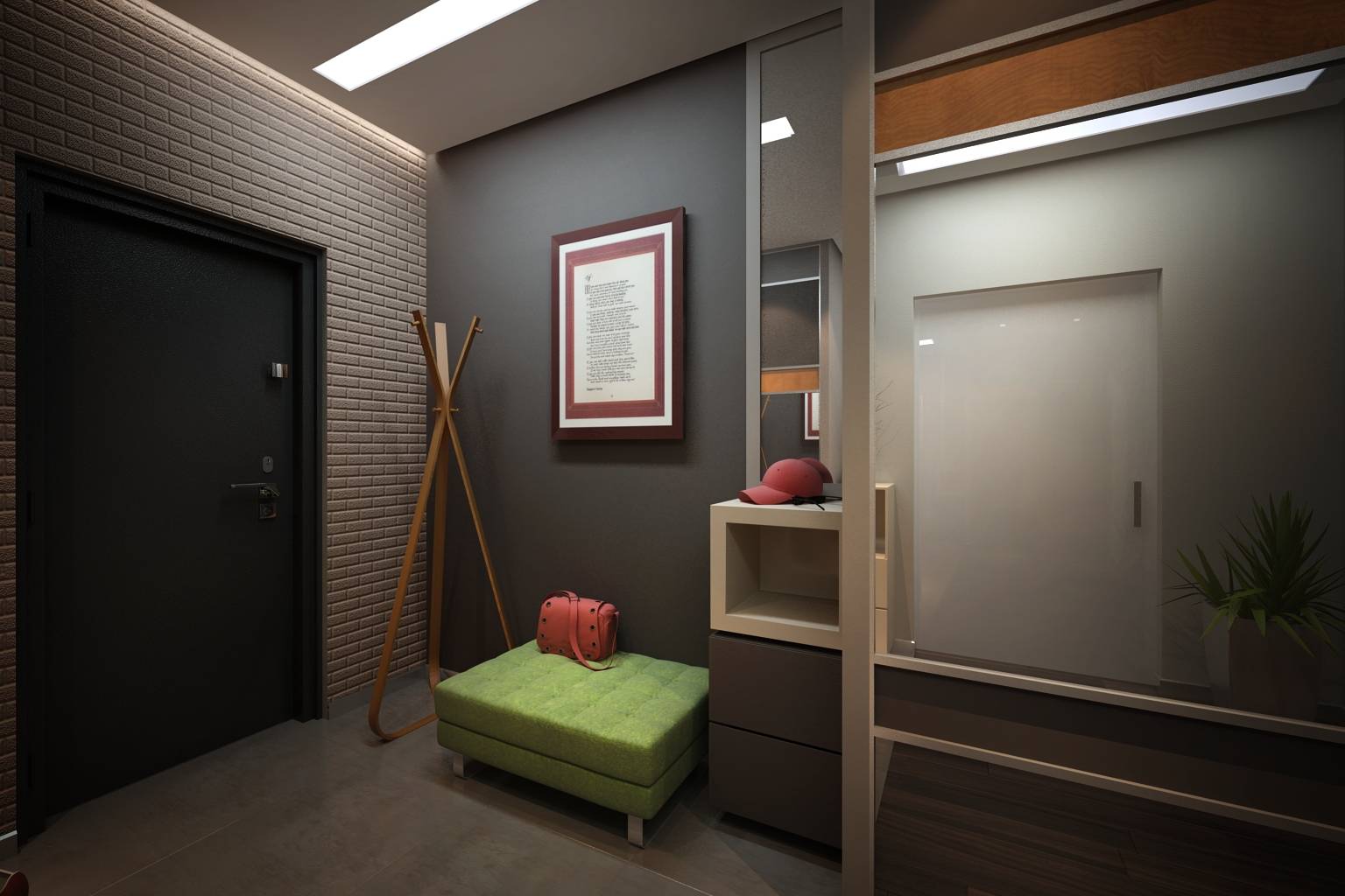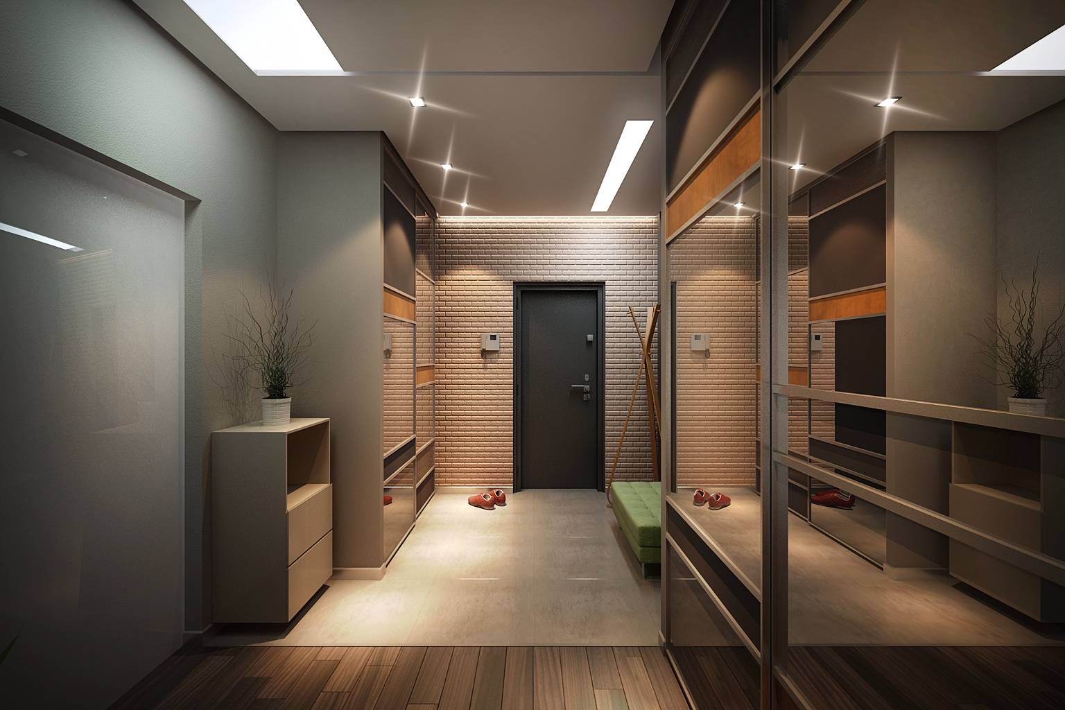 Стена с входной дверью акцентирована имитацией кирпичной кладки. Для экономии пространства один из гардеробных шкафов-купе располагается непосредственно в зоне прихожей, второй чуть дальше – напротив входа в ванную комнату.