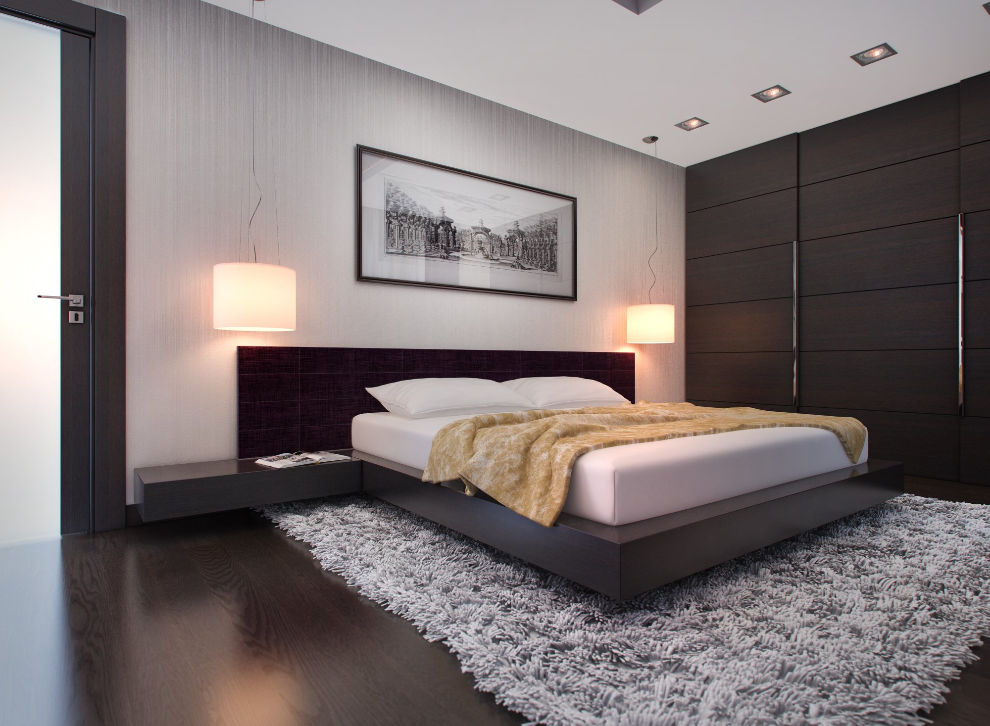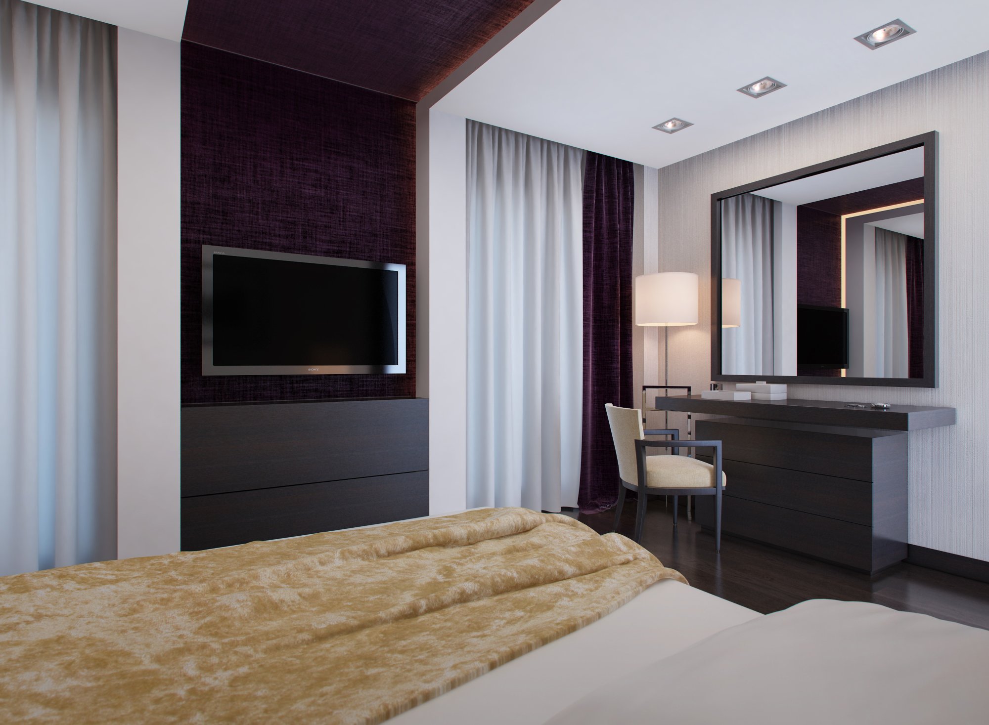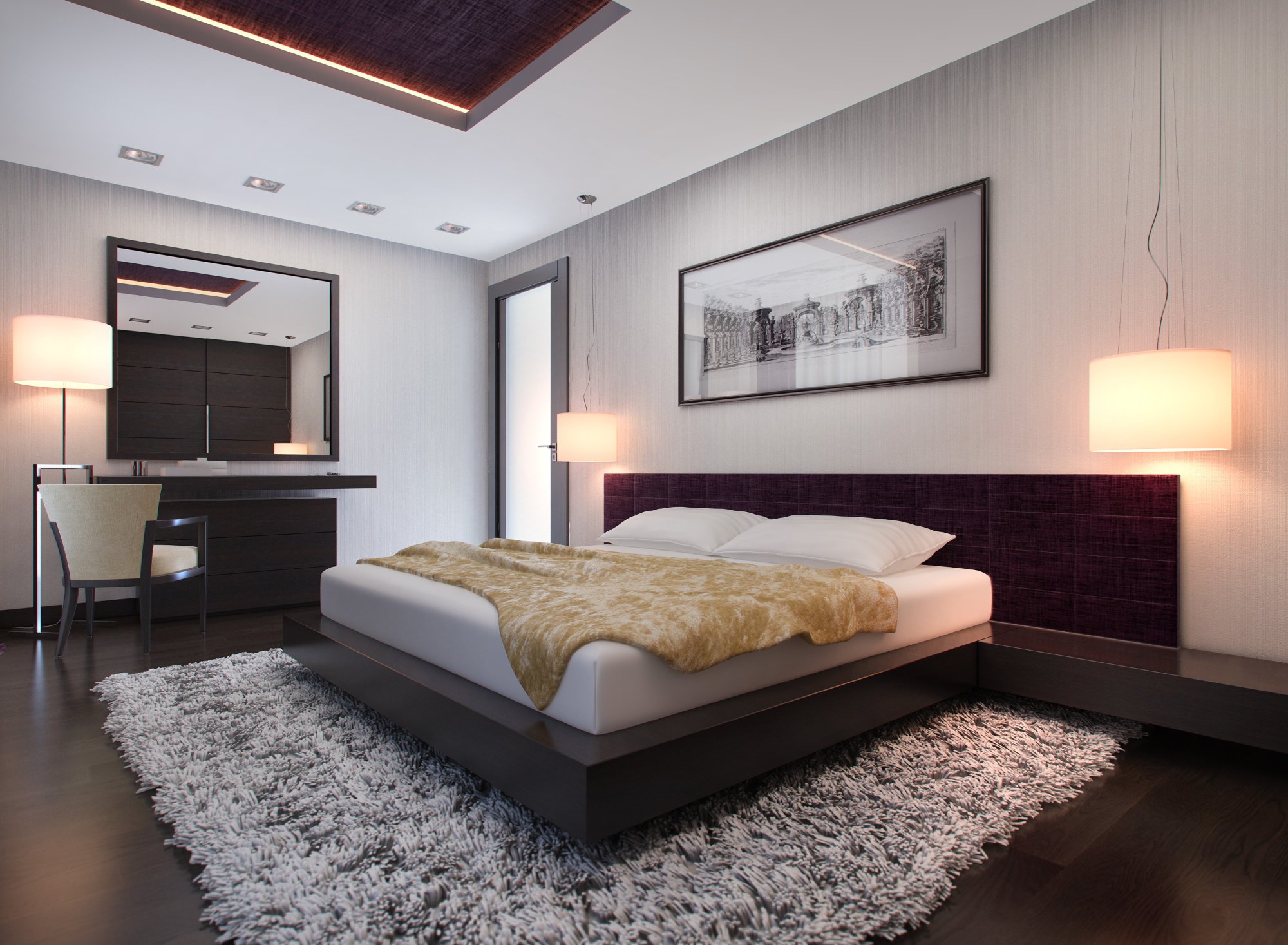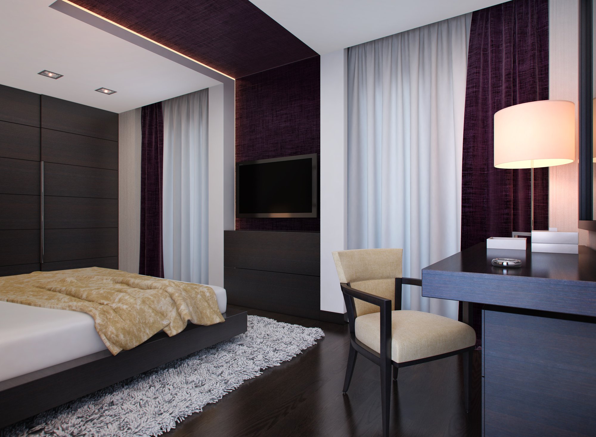 В решении дизайна интерьера спальни единство композиции достигается текстильным дизайном: изголовье кровати, переходящая на стену потолочная ниша и портьеры выполнены из бархата благородного оттенка темного аметиста.