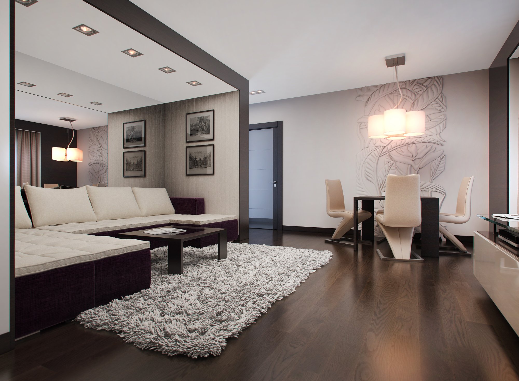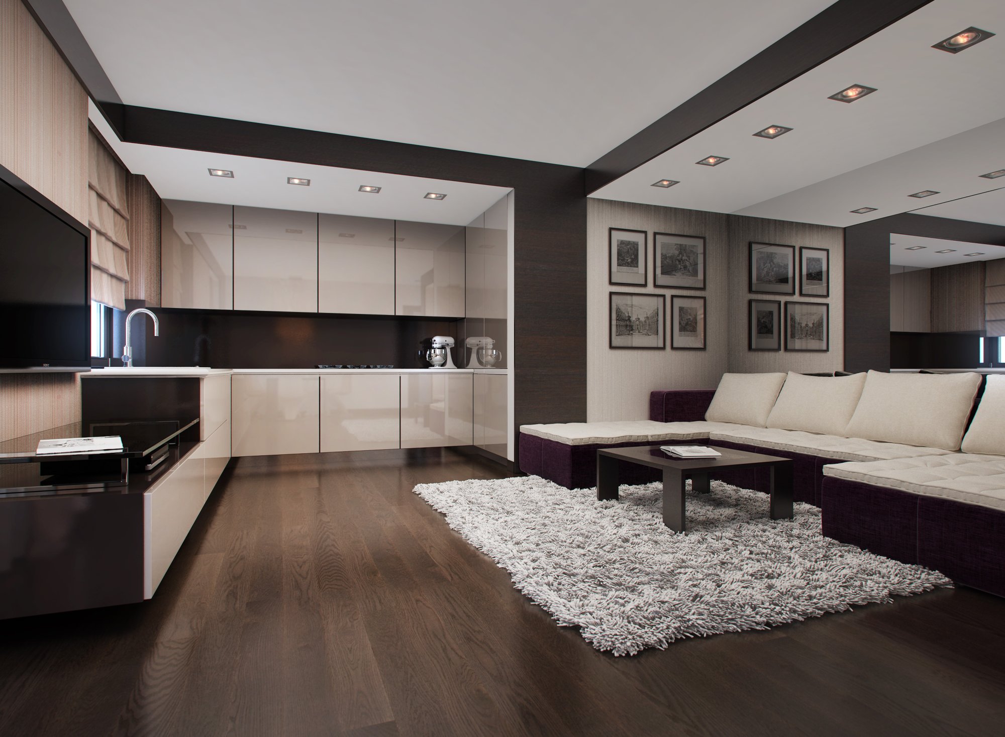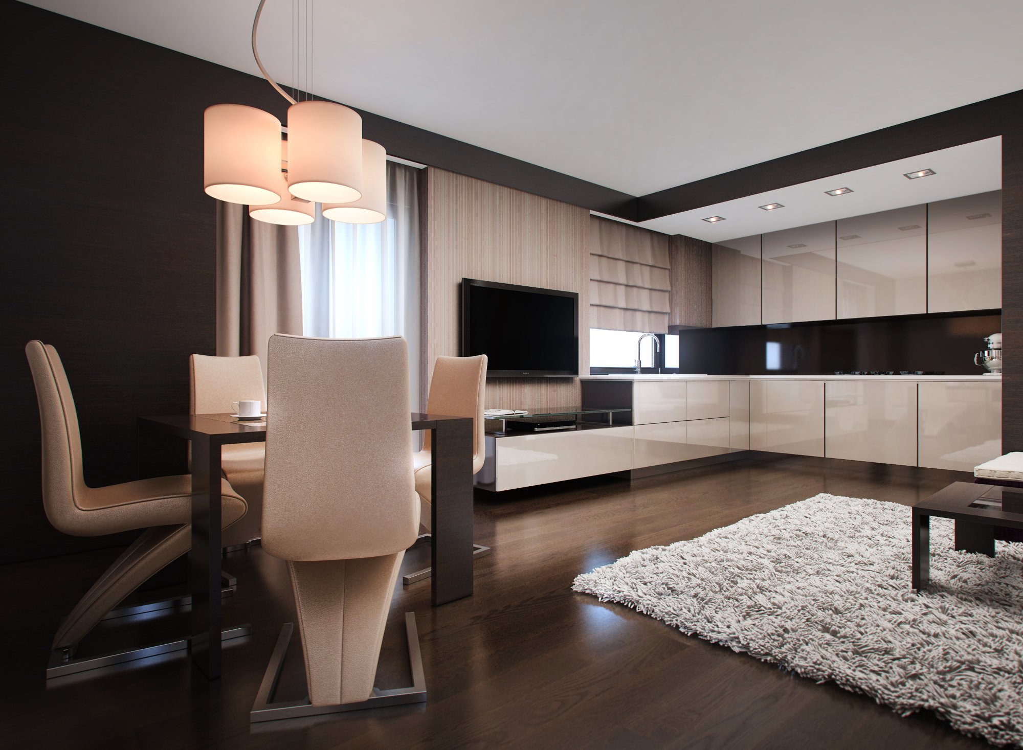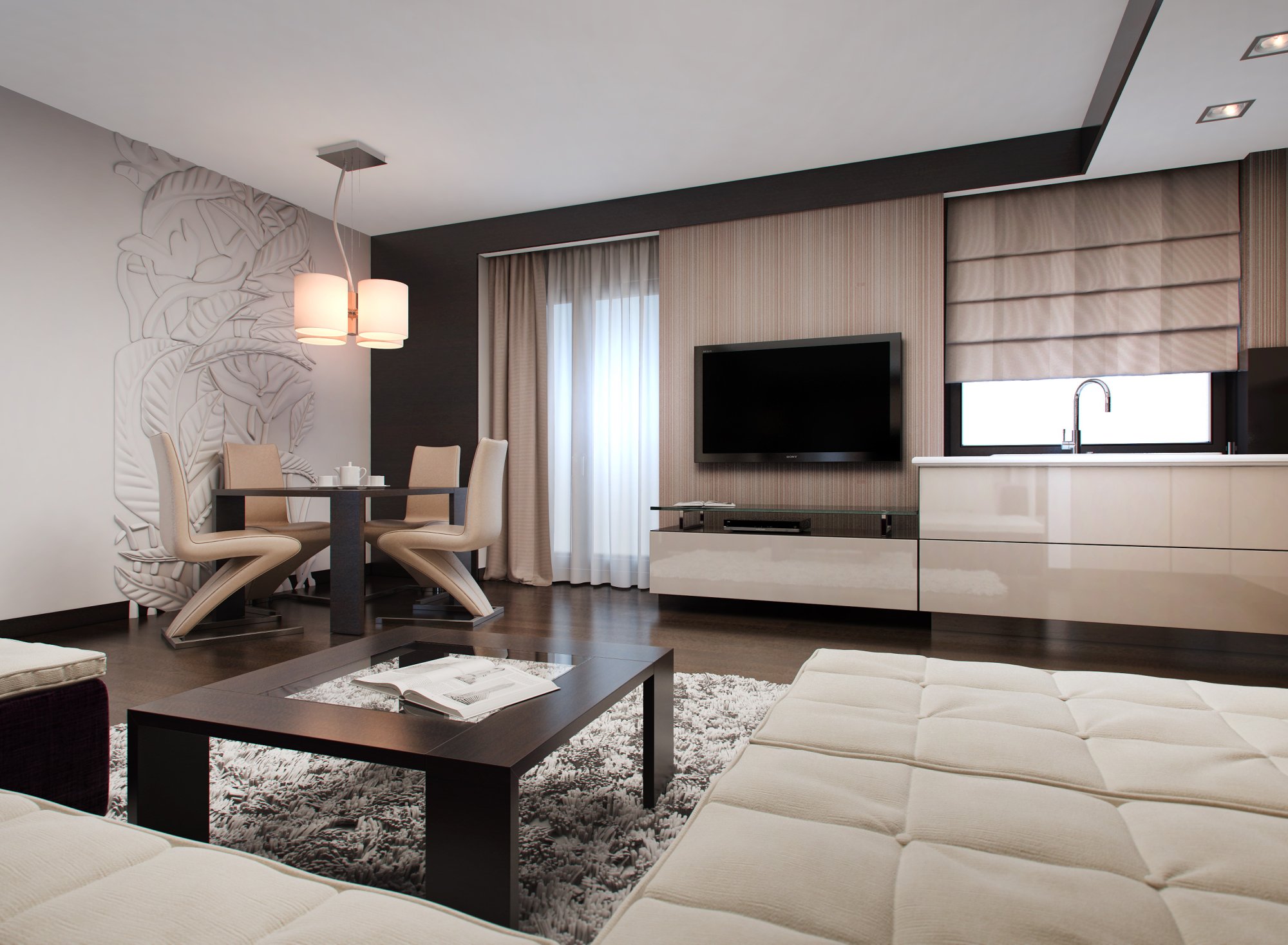 В цветовой палитре дизайна интерьера квартиры выбор сделан в пользу популярного сочетания венге и беж.
