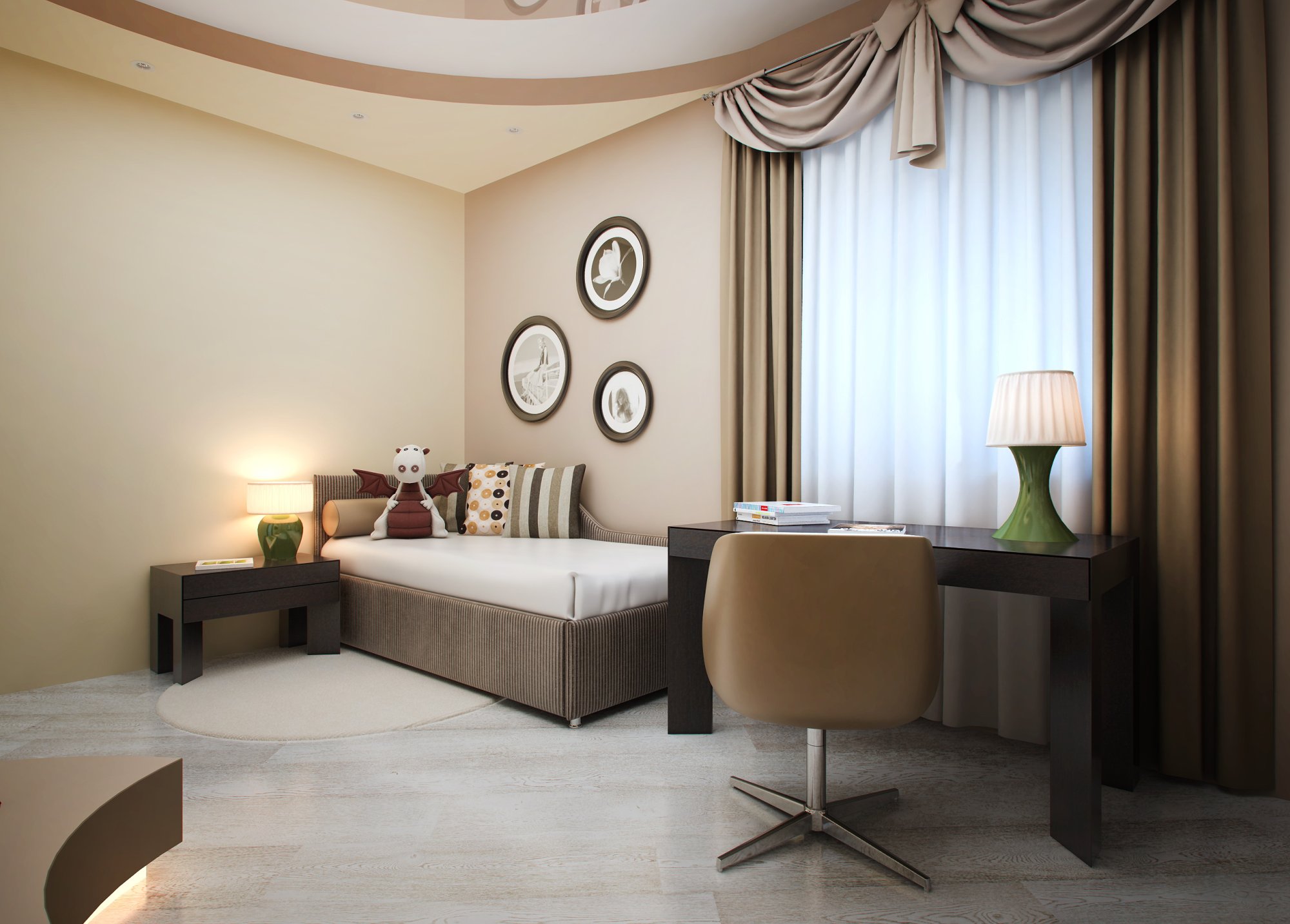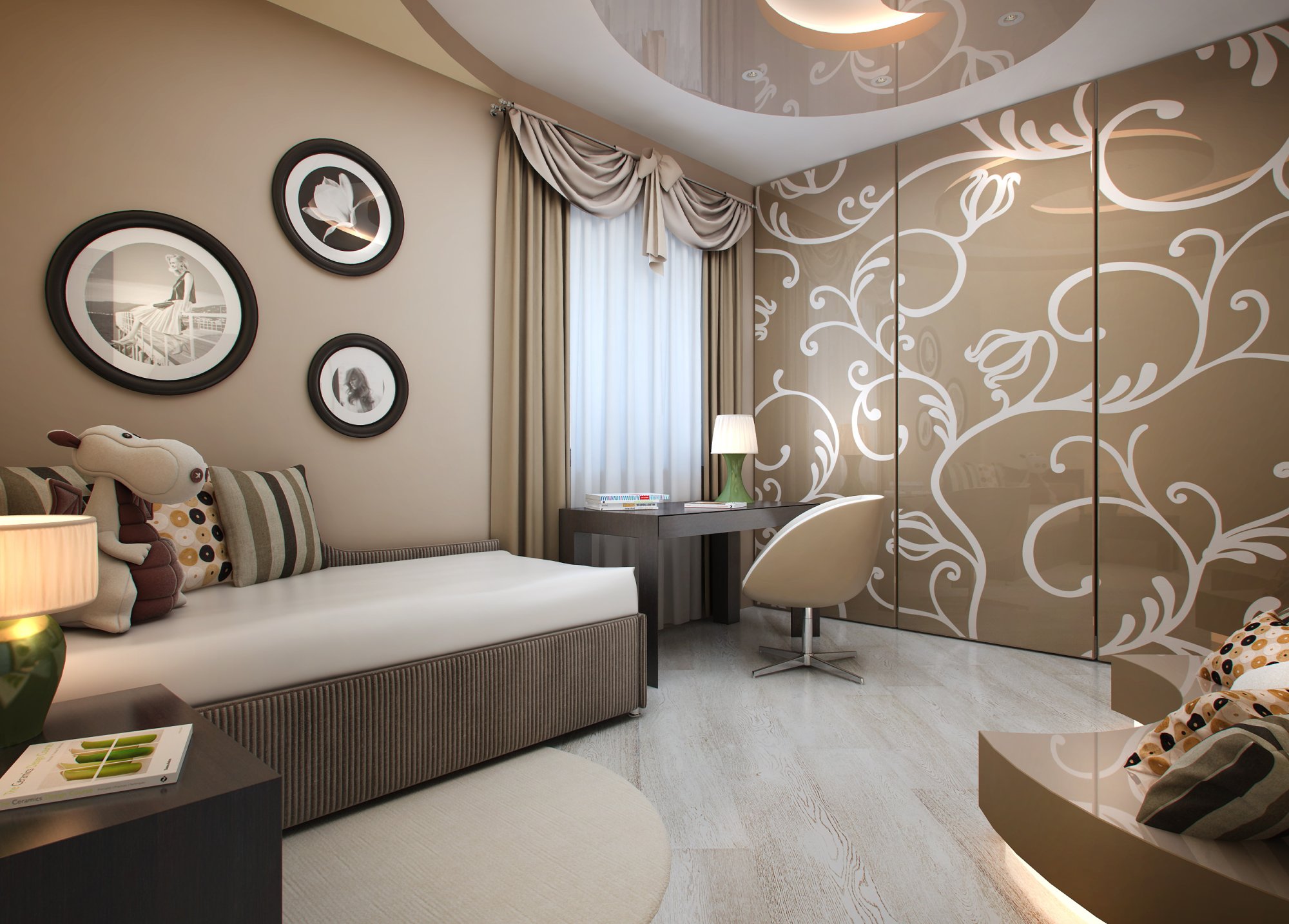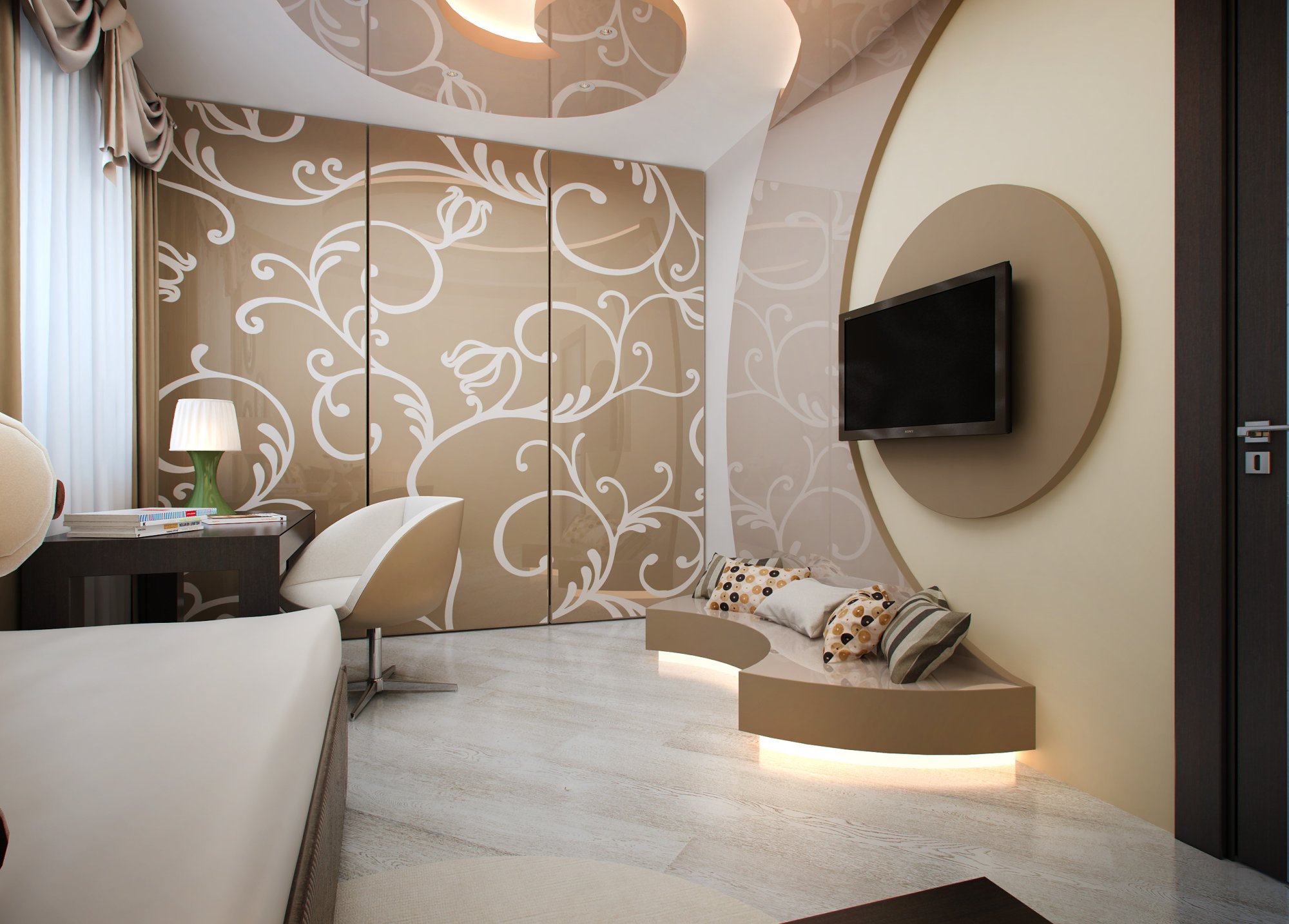 В оформлении детской комнаты идею объемных элементов на потолке и стене подсказал орнамент платяного шкафа. Под зоной ТВ расположилась фигурная подставка – место для отдыха.