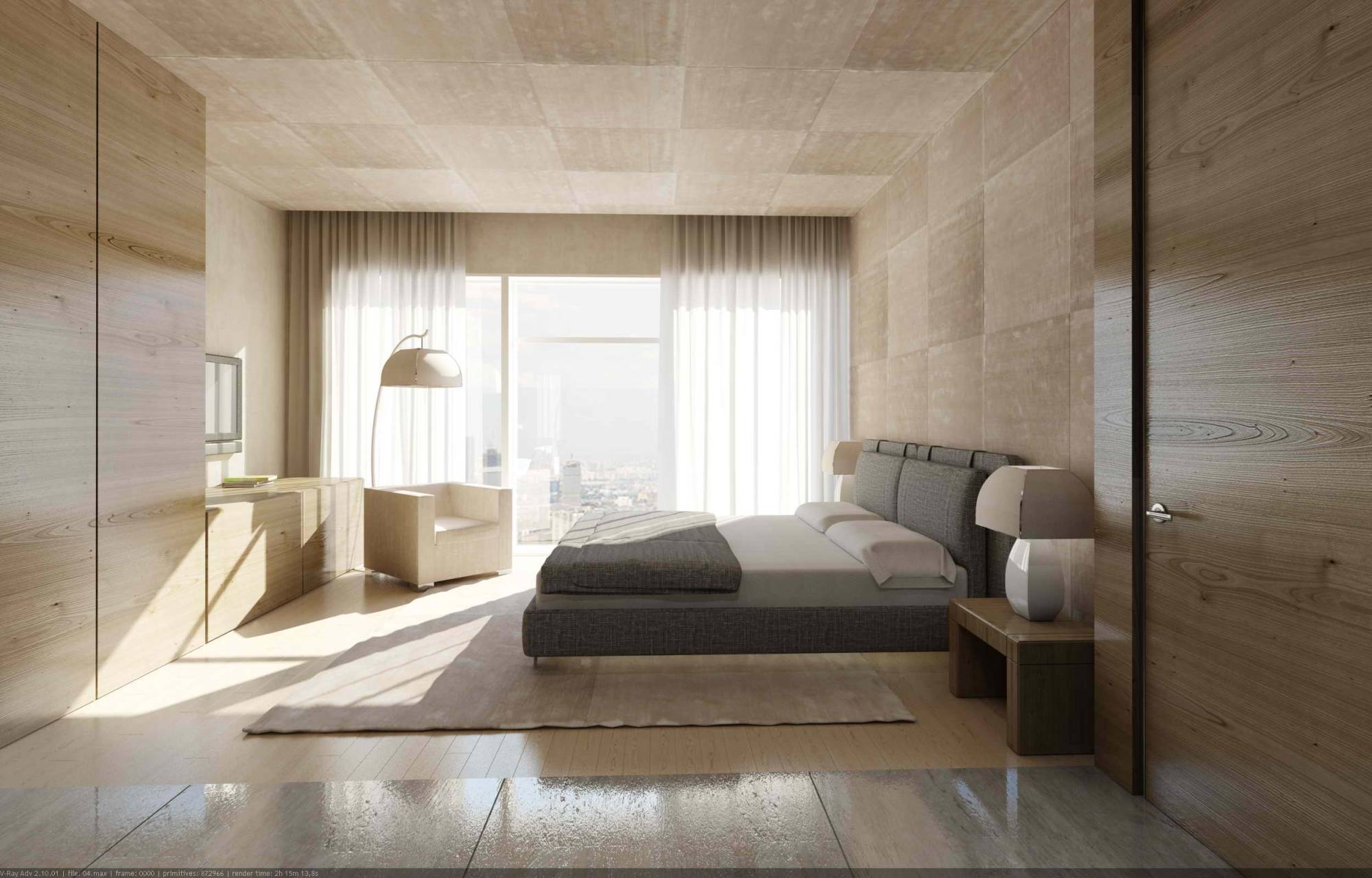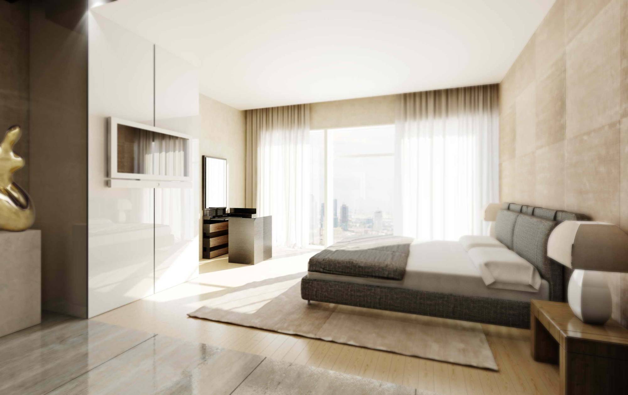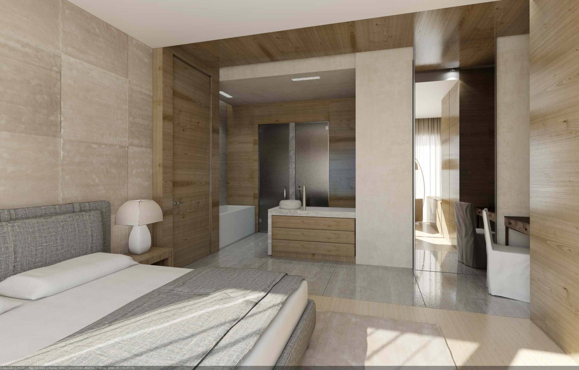 В интерьере спальни оригинальным решением можно назвать отсутствие каких-либо перегородок с зоной ванны. Купель и умывальник располагаются в глубине комнаты. Подчеркивая единство места, здесь продолжены отделочные и декоративные приемы спального пространства.