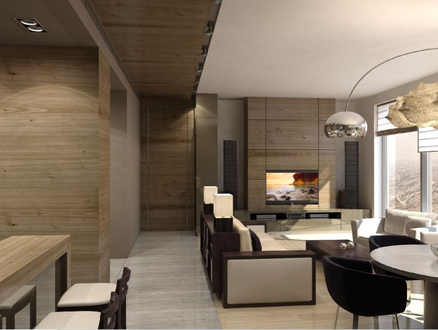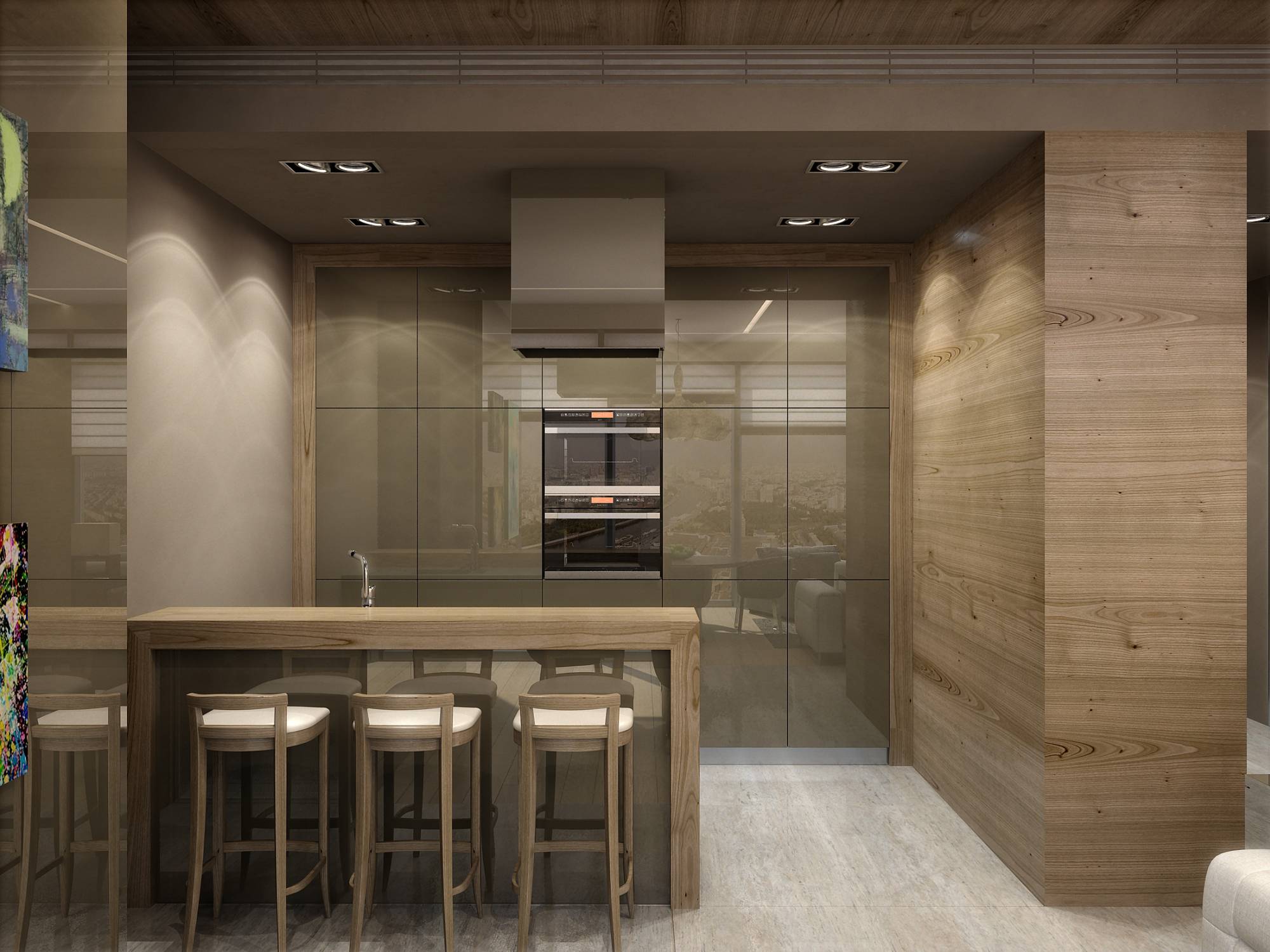 Панорамные окна в гостиной и спальне, декорированные легкими римскими шторами, щедро пропускают свет. А выполненные из одного материала фасады гардеробных шкафов в прихожей, кухонных шкафов, внутренняя сторона барной стойки, объемная настенная конструкция в зоне столовой отражают световые потоки и перекликаются цветом со шпанированной отделкой стен и потолка.