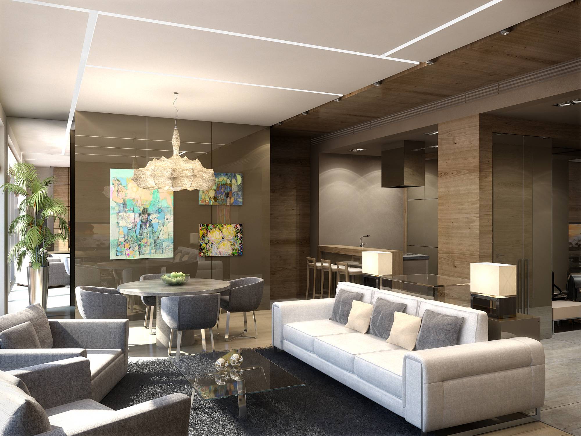 В дизайне преобладают прямые, простые формы. Их немногословность уравновешивают абстрактные картины, живые цветы и светильник фантазийной формы над обеденным столом.