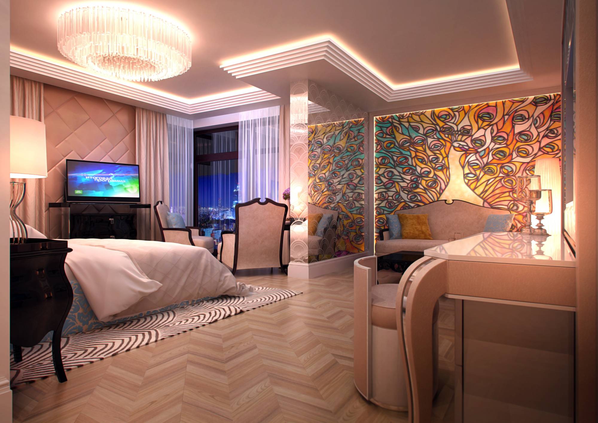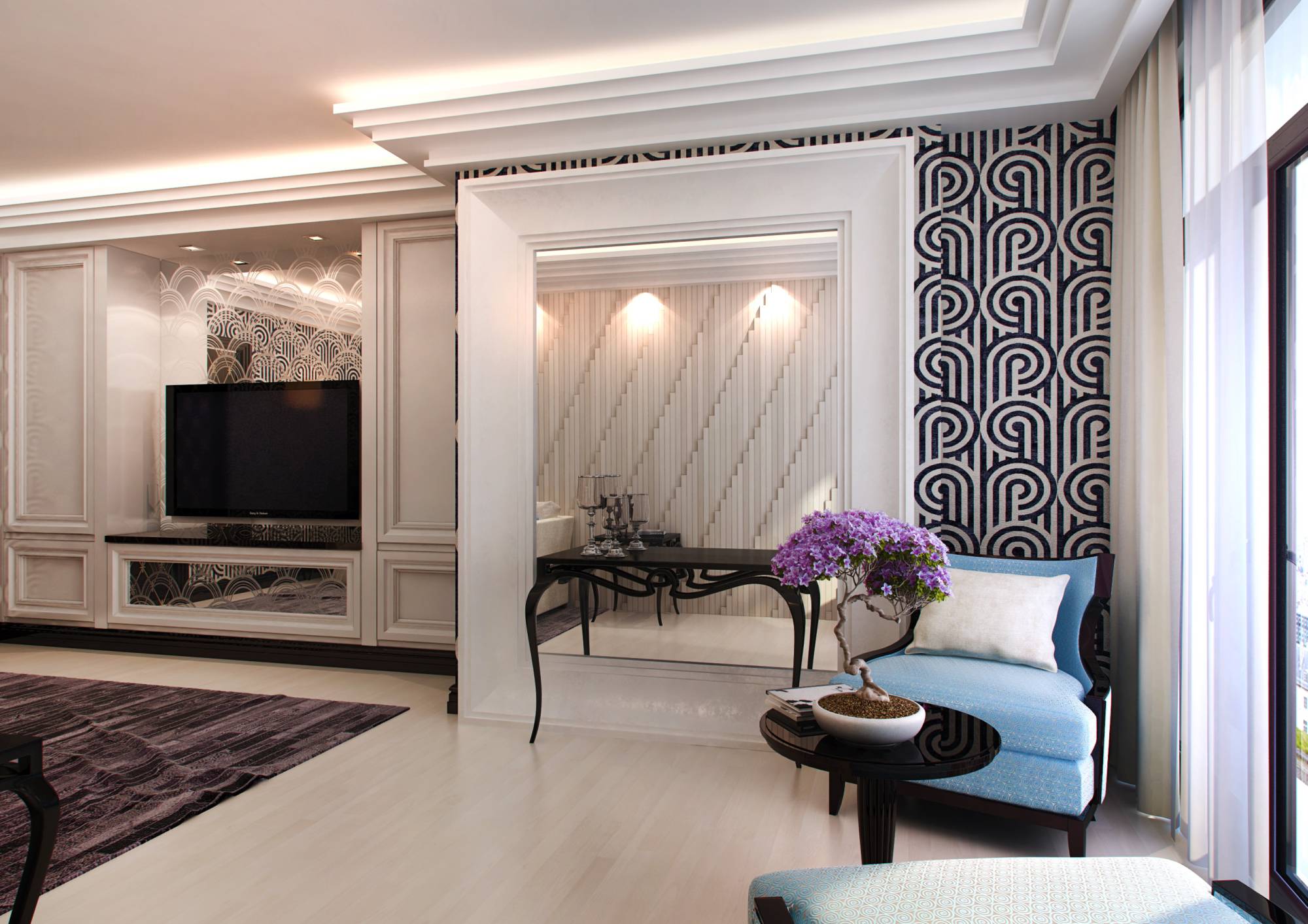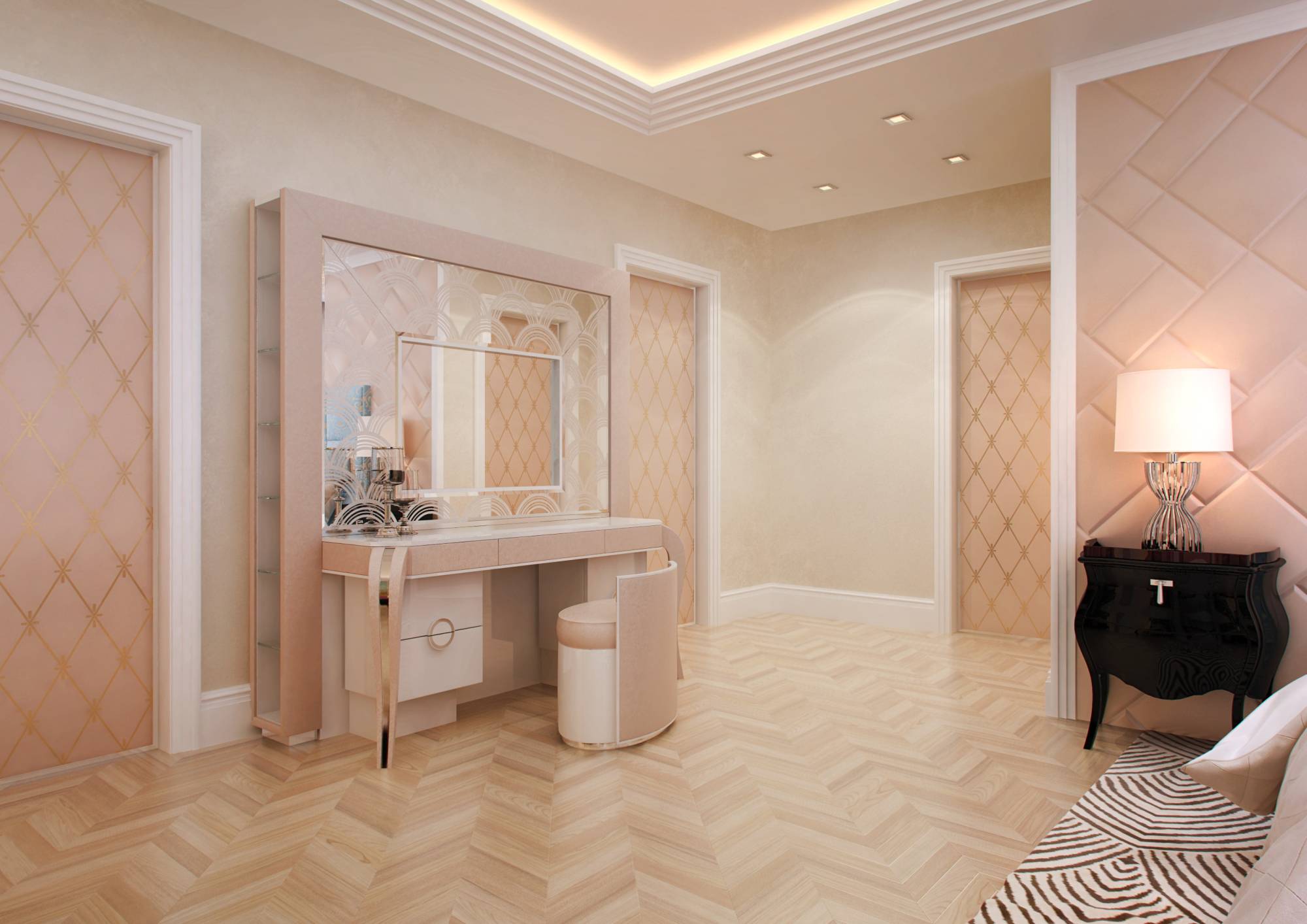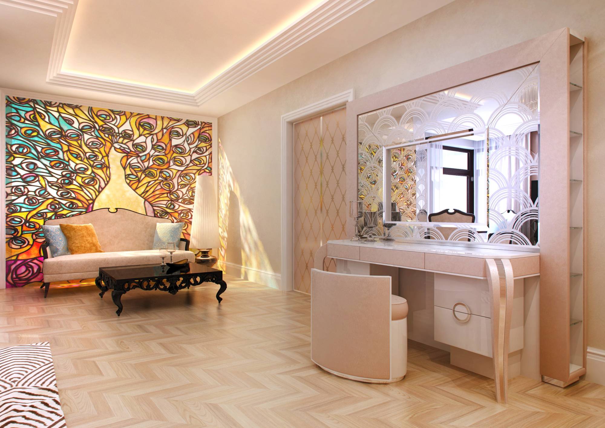 Зона отдыха отделена небольшой перегородкой, орнамент которой повторяет гравировка зеркала туалетного столика. Благодаря различным светильникам возможно несколько сценариев освещения.
