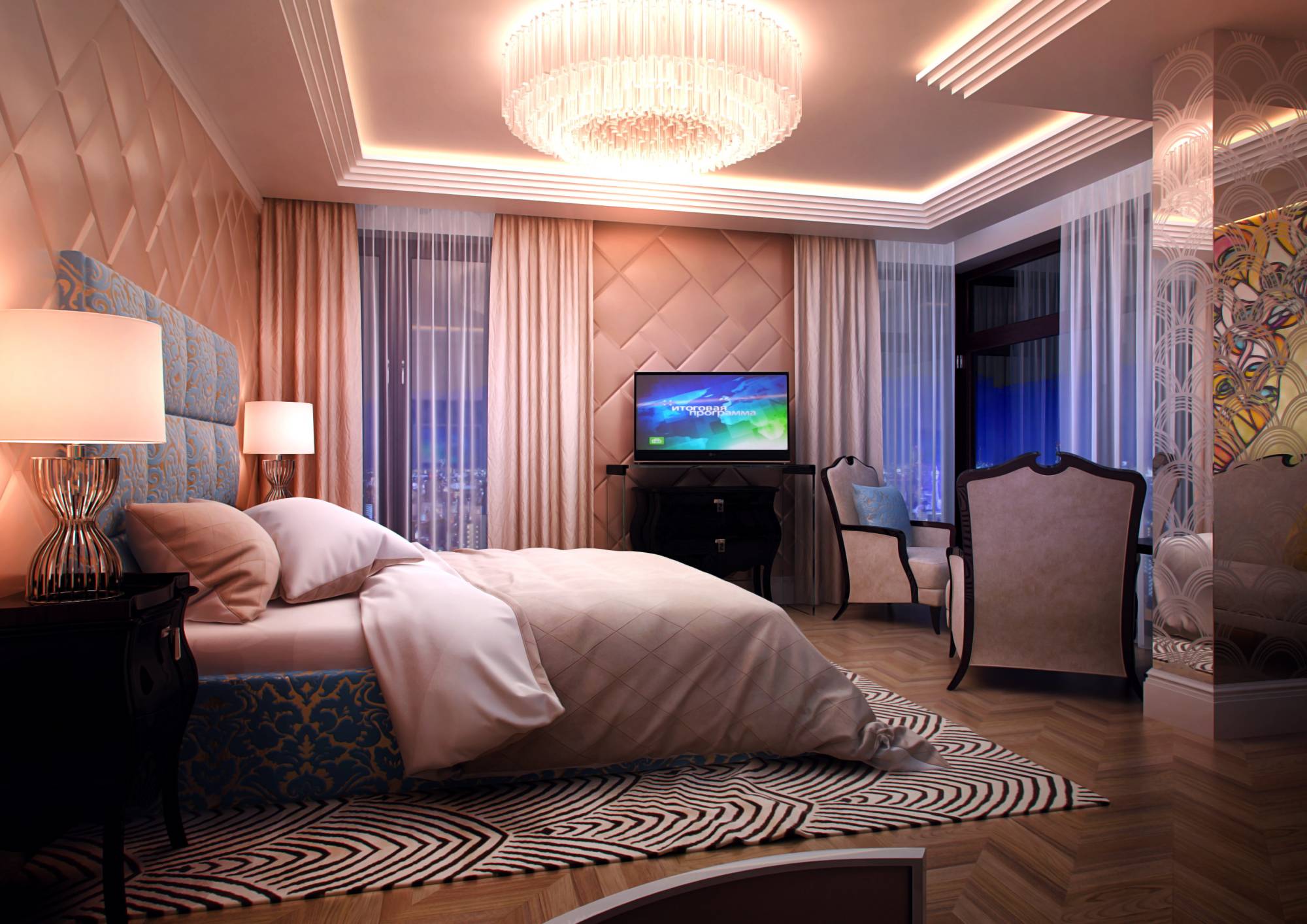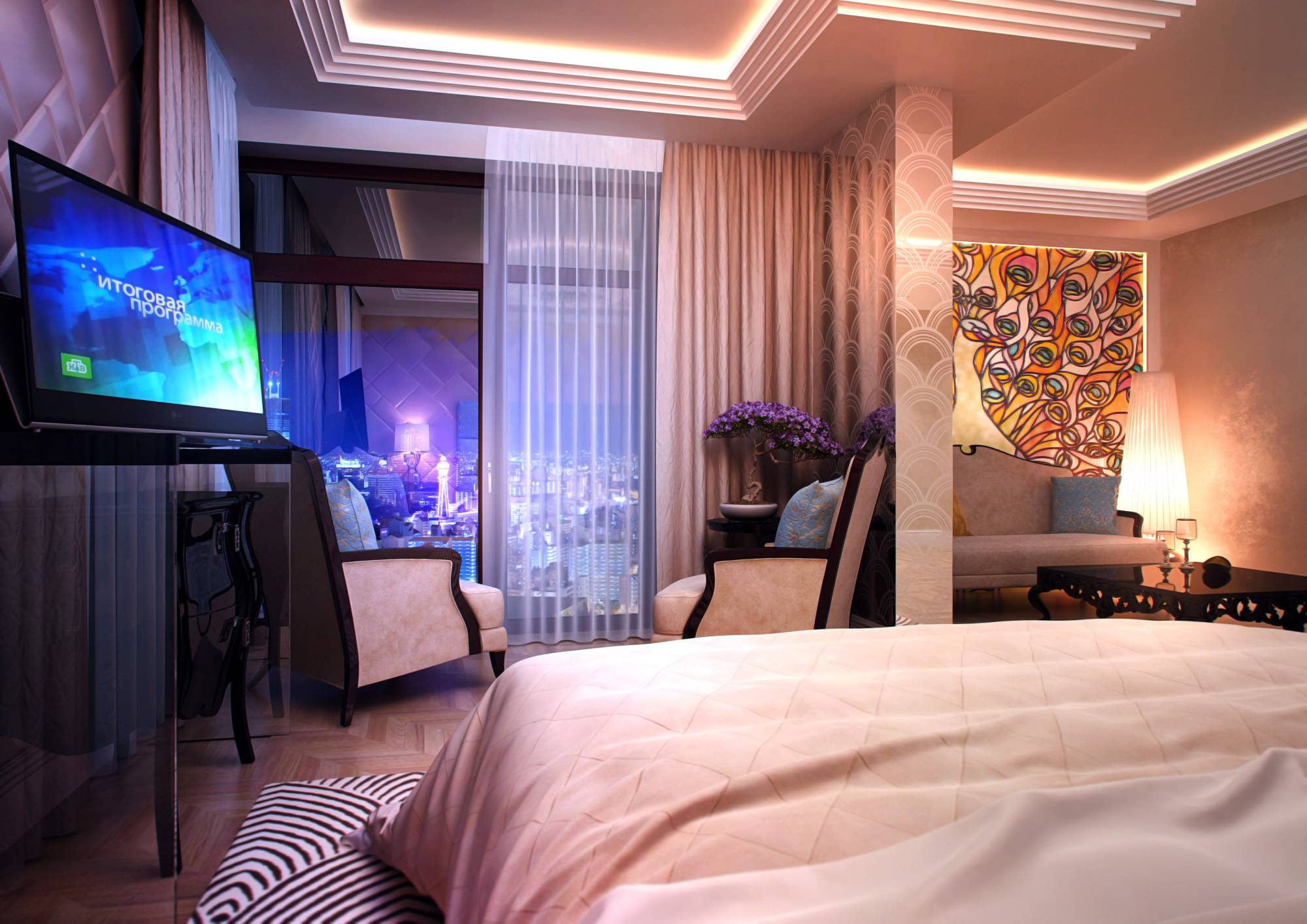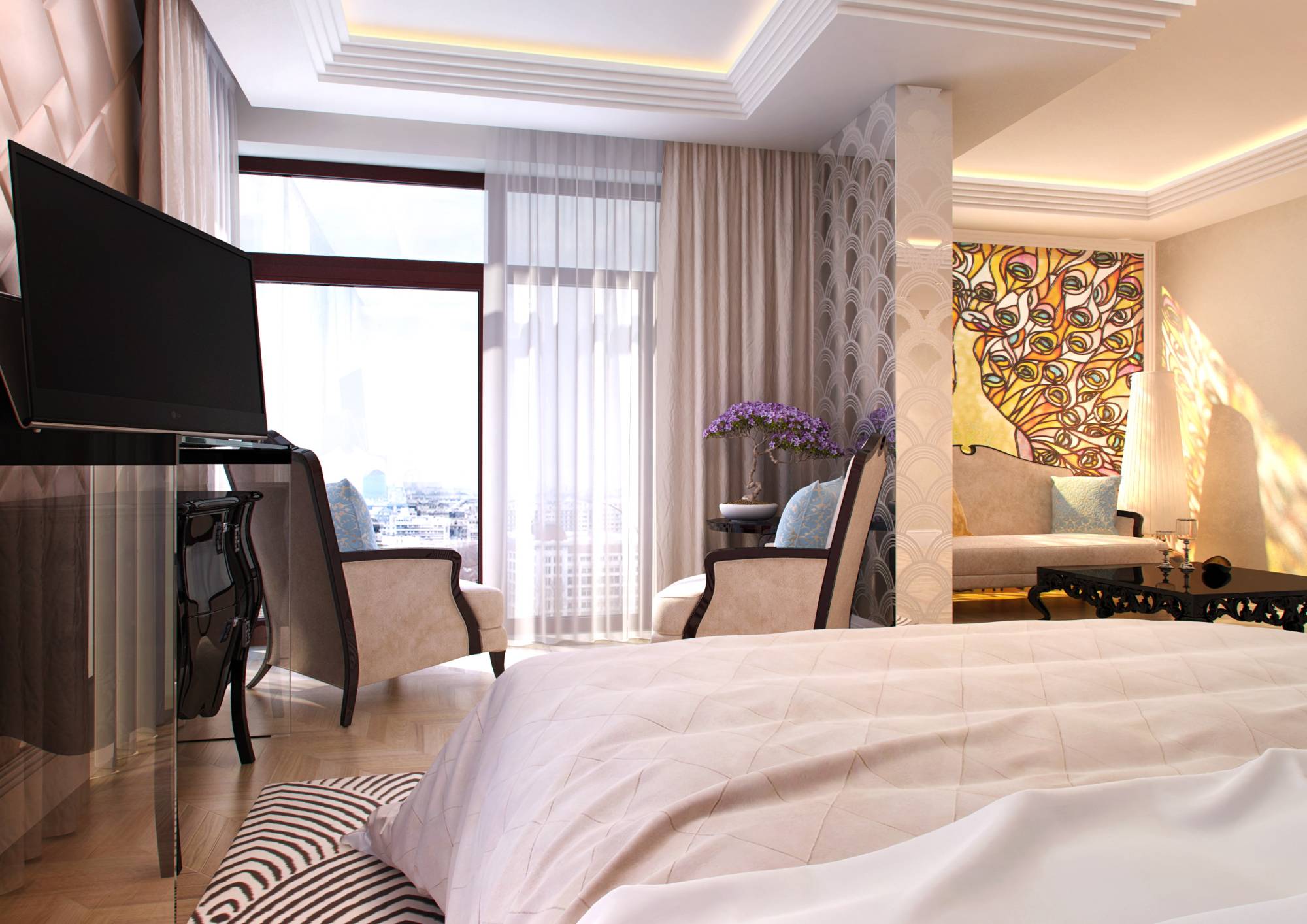 Зона отдыха отделена небольшой перегородкой, орнамент которой повторяет гравировка зеркала туалетного столика. Благодаря различным светильникам возможно несколько сценариев освещения.