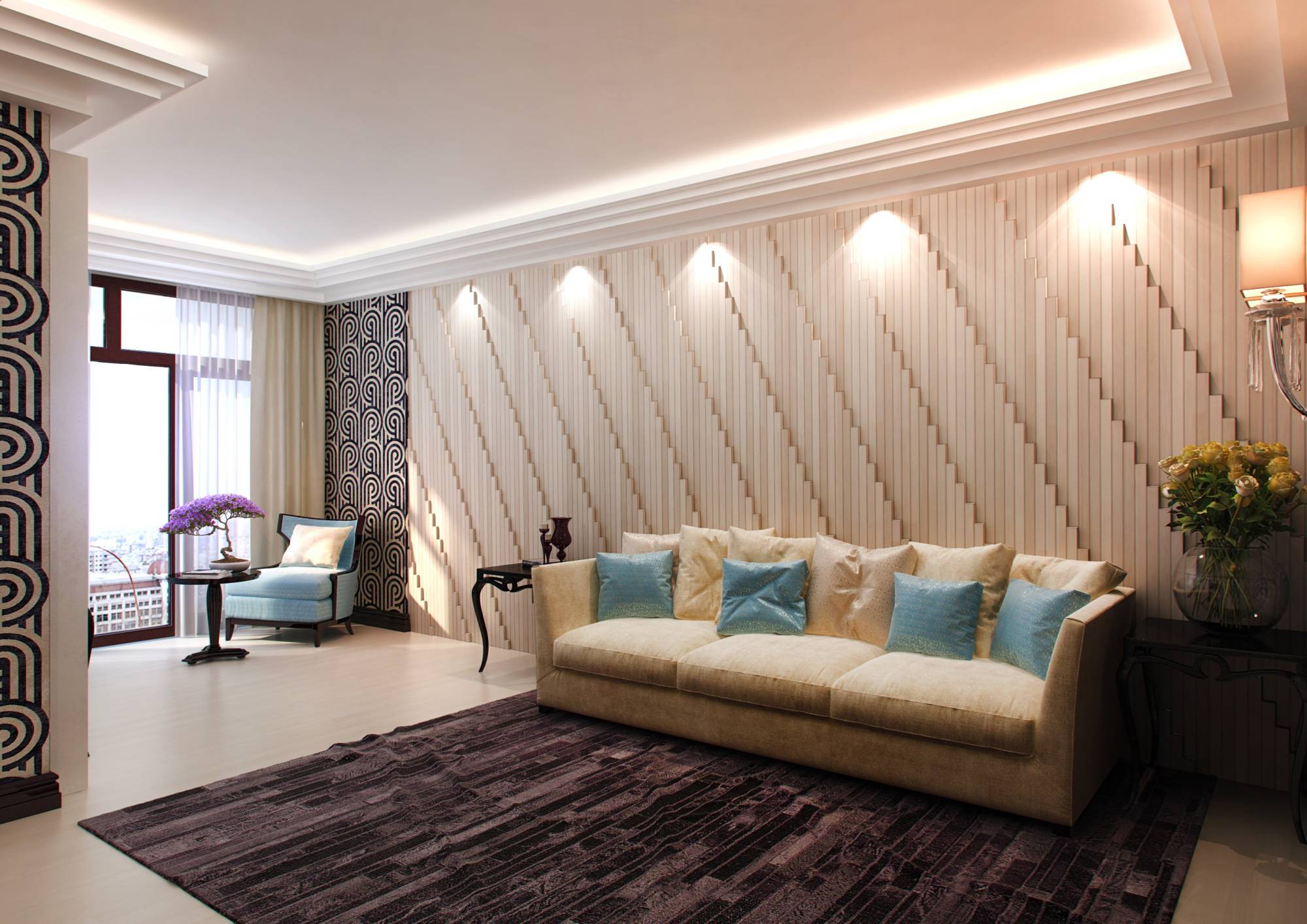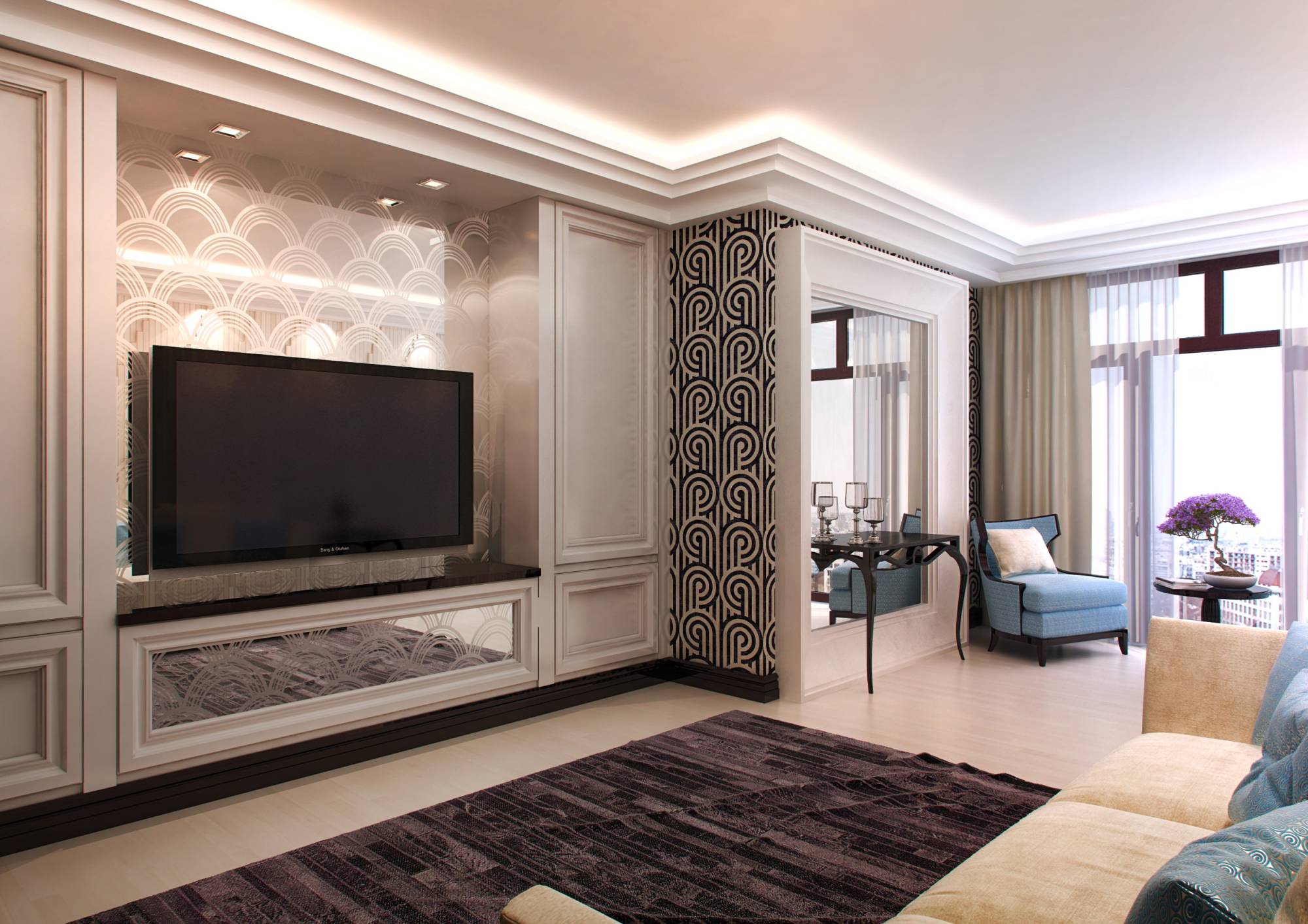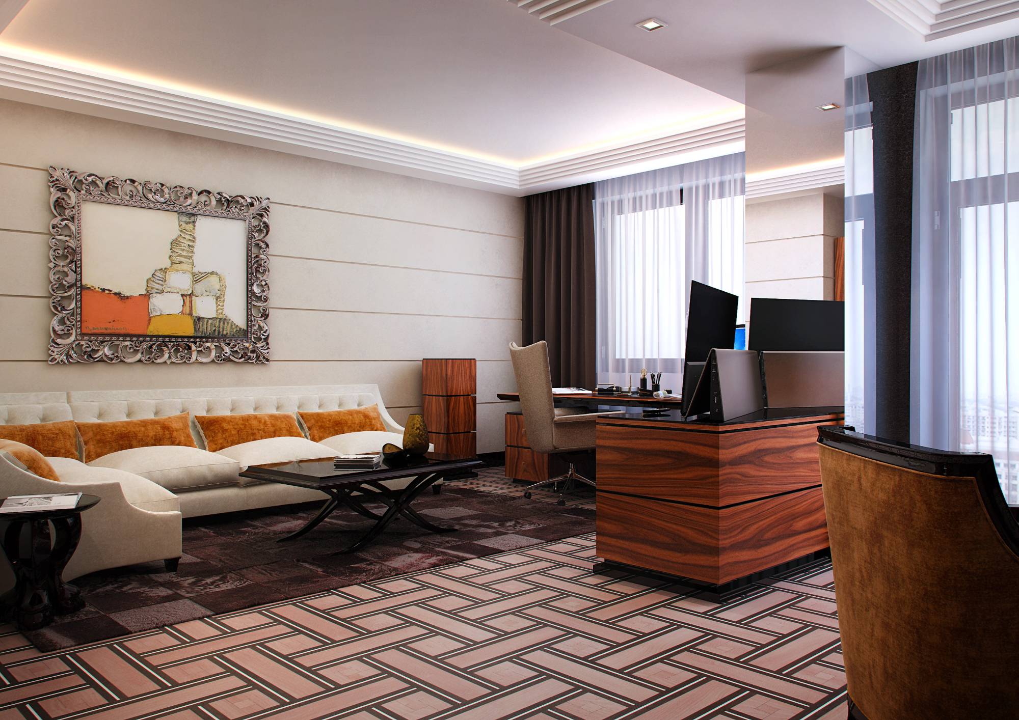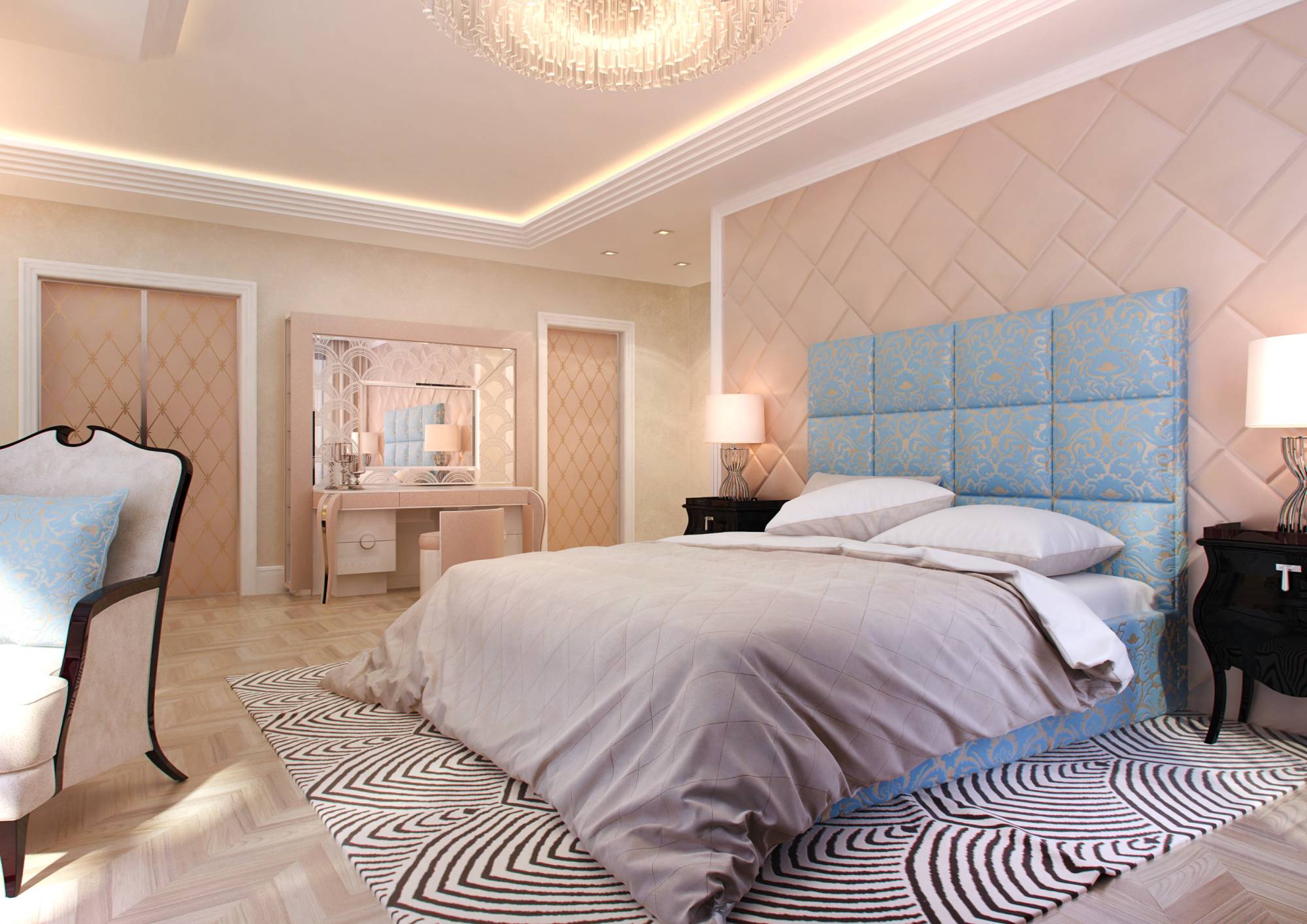 Зона отдыха отделена небольшой перегородкой, орнамент которой повторяет гравировка зеркала туалетного столика. Благодаря различным светильникам возможно несколько сценариев освещения.