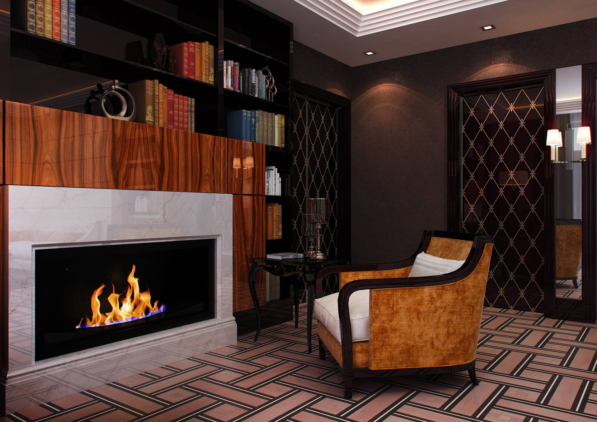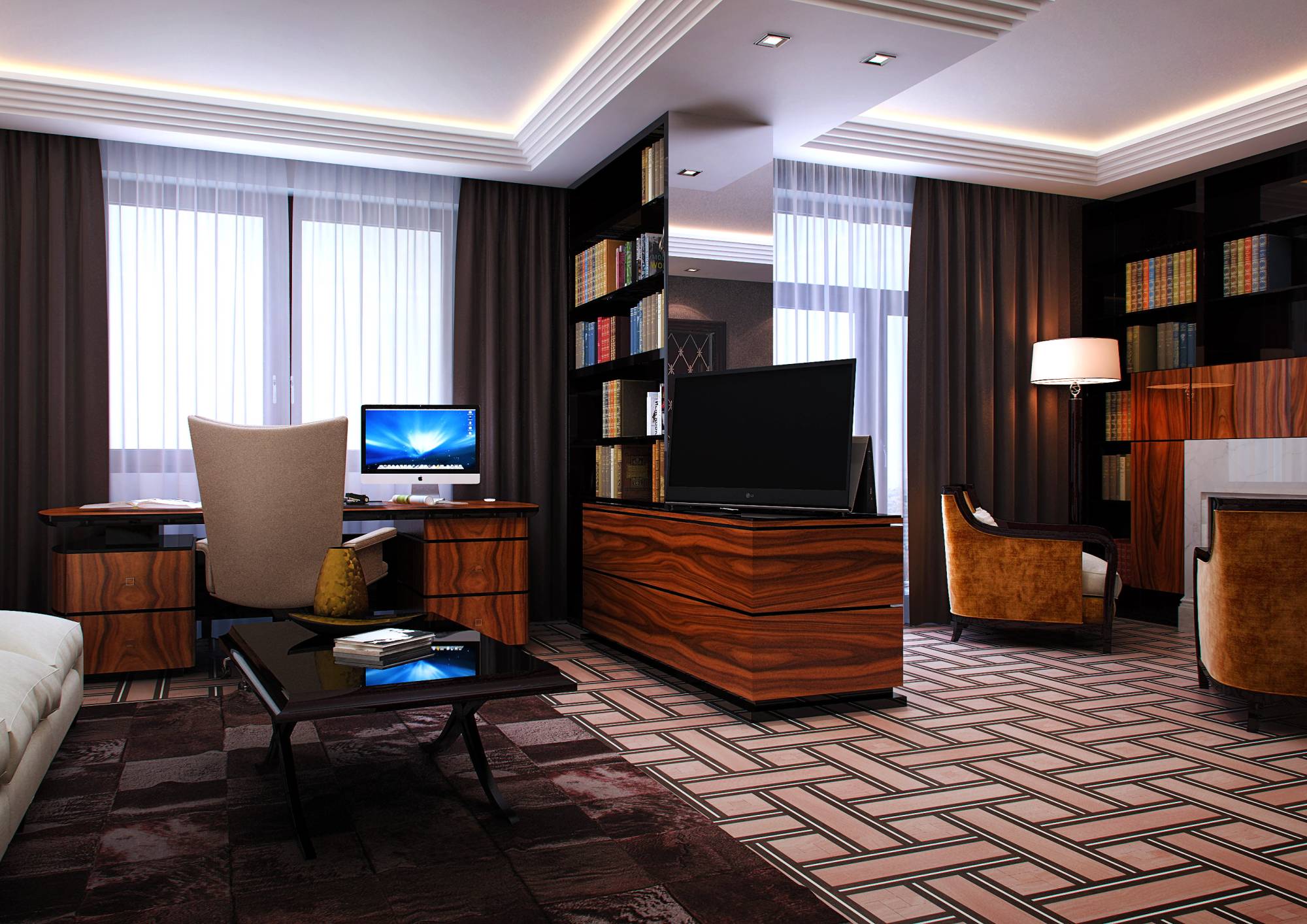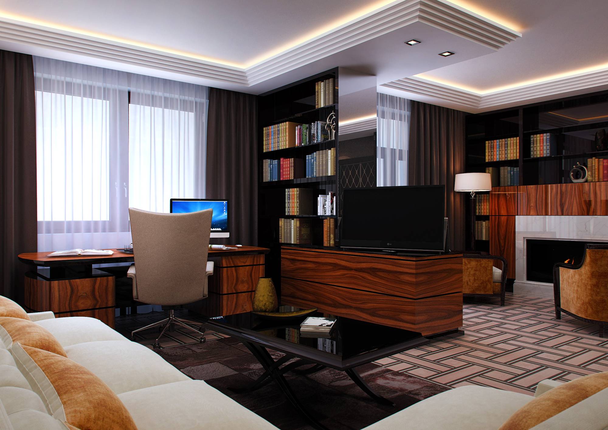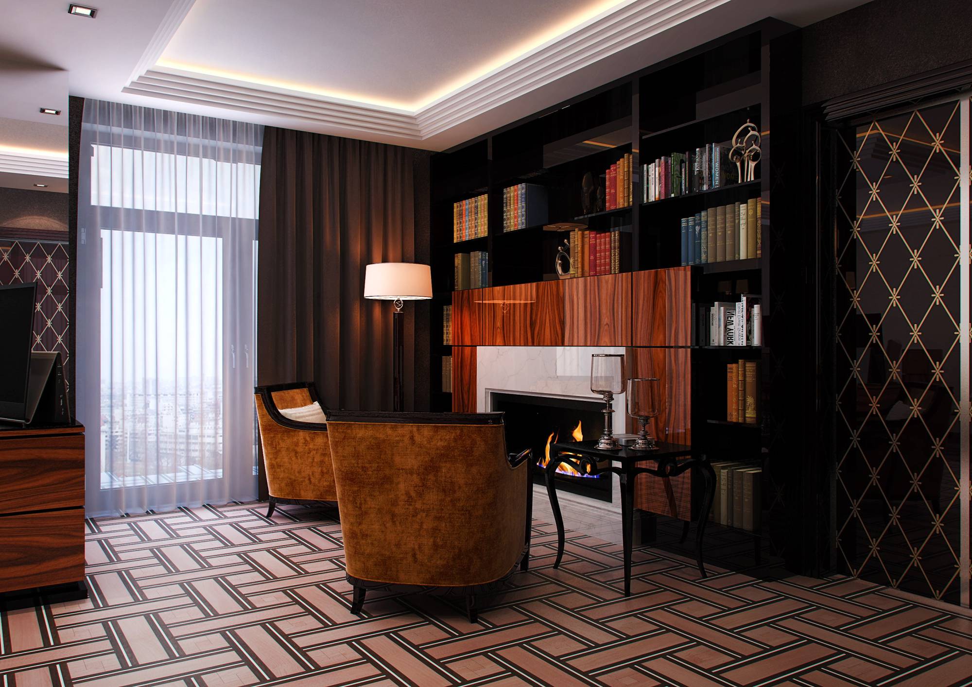 Не менее просторный, чем другие комнаты, кабинет выдержан в темных и коричневых тонах. Особенно эффектна каминная группа в сочетании с библиотекой. Материалы – мрамор и натуральное дерево.