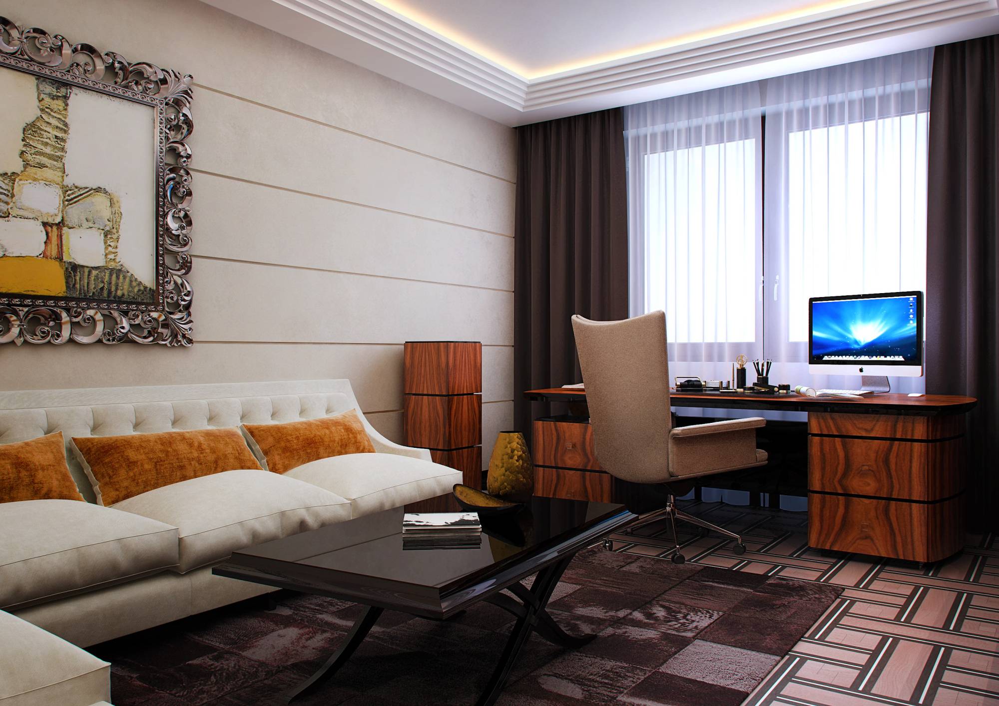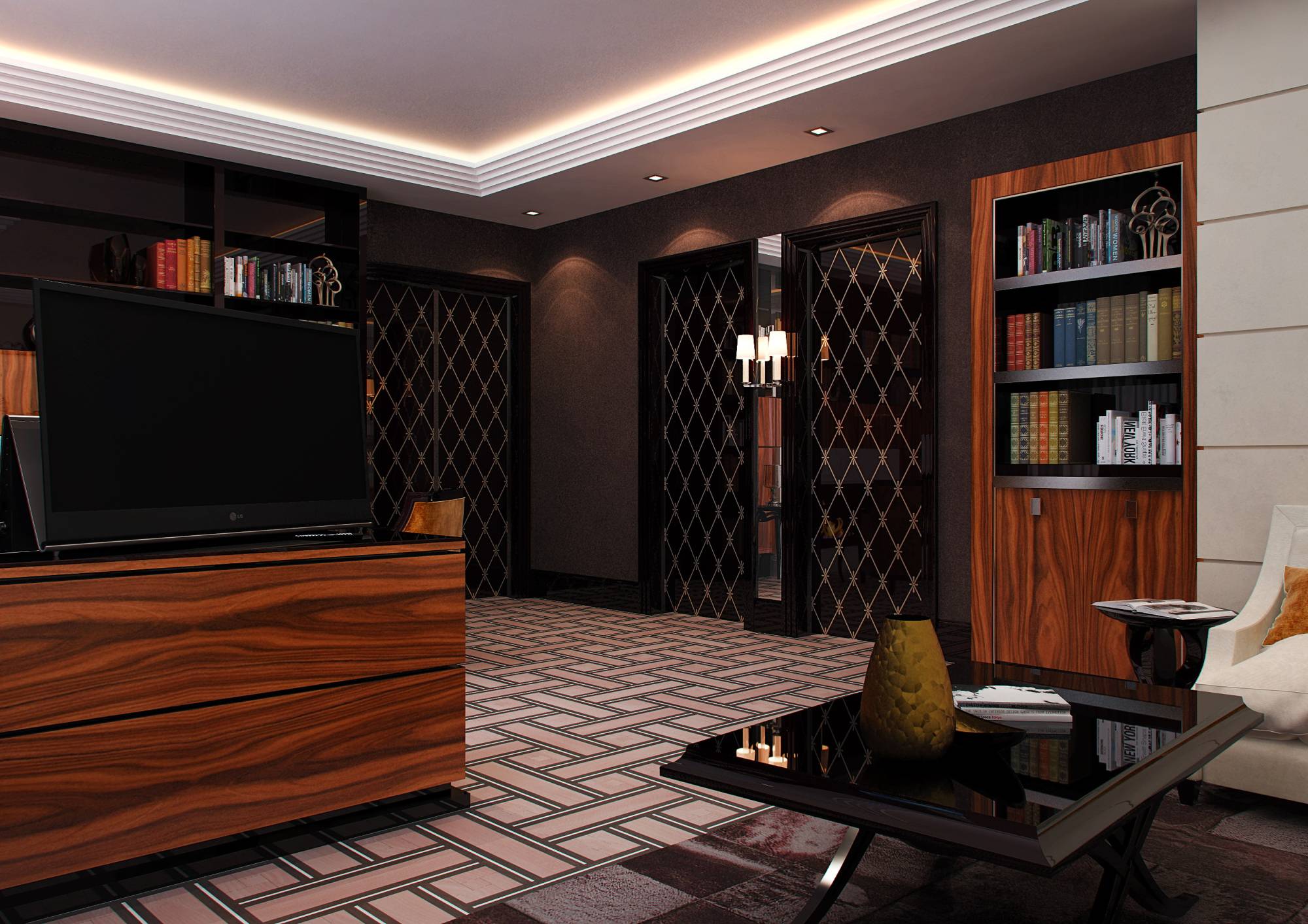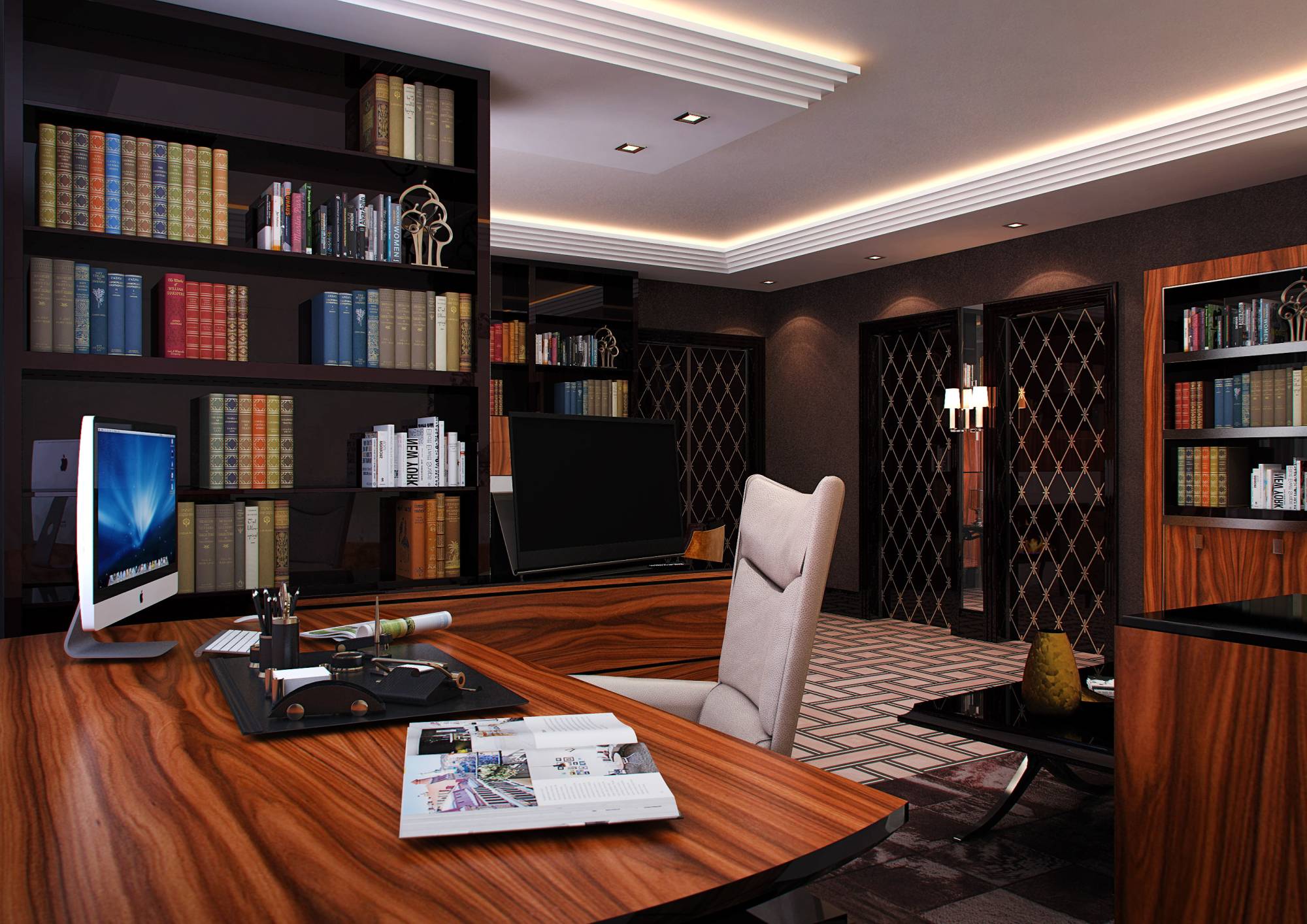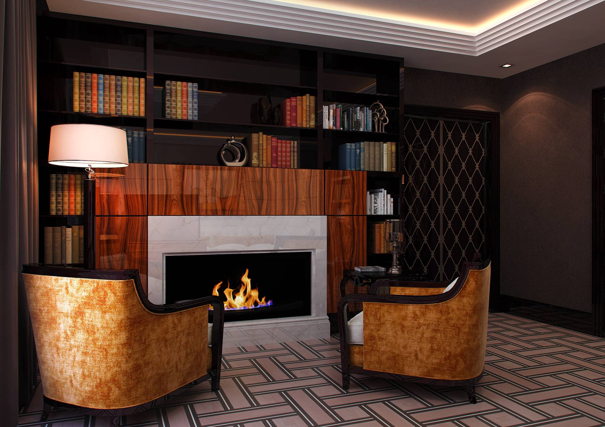 Не менее просторный, чем другие комнаты, кабинет выдержан в темных и коричневых тонах. Особенно эффектна каминная группа в сочетании с библиотекой. Материалы – мрамор и натуральное дерево.