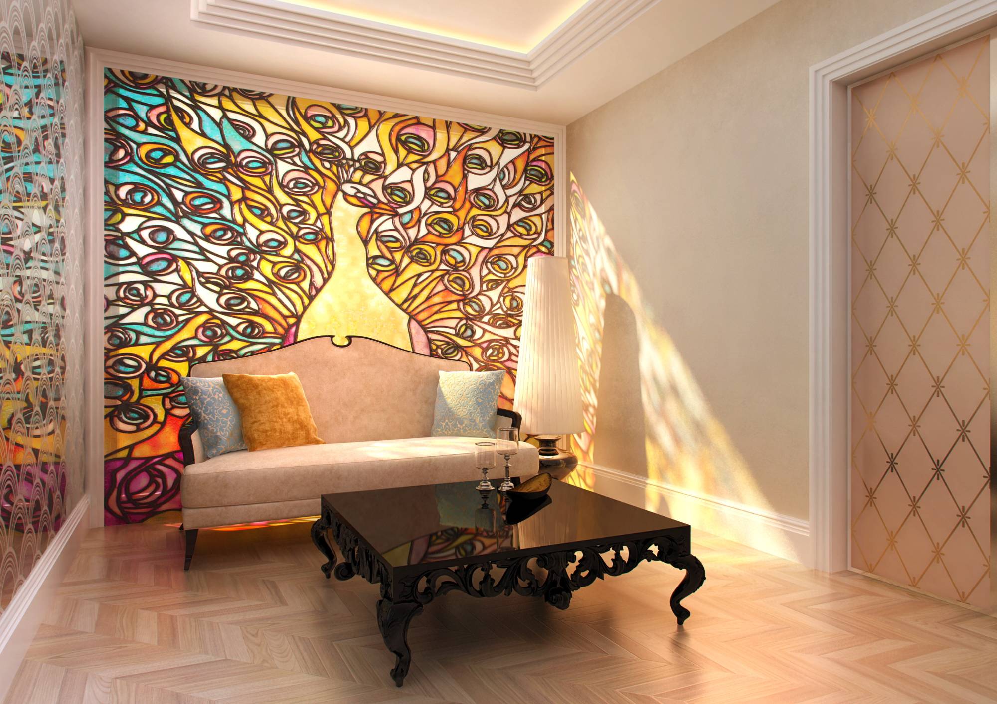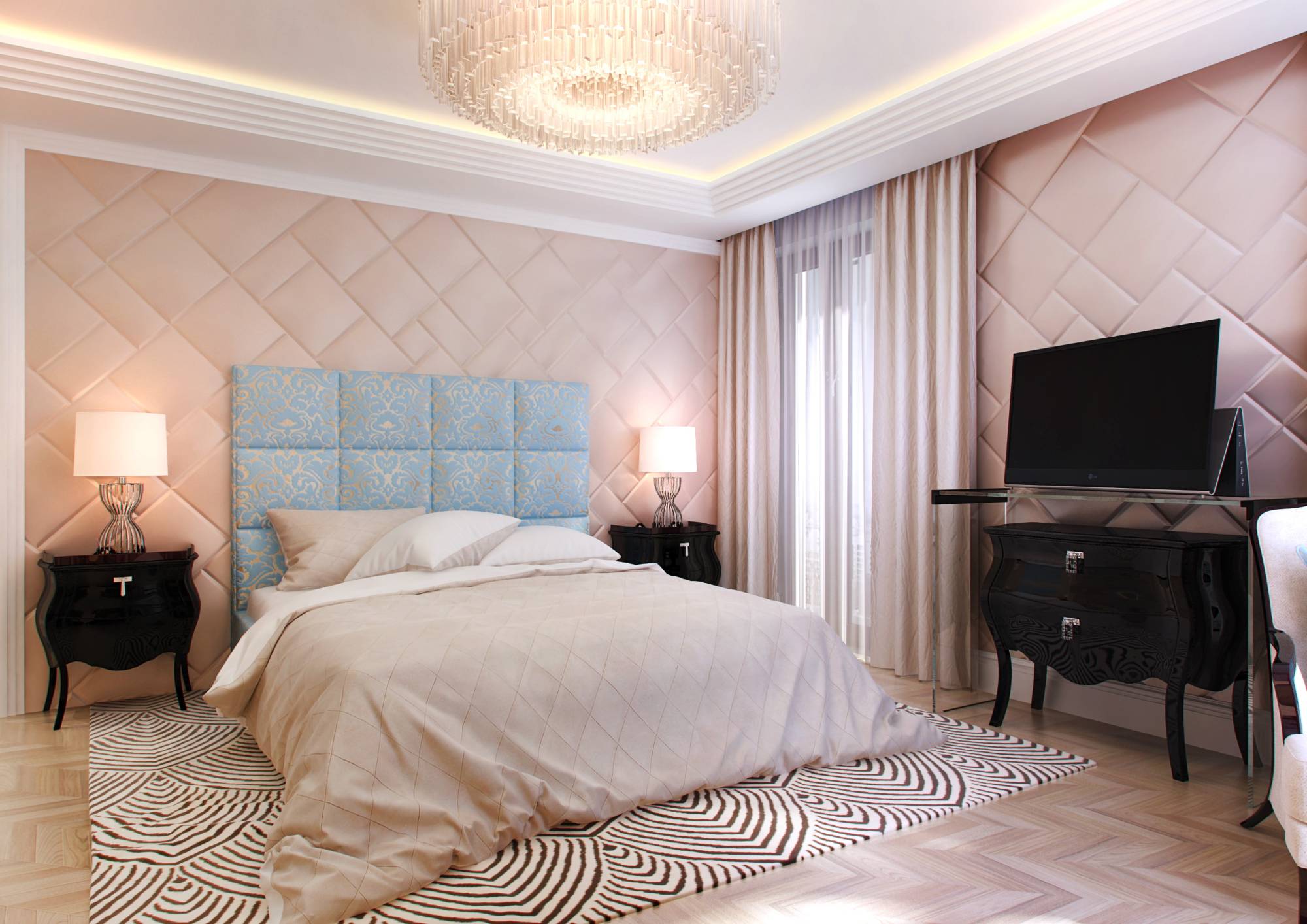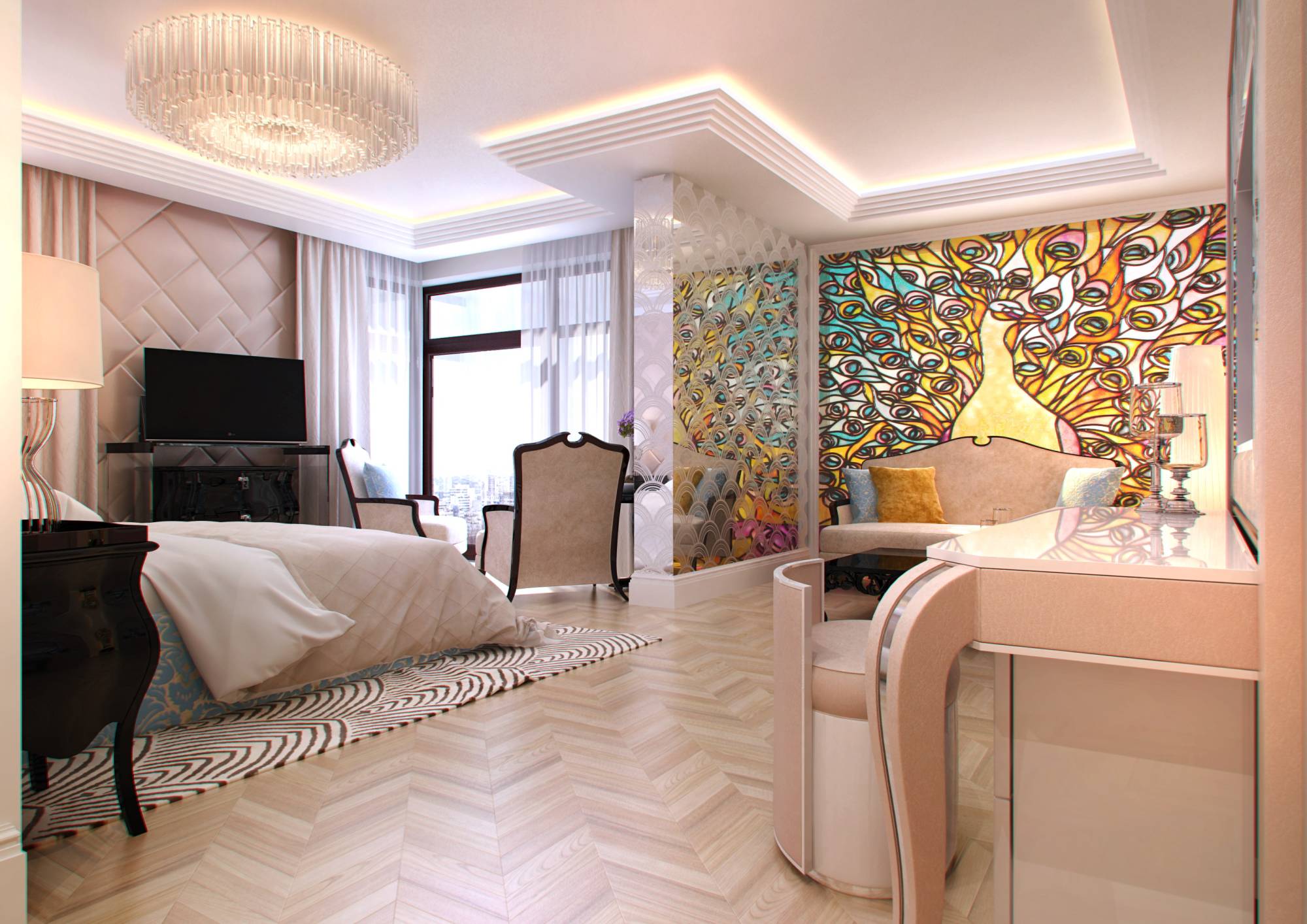 Нежное сочетание голубых и бежевых тонов передает спальне умиротворенное настроение. Особое внимание привлекает высокое изголовье кровати. В спальне, как и во всей квартире, много света. Одно из окон украшено витражом с яркой жар-птицей.