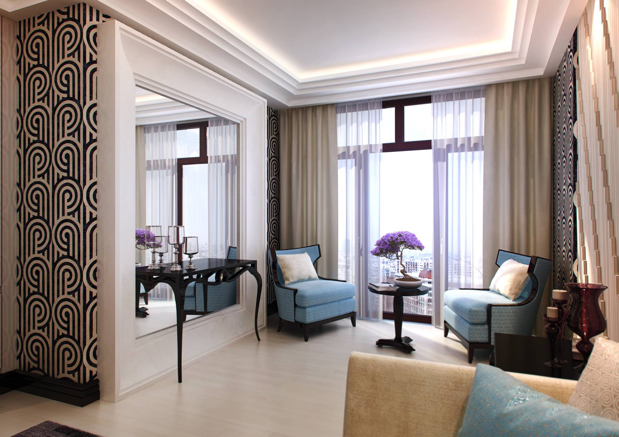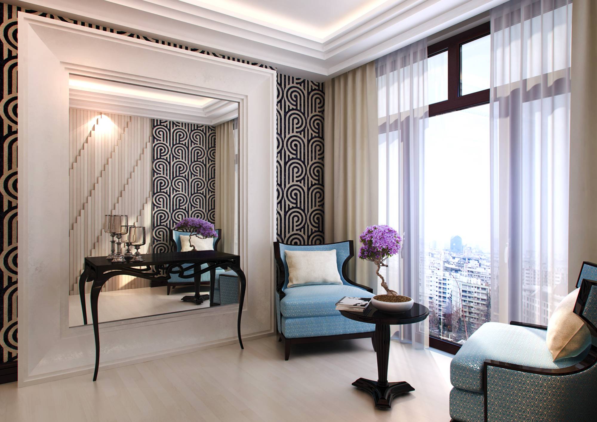 Свет и объем второй гостиной подчеркивается высокими окнами от пола и огромным зеркалом. Цветовая гамма отчасти перекликается со спальней – бежевый и голубой. Особый уют придают стоящие у окна кресла wing chair – нестареющее воплощение комфорта и достатка.