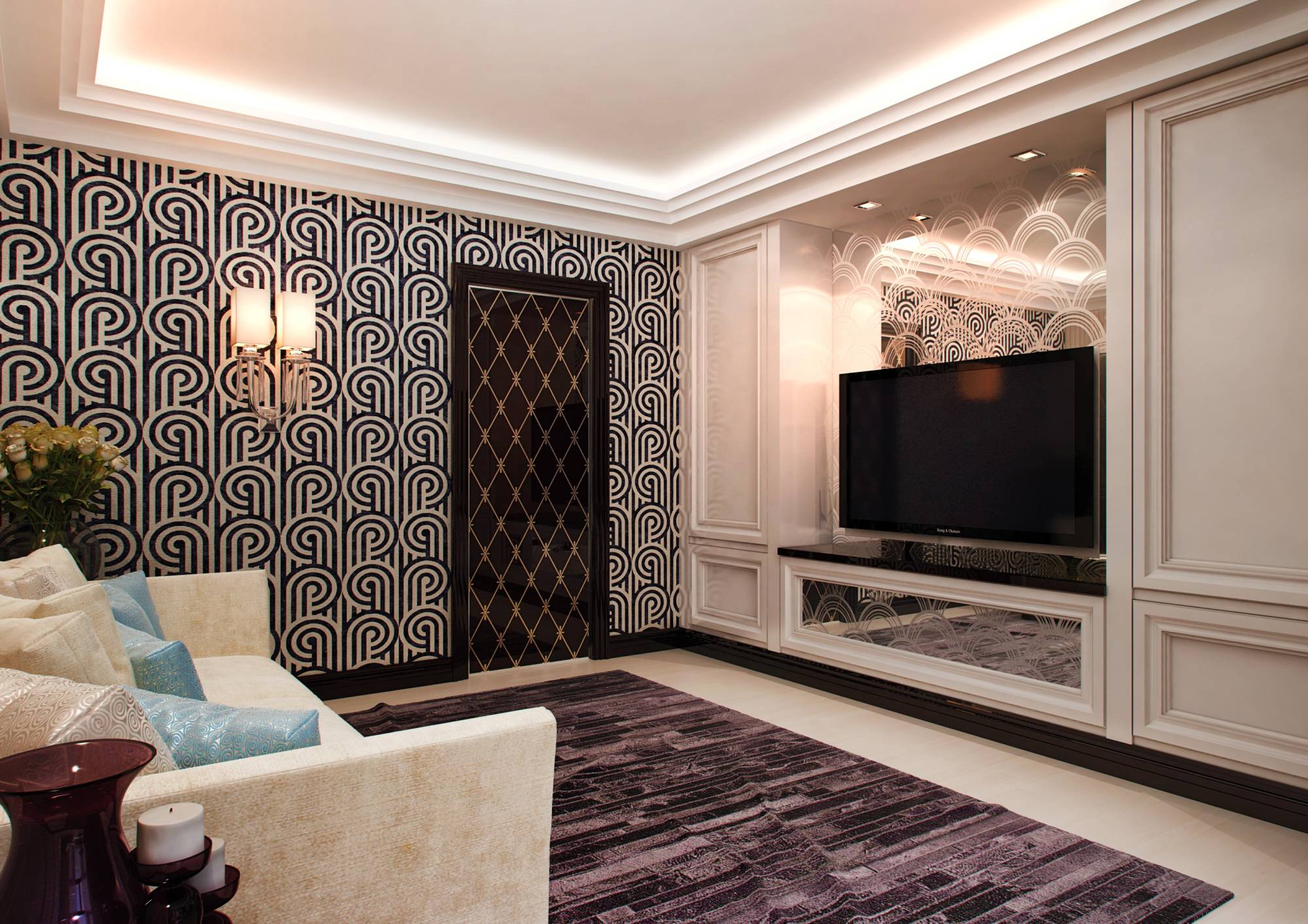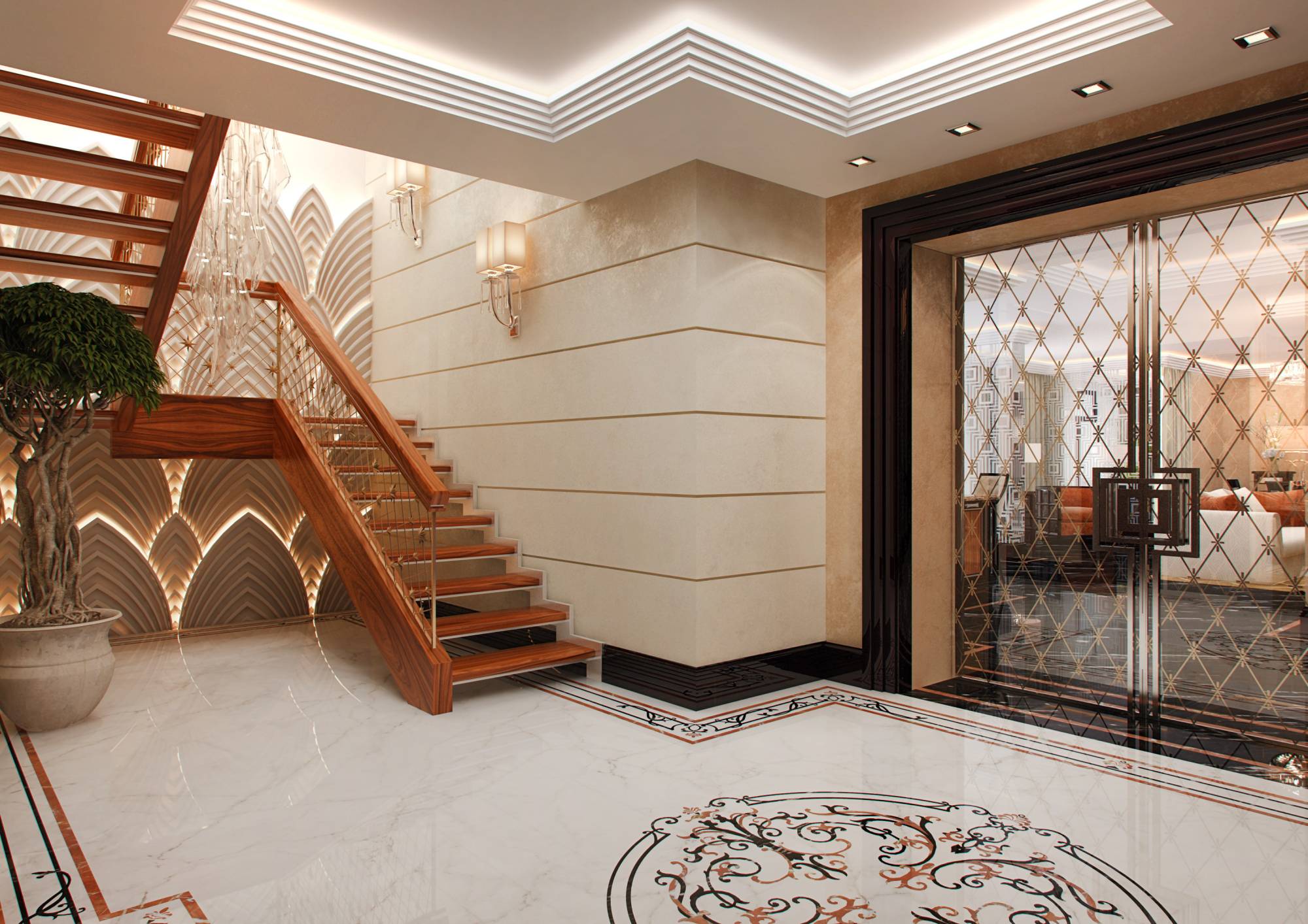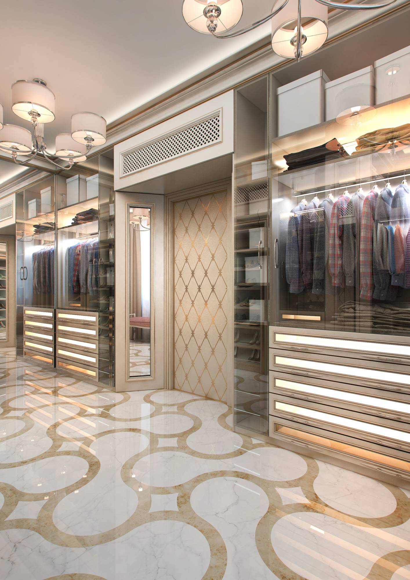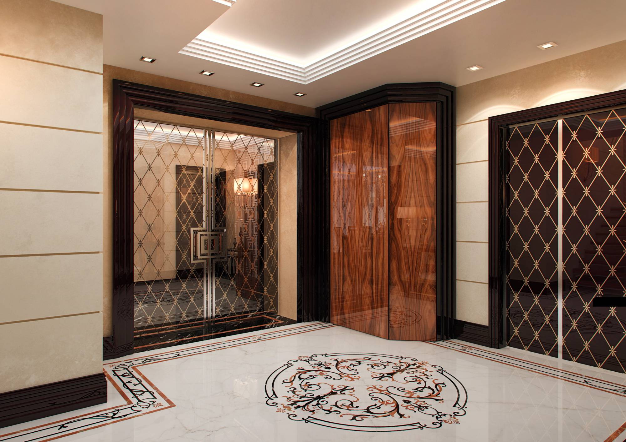 Парадный стиль квартиры задается уже в прихожей. Отделка пола мрамором с причудливым узором, зеркало от пола до потолка, огромная стеклянная дверь в гостиную с орнаментом, повторяющимся на входных и межкомнатных дверях.