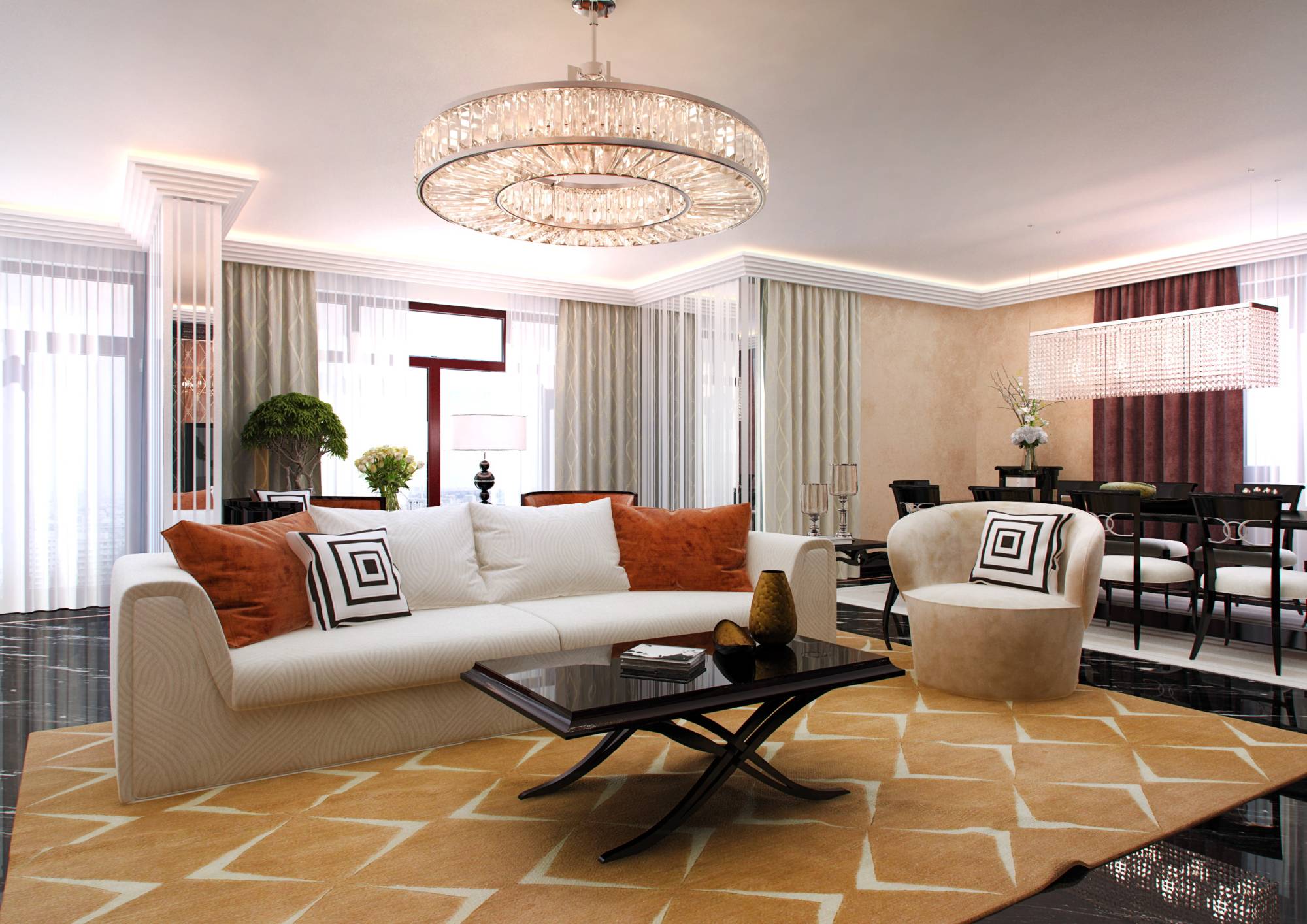 В зоне гостиной светлые диван и кресла, светильник округлой формы. Связующие цвета: с зоной бара – ореховые подушки и кресла, с зоной столовой – черный журнальный столик.