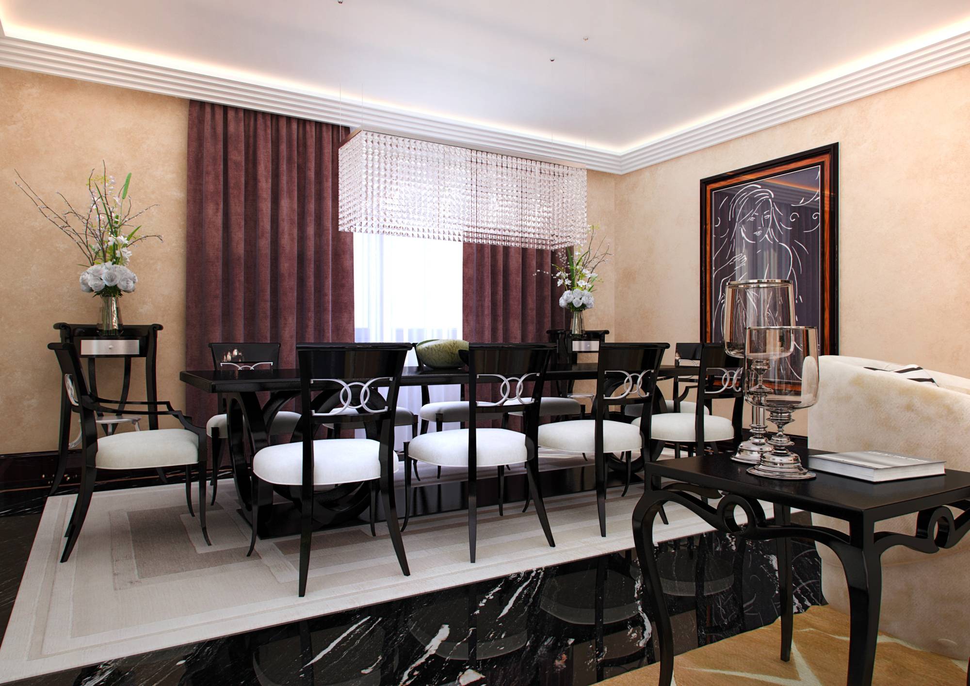 Гостиная условно разделена на зоны. Бар, столовая и собственно гостиная различаются стилистикой мебели и светильников.