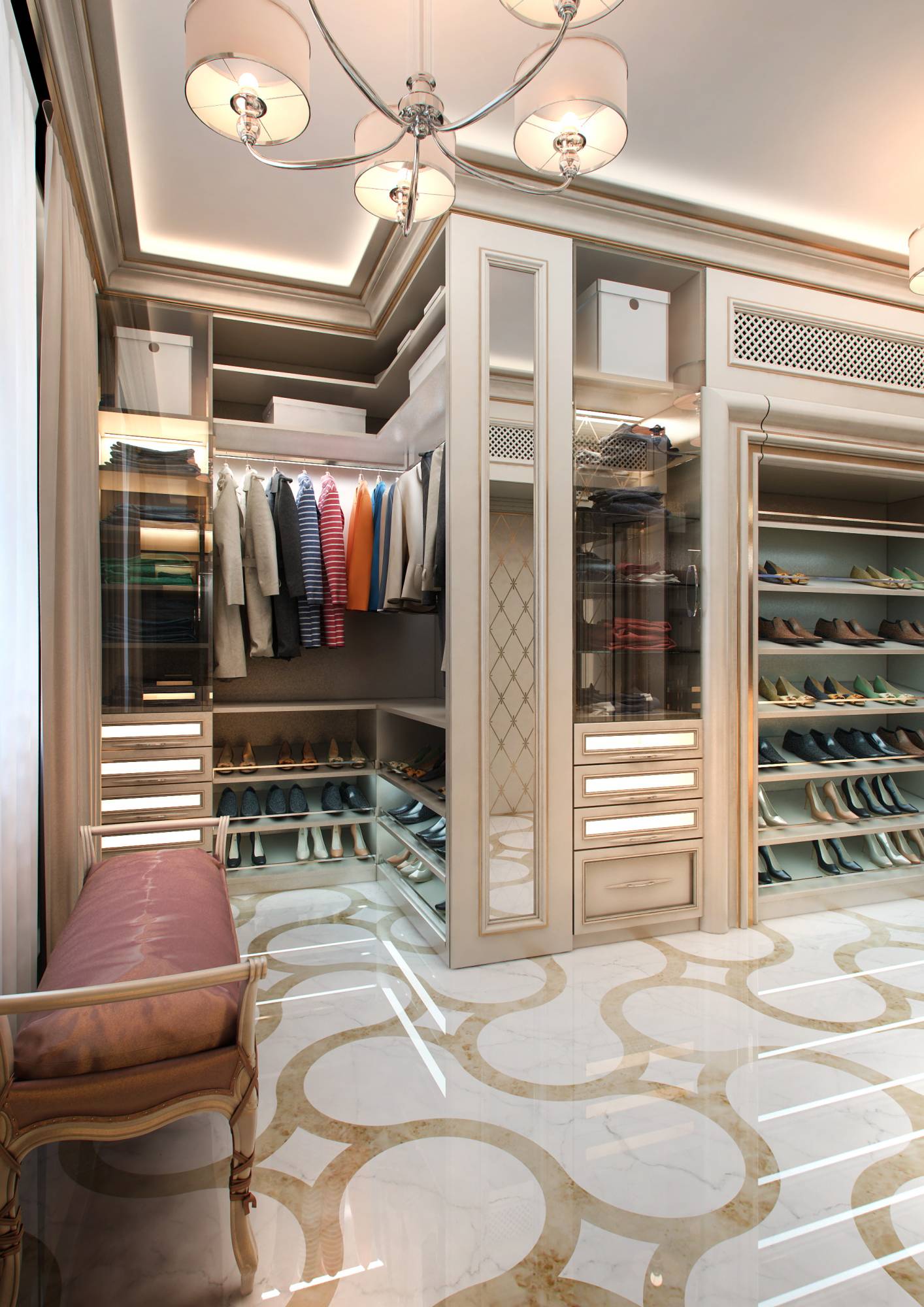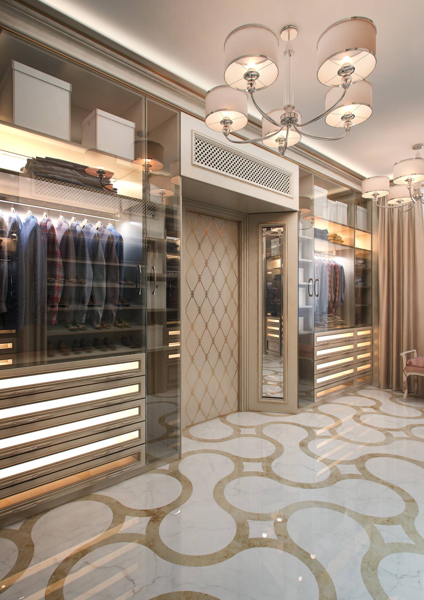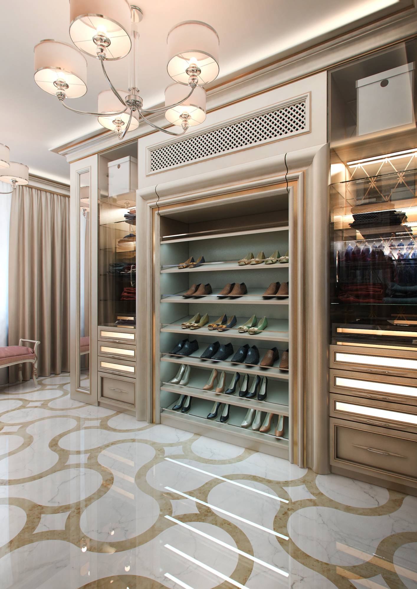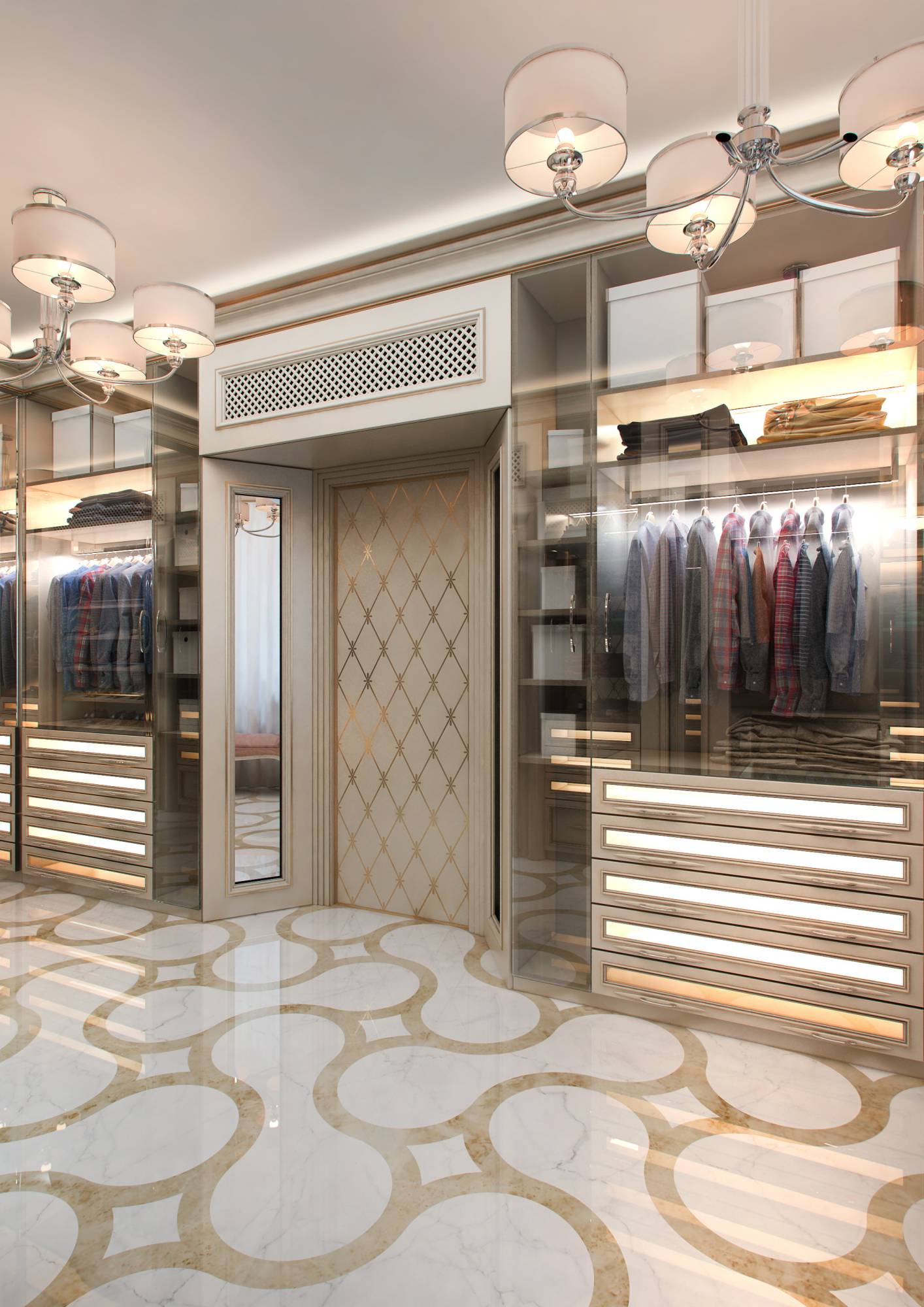 Поскольку пространство квартиры позволяет – была создана элегантная гардеробная с отдельными зонами «для нее» и «для него».